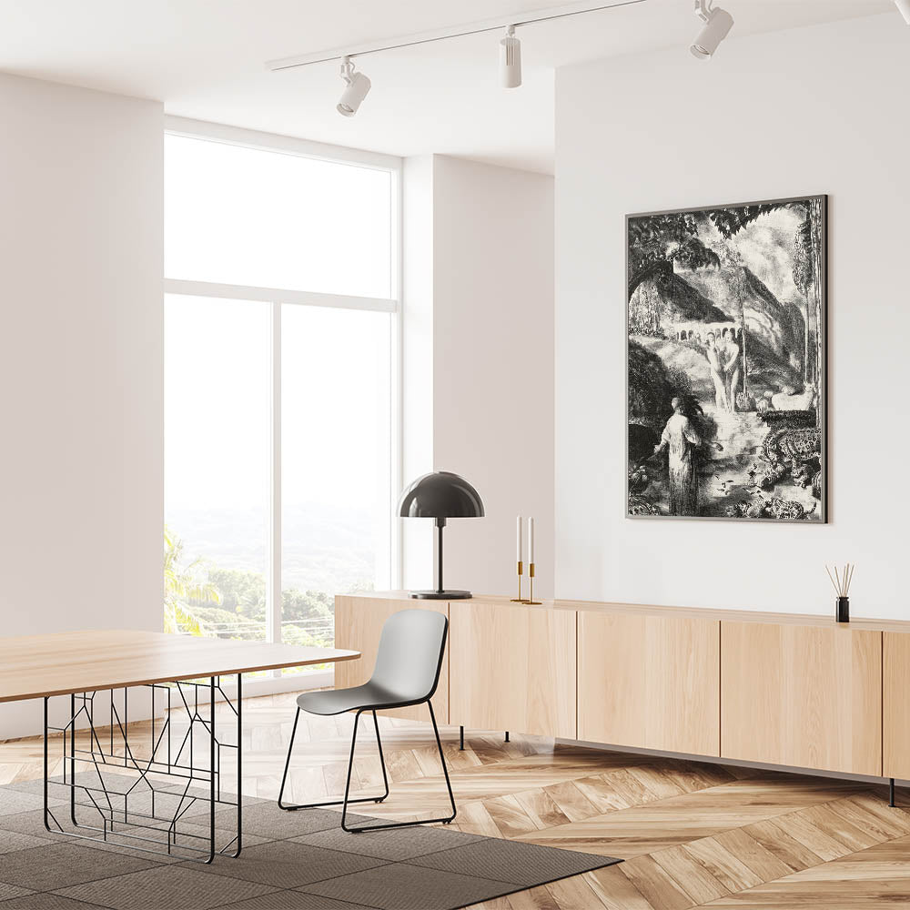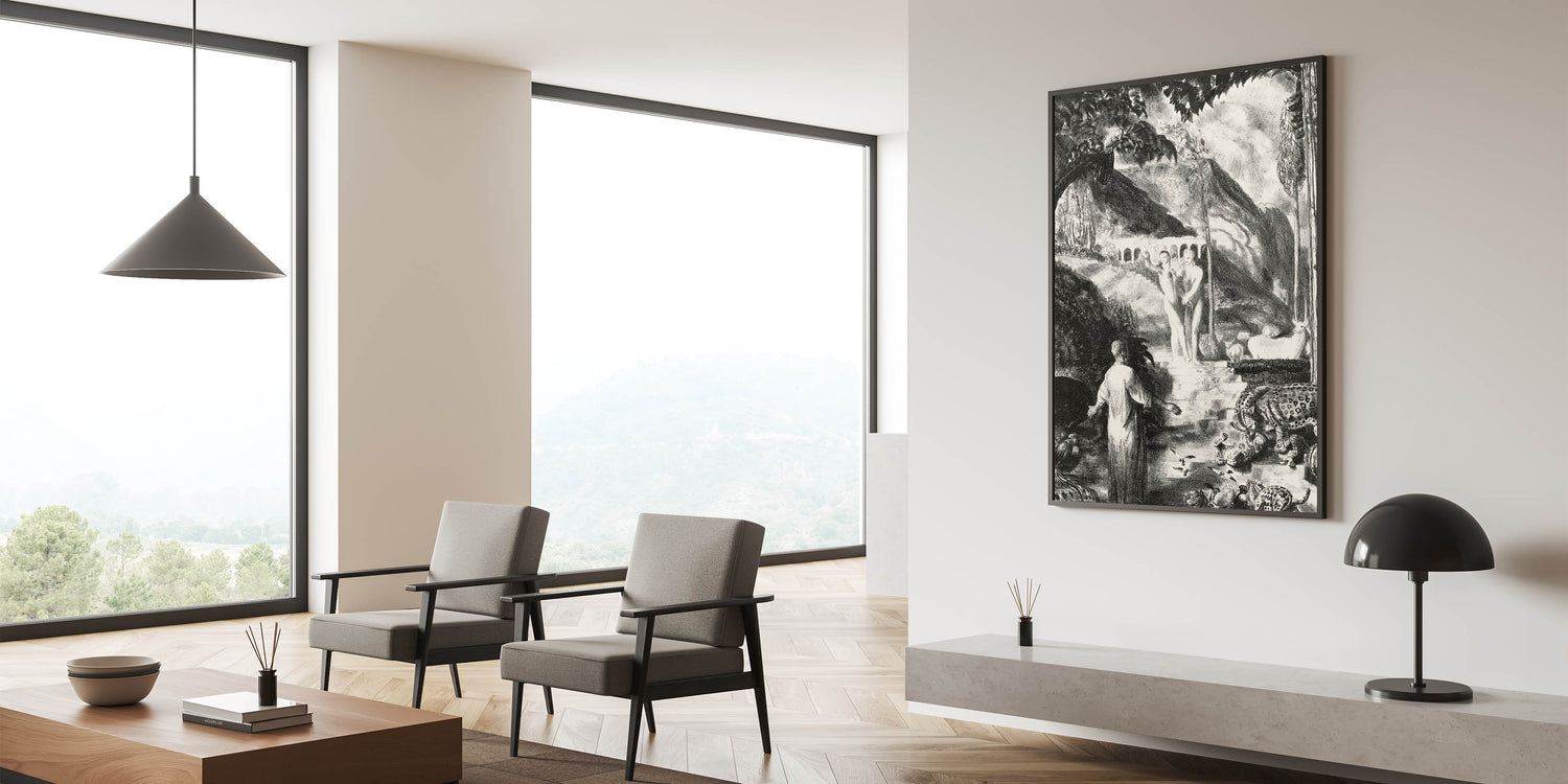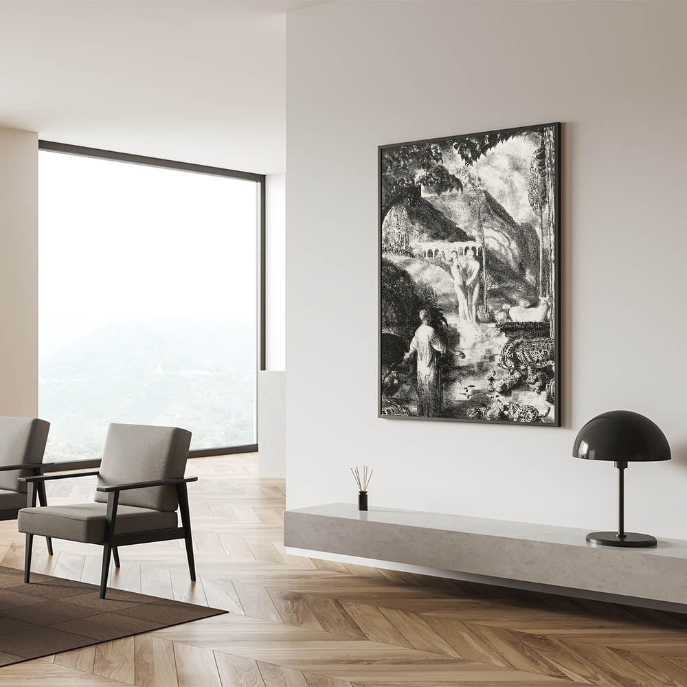 Elevate your interior with the "Farewell to Utopia Modern Wall Art," a striking monochromatic depiction of a dreamlike landscape. This timeless artwork masterfully combines intricate details of nature, wildlife, and human figures in a surreal composition. Perfect for lovers of minimalist modern decor, this piece invites reflection and conversation, making it an ideal choice for those seeking unique modern art with historical charm.