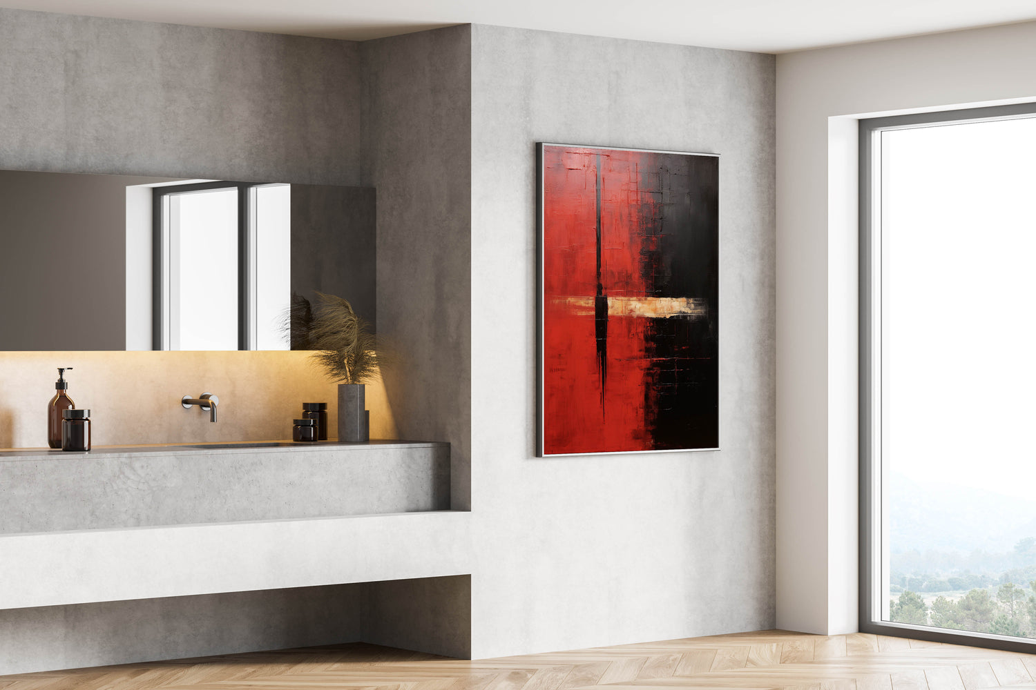 This bold abstract strokes art piece is designed to make a statement in any space. Its striking red and black palette, combined with the strong geometric design, adds a sense of power and energy to your decor. Perfect for those who appreciate dramatic and contemporary art.