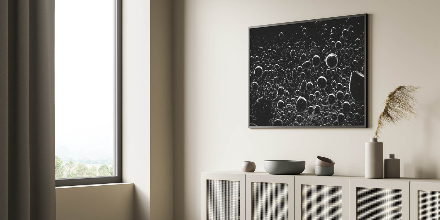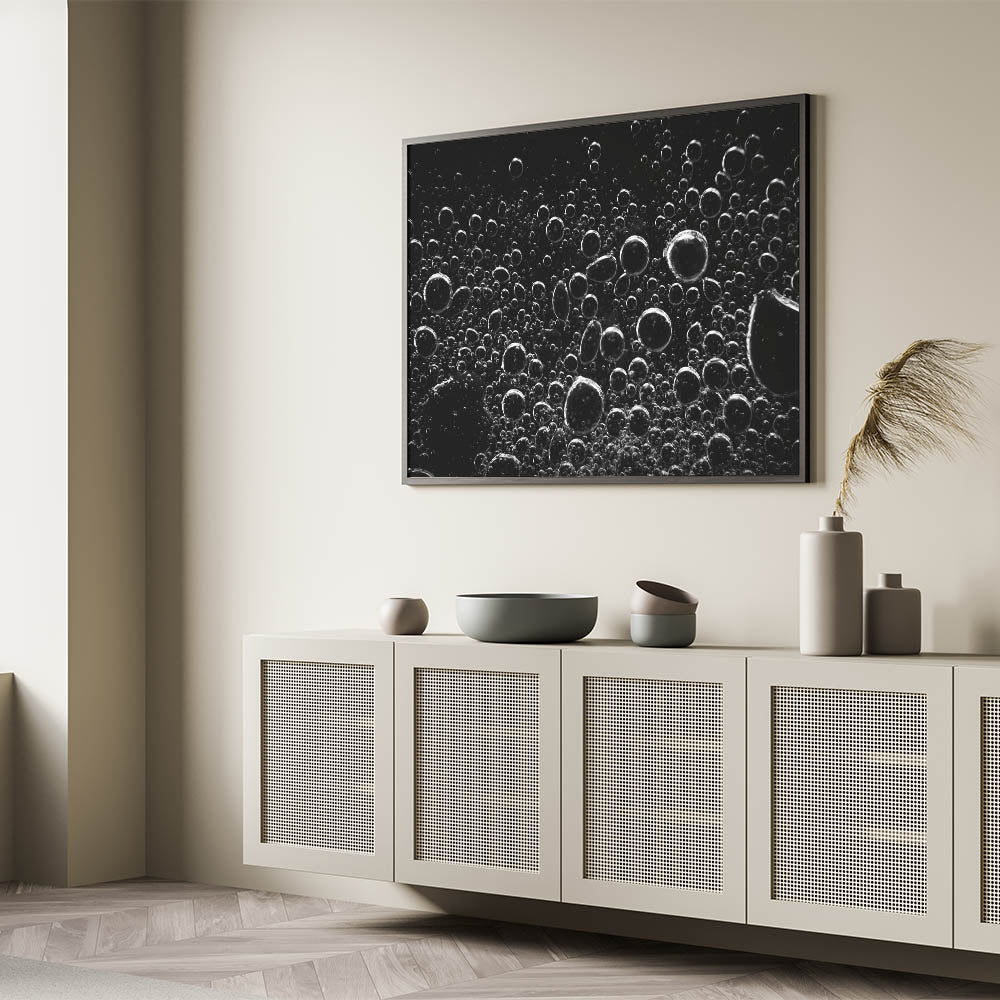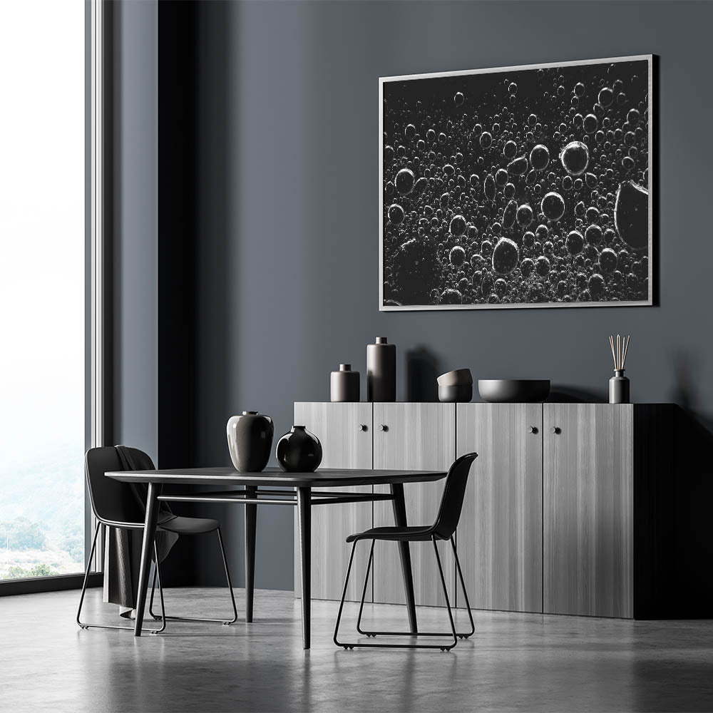 Add a dramatic visual experience to your space with this high-contrast abstract photography piece. Capturing a swarm of translucent bubbles suspended in motion, the composition plays with light, texture, and shadow against a deep black backdrop. The result is a surreal, almost galactic atmosphere that evokes both fluidity and structure.