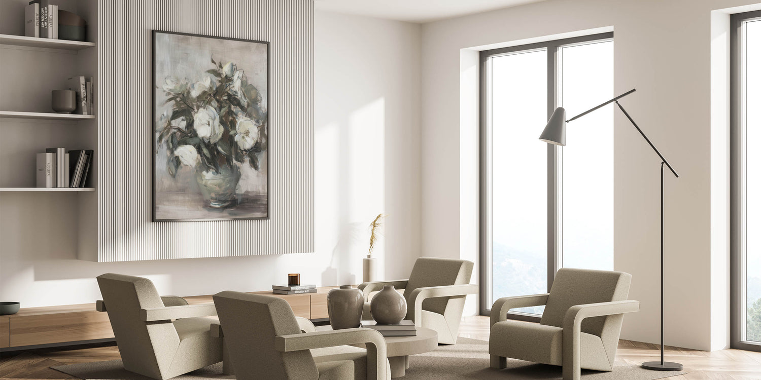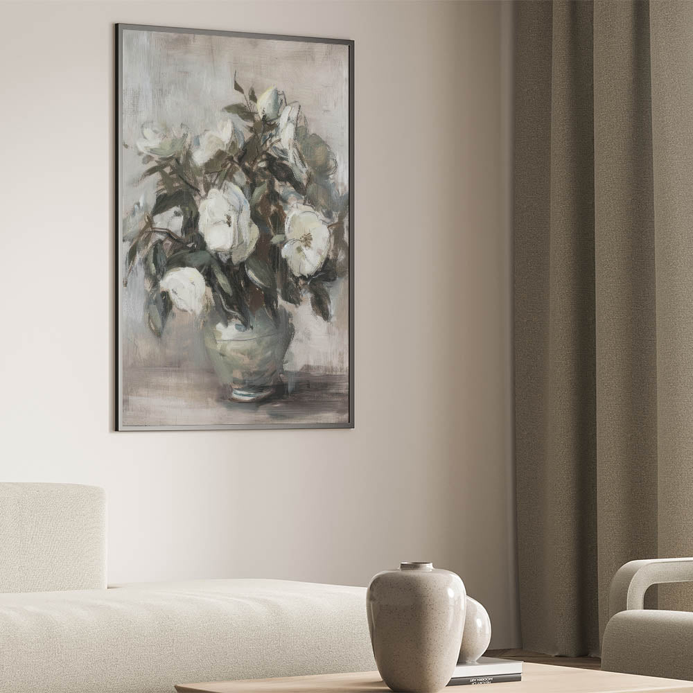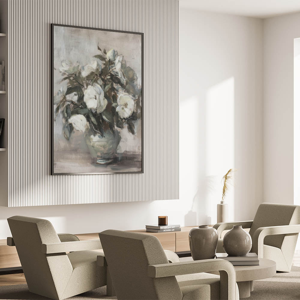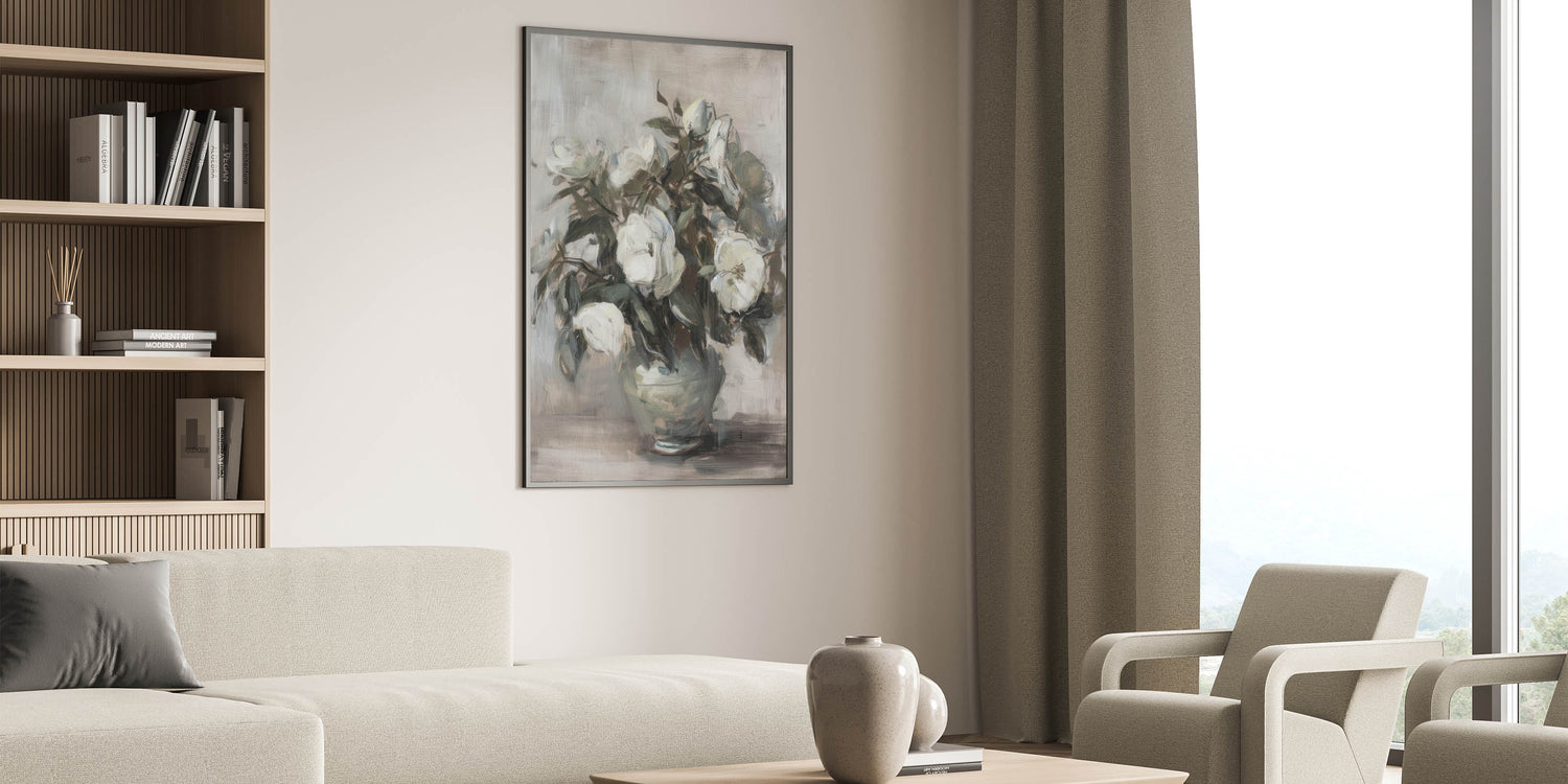 Enhance your interior with this timeless floral abstract artwork featuring a serene arrangement of white roses. The muted tones and soft brushstrokes create an atmosphere of elegance and sophistication, making it a perfect addition to any modern or minimalist décor. This artwork’s calming palette blends effortlessly into living rooms, bedrooms, or office spaces, adding a touch of refined beauty.