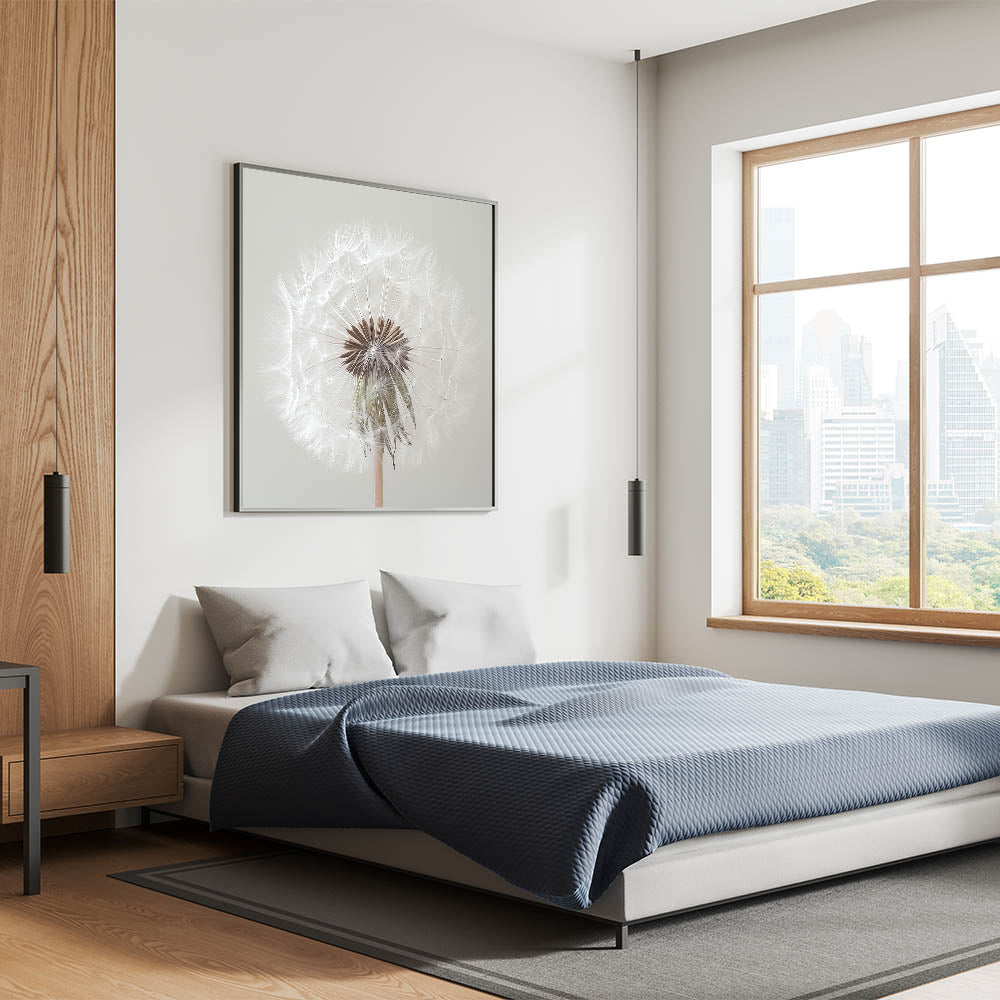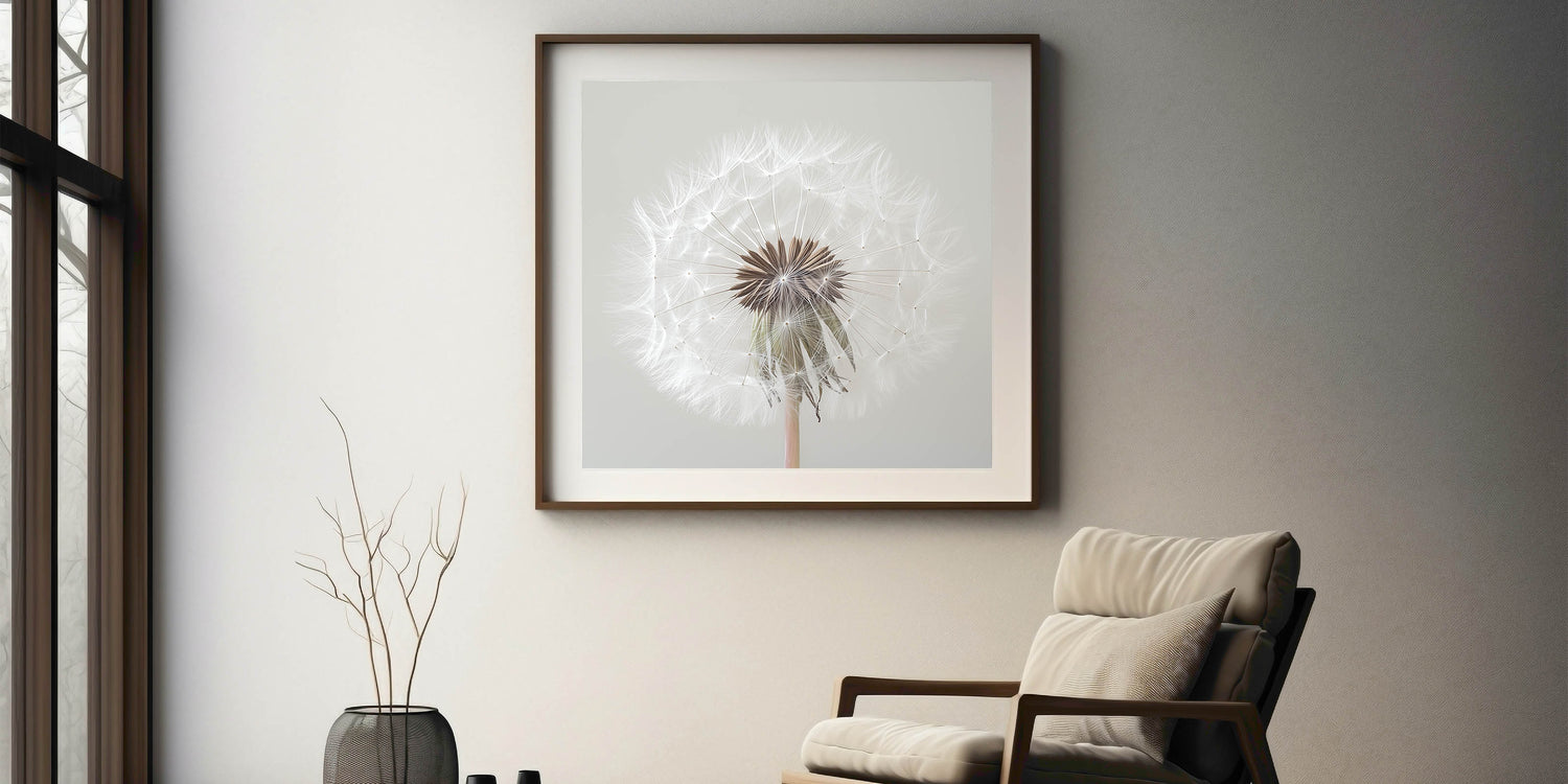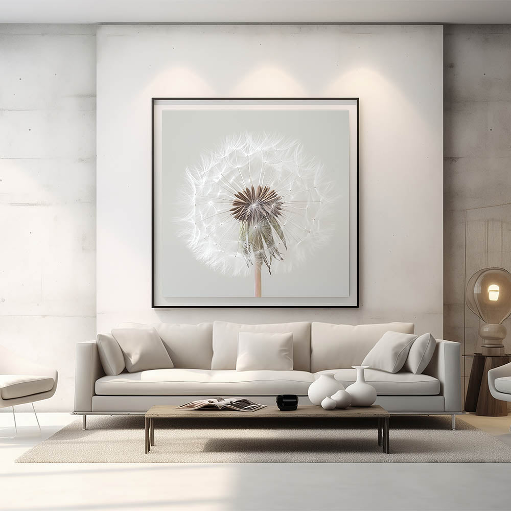 Add a touch of serenity to your home with this exquisite floral photography print showcasing a close-up view of a delicate white dandelion. Capturing every intricate detail, this artwork embodies nature's simplicity and elegance, making it the perfect addition to any room.