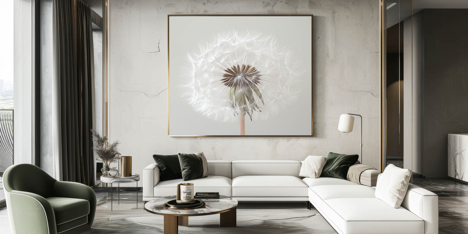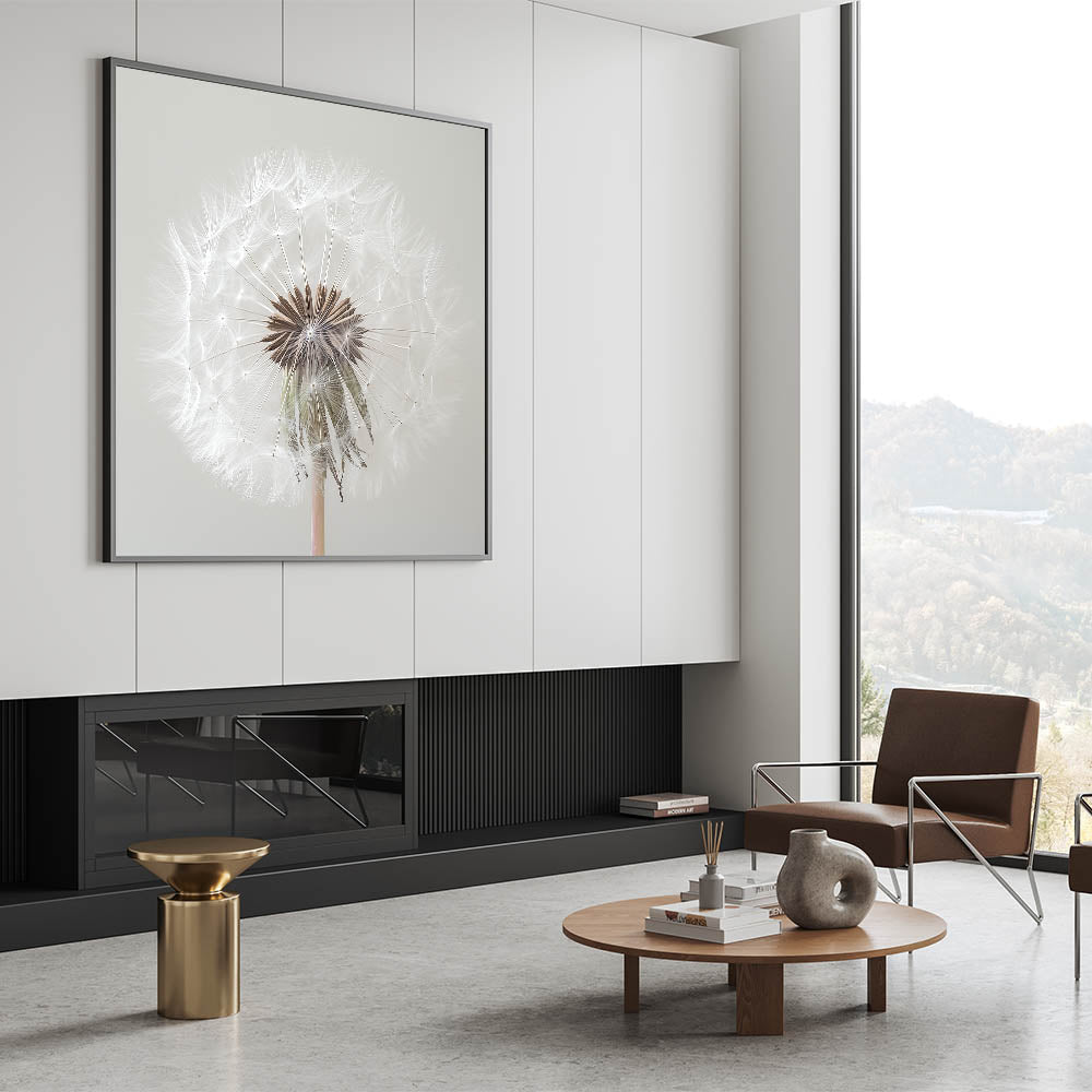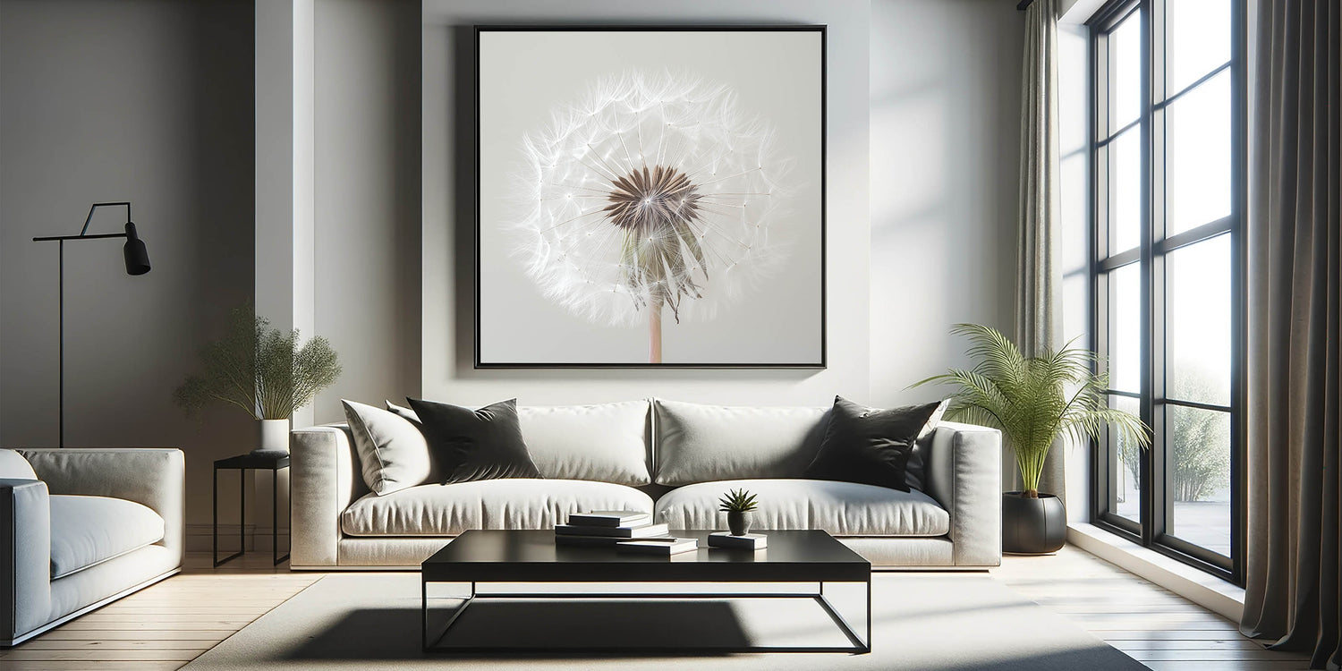 Add a touch of serenity to your home with this exquisite floral photography print showcasing a close-up view of a delicate white dandelion. Capturing every intricate detail, this artwork embodies nature's simplicity and elegance, making it the perfect addition to any room.