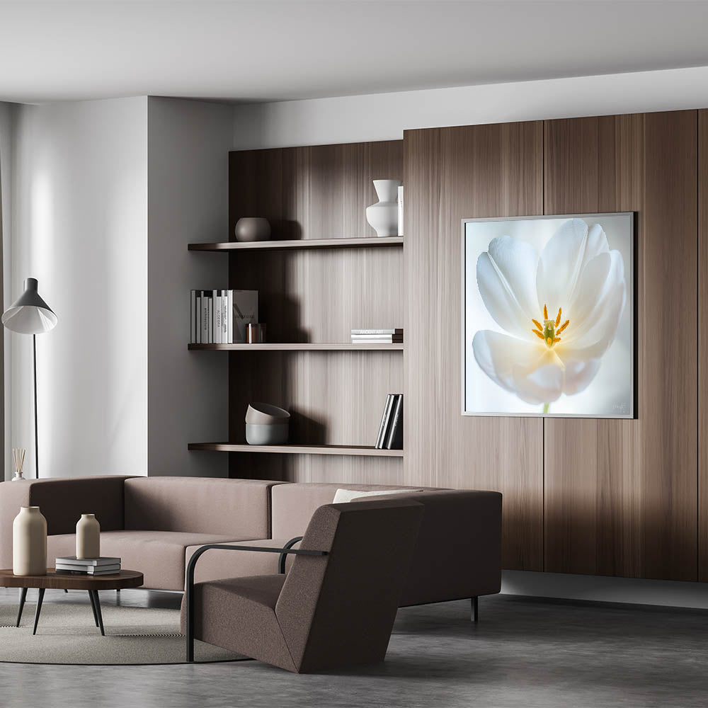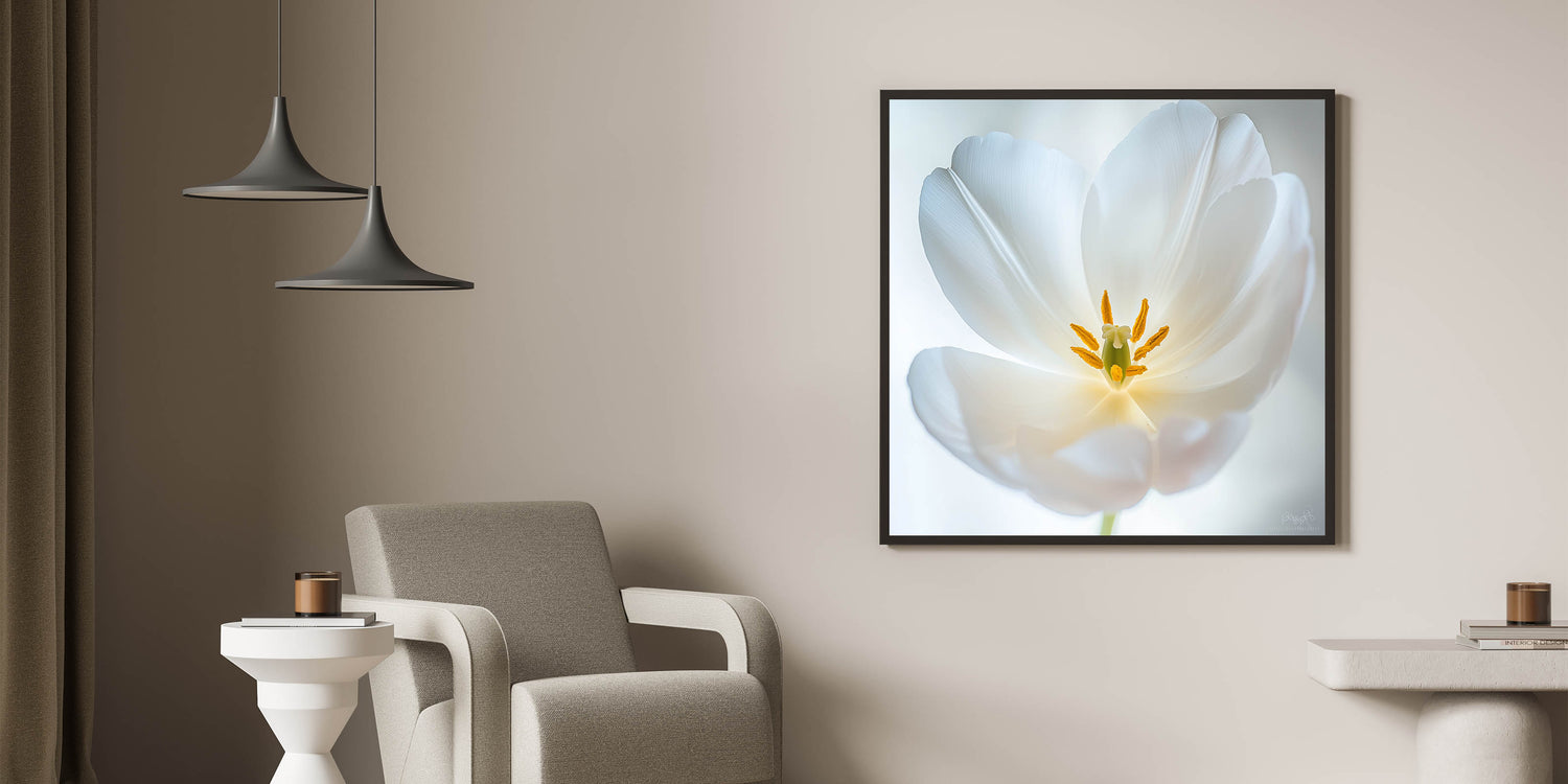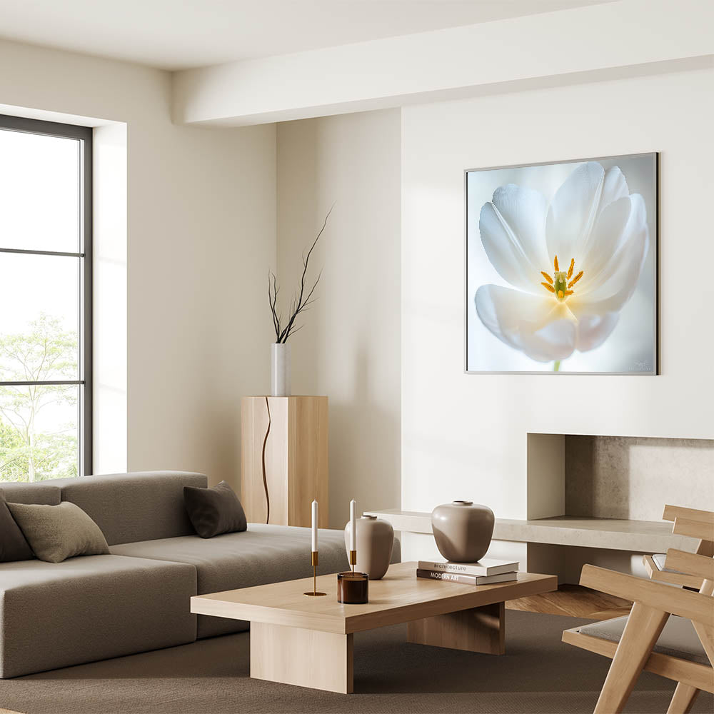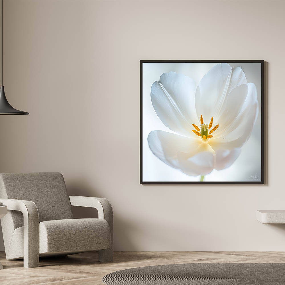 Bring a sense of purity and elegance to your home with this exquisite floral wall art, showcasing a close-up of a delicate white tulip. The soft petals and subtle yellow accents create a serene and timeless piece that complements any interior design style, from modern minimalism to classic decor.