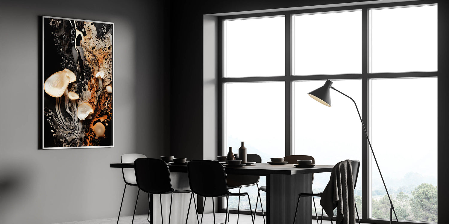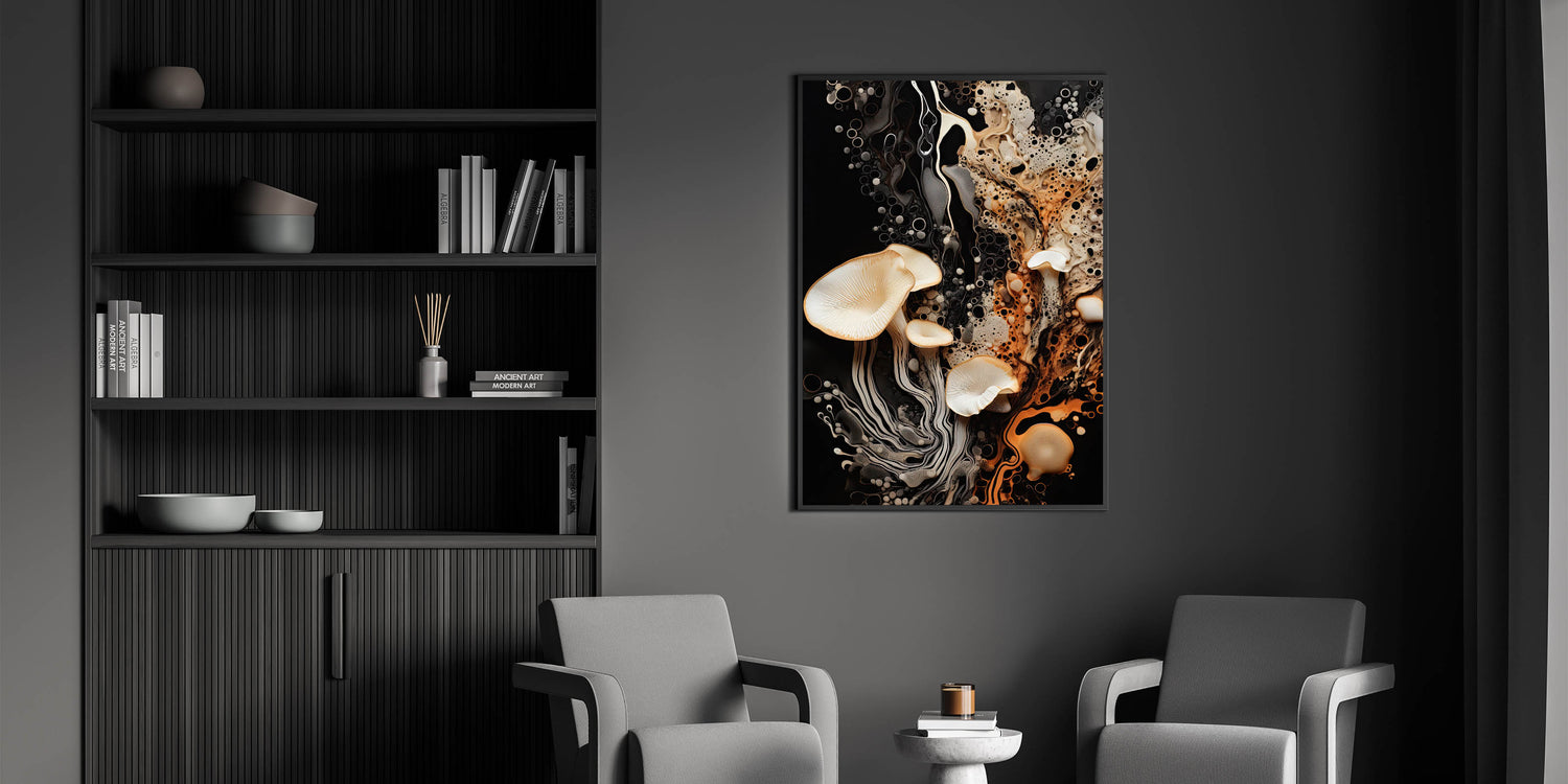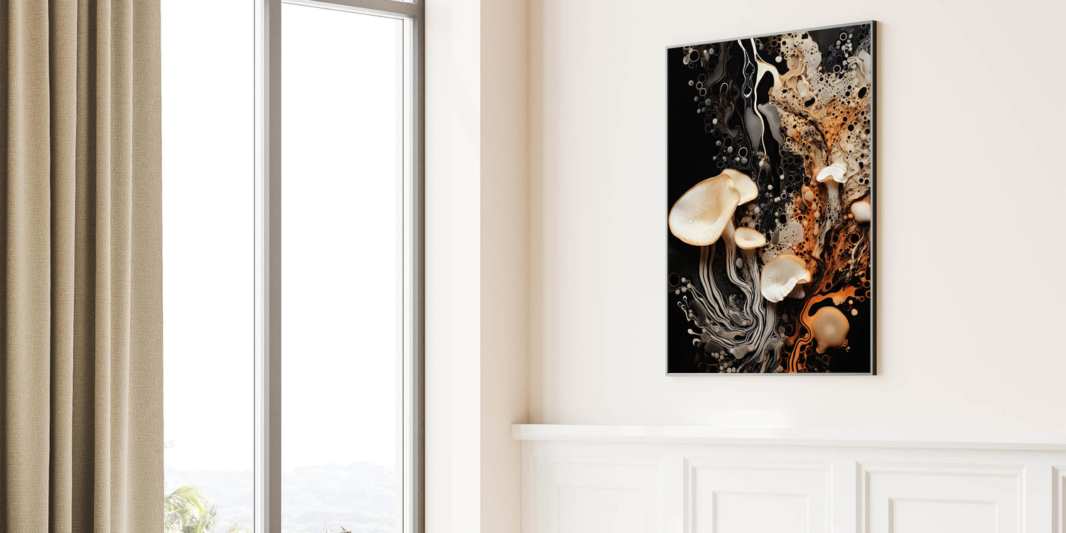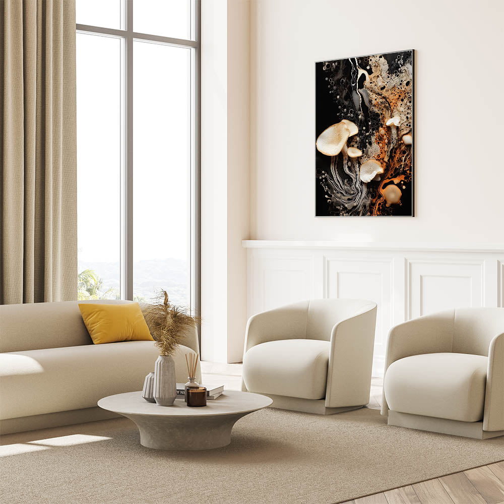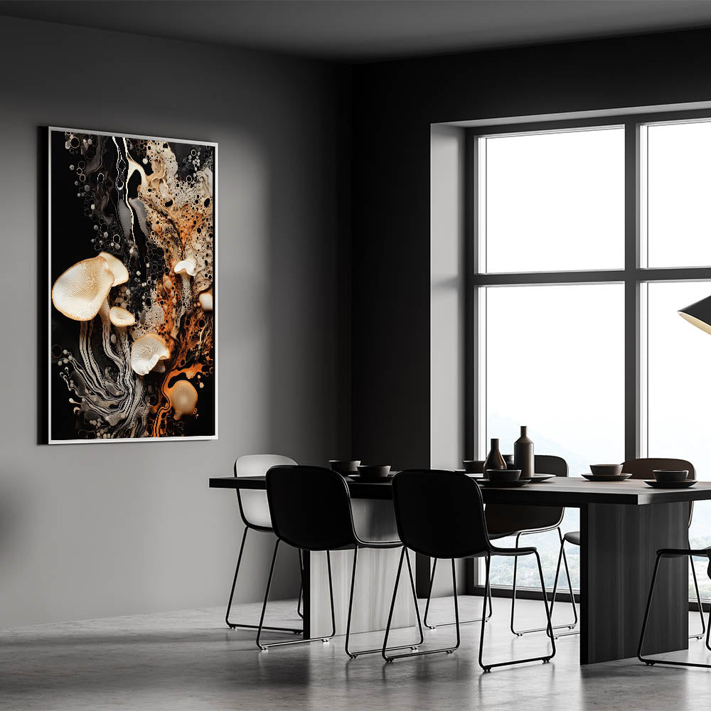Elevate your decor with this striking mushroom macro wall art, a stunning blend of natural elegance and dynamic textures. Featuring high-resolution photography, this artwork showcases delicate mushrooms with flowing organic patterns set against a bold black background. The vibrant interplay of warm orange, soft cream, and rich black hues creates a sophisticated, eye-catching design perfect for modern interiors.