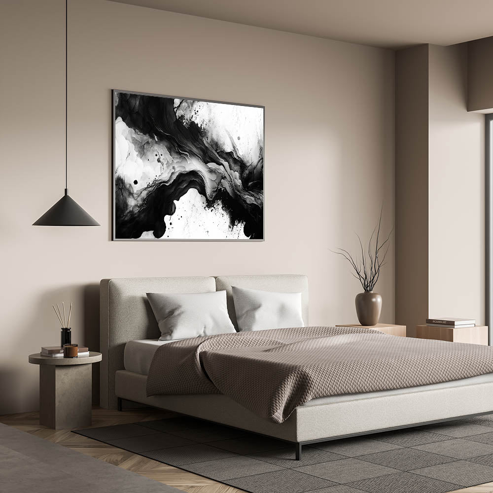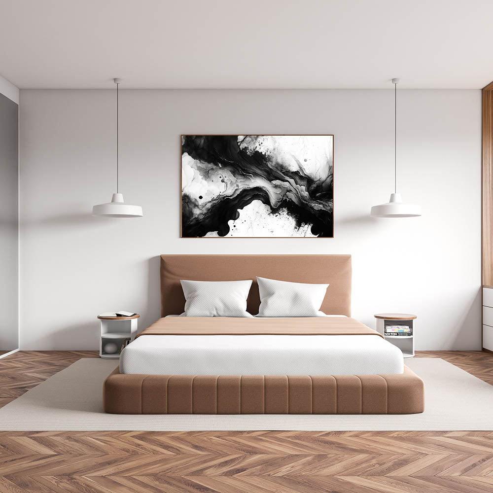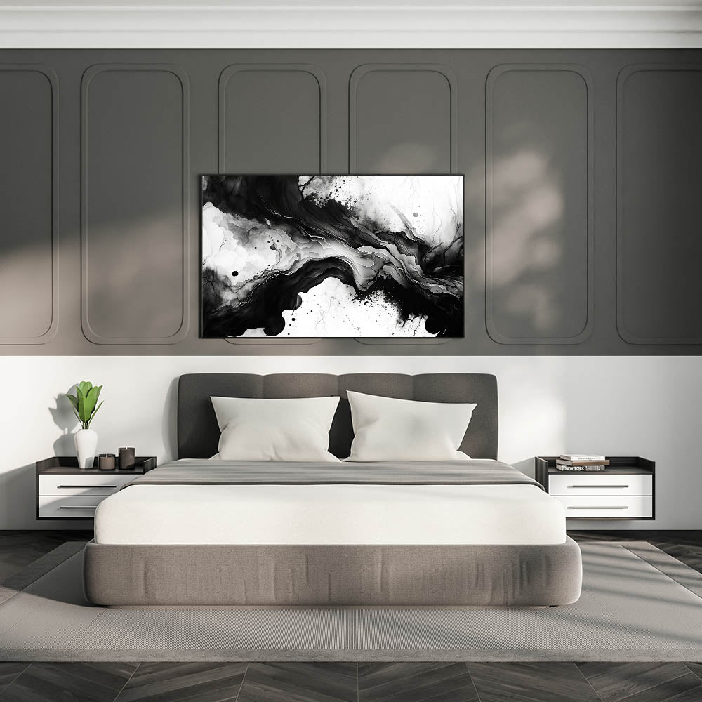 Create a bold and sophisticated atmosphere in your bedroom with this fluid black and white abstract wall art. The organic, flowing design mimics natural textures like ink in water or swirling marble, making it an eye-catching piece for modern bedroom wall decor. The balance between deep blacks and crisp whites adds depth and elegance, perfect for a contemporary or minimalist interior.
