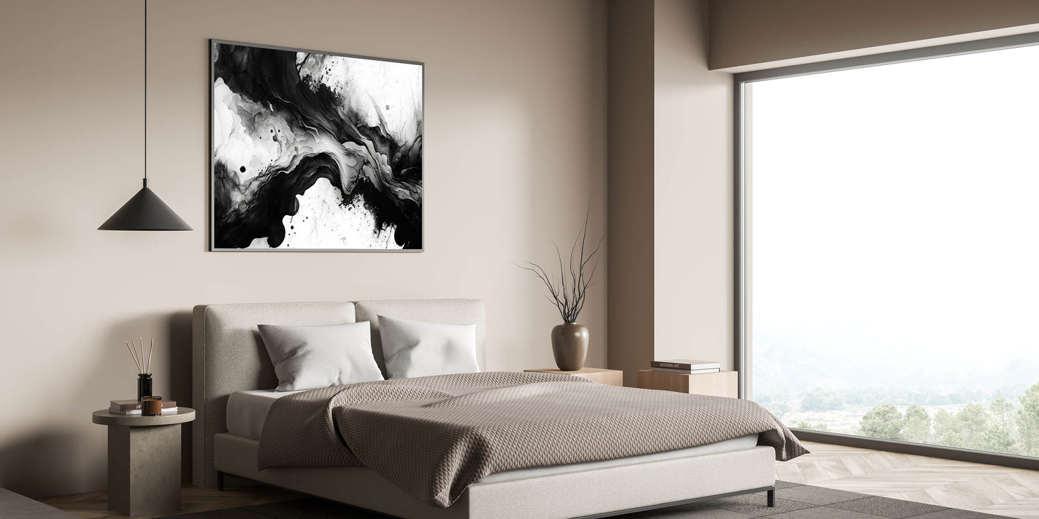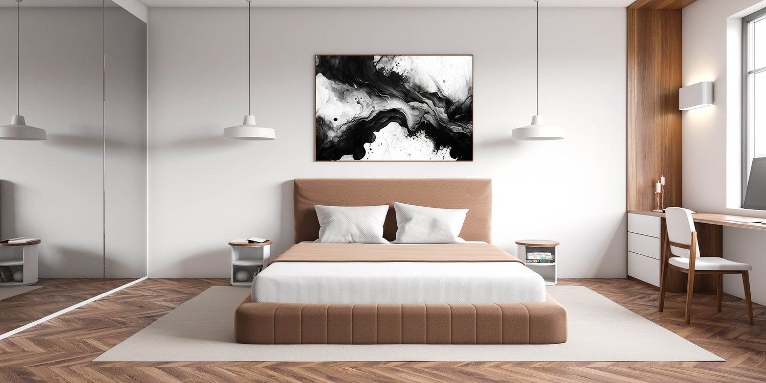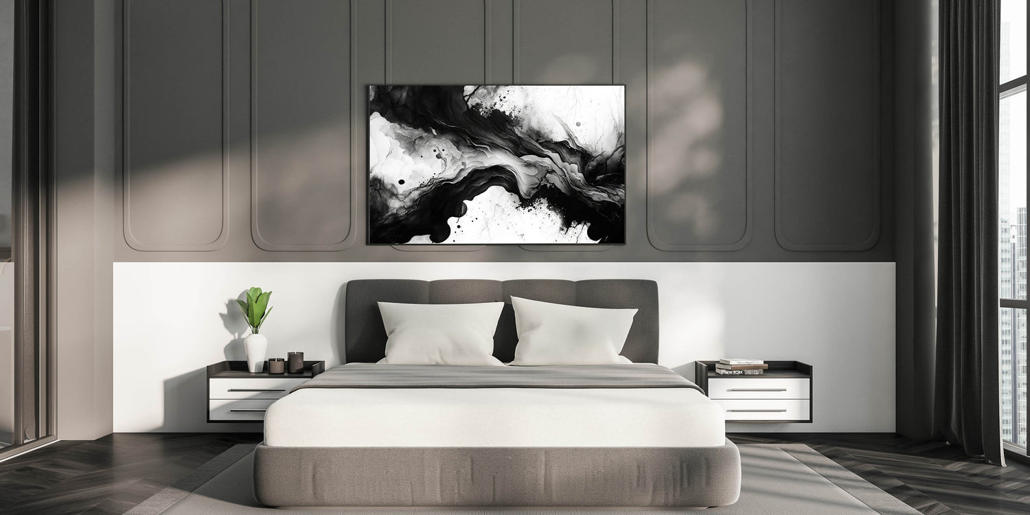 Create a bold and sophisticated atmosphere in your bedroom with this fluid black and white abstract wall art. The organic, flowing design mimics natural textures like ink in water or swirling marble, making it an eye-catching piece for modern bedroom wall decor. The balance between deep blacks and crisp whites adds depth and elegance, perfect for a contemporary or minimalist interior.