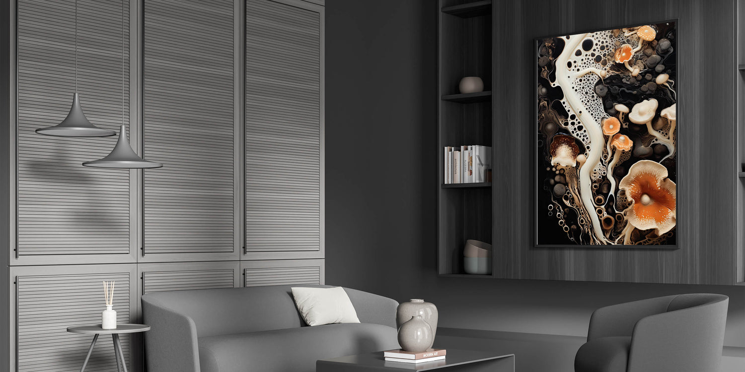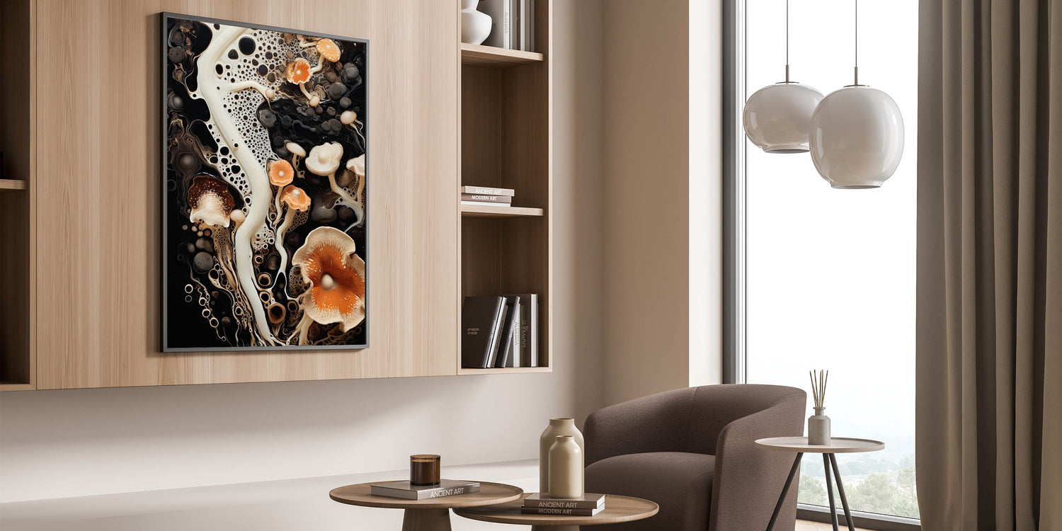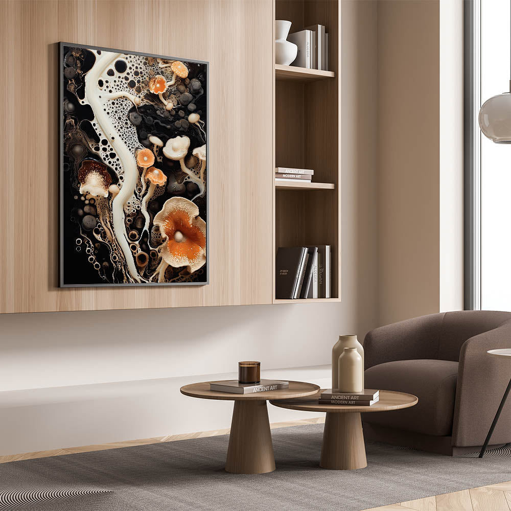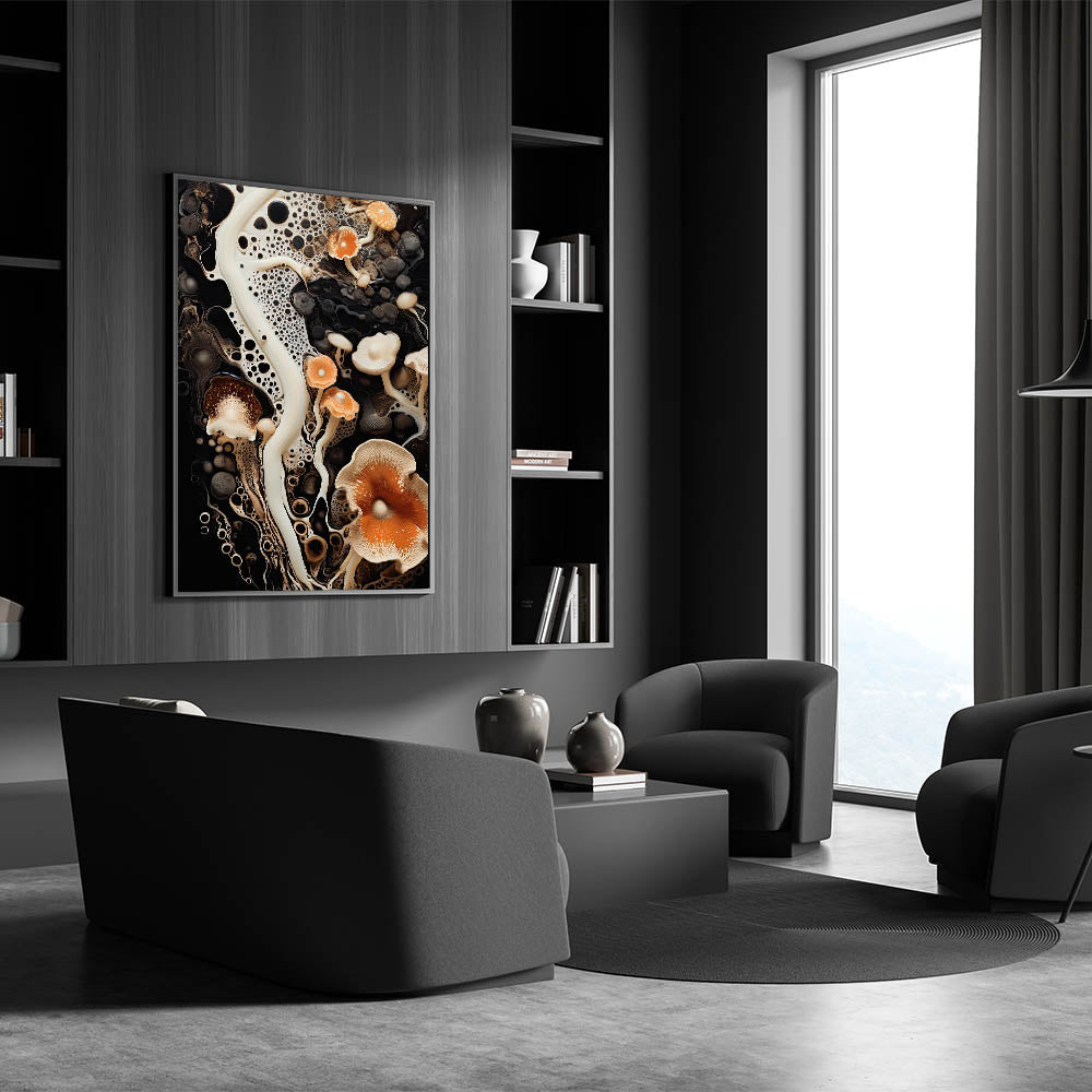 Add a dynamic touch of nature to your home with this fluid mushroom macro wall art. This unique piece showcases a closeup of mushrooms intertwined with abstract, creamy streams against a bold black background. The warm shades of peach and orange blend seamlessly with soft cream tones, creating a harmonious contrast that draws the viewer in. It’s a captivating artwork that beautifully highlights nature’s organic forms with a modern, abstract twist.
