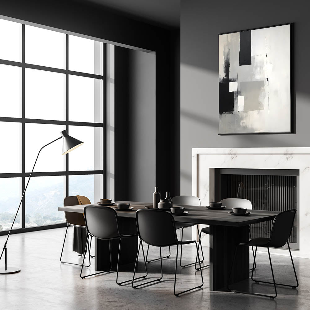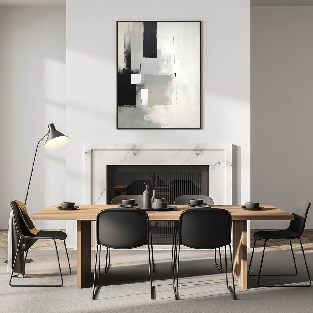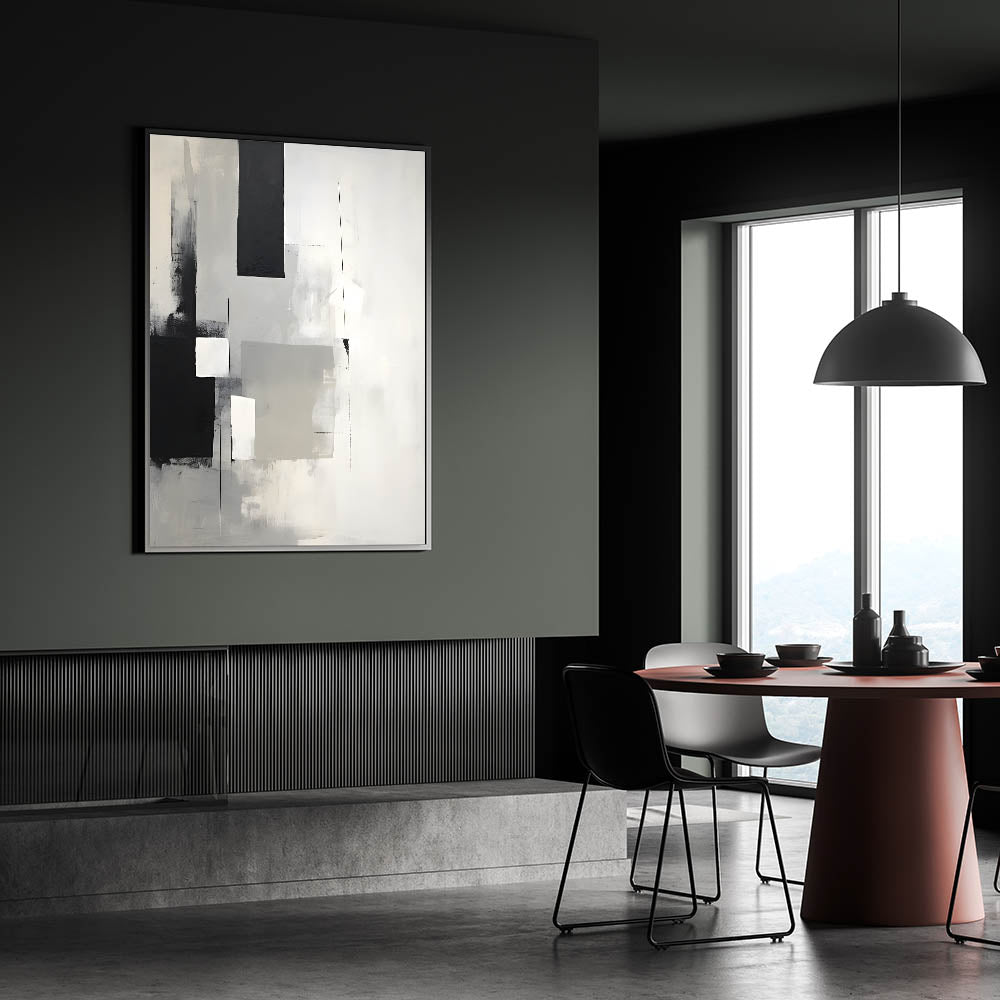 Transform your dining space with this framed and canvas dining room art, featuring a modern black, white, and gray abstract composition. The bold contrast and geometric balance make this artwork a sophisticated centerpiece, ideal for contemporary dining room wall decor.
