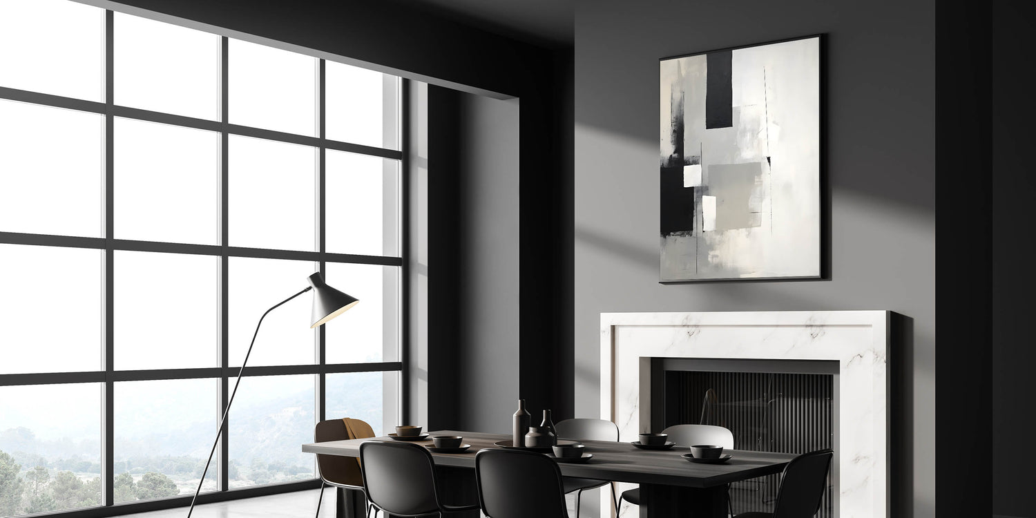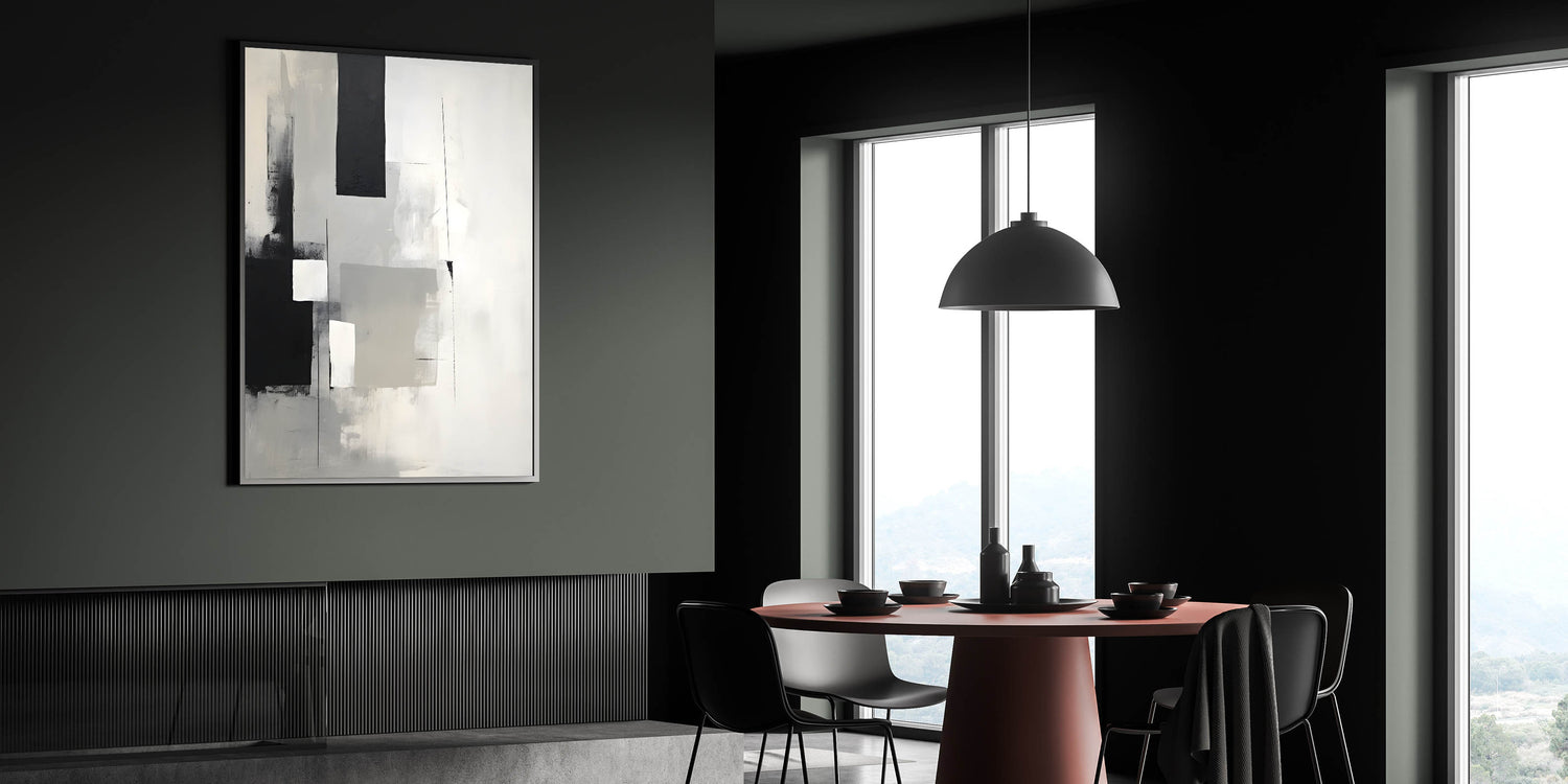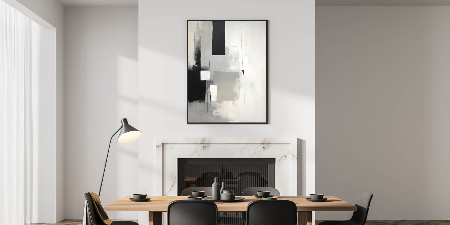 Transform your dining space with this framed and canvas dining room art, featuring a modern black, white, and gray abstract composition. The bold contrast and geometric balance make this artwork a sophisticated centerpiece, ideal for contemporary dining room wall decor.
