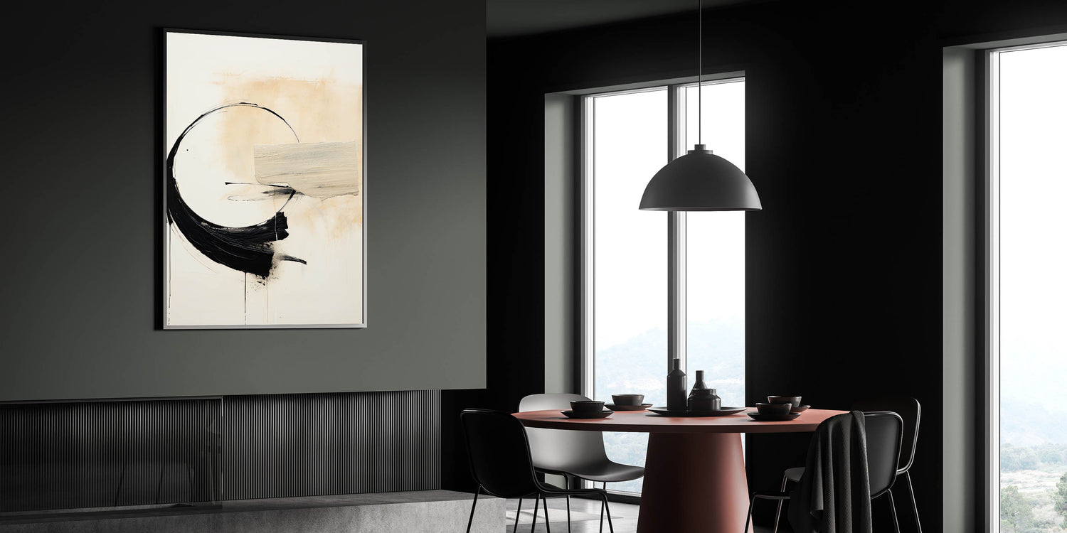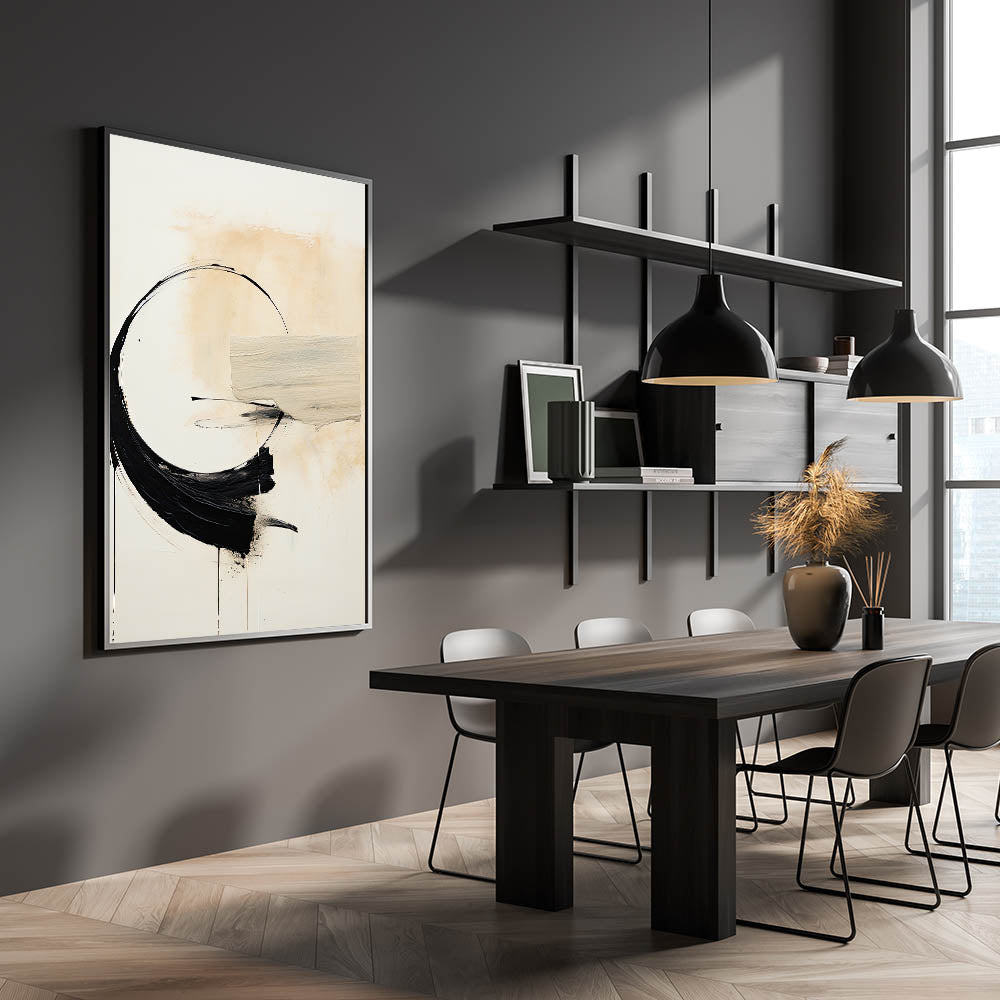 Add a sophisticated touch to your dining space with this framed art for dining spaces, featuring a dynamic black brushstroke against a soft beige and white backdrop. The fluid abstract design creates a modern yet timeless aesthetic, making it a perfect addition to elegant dining room wall art collections. Whether showcased as canvas art for dining areas or acrylic dining room artwork, this piece enhances contemporary interiors with its refined simplicity.