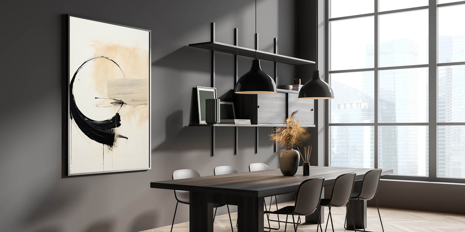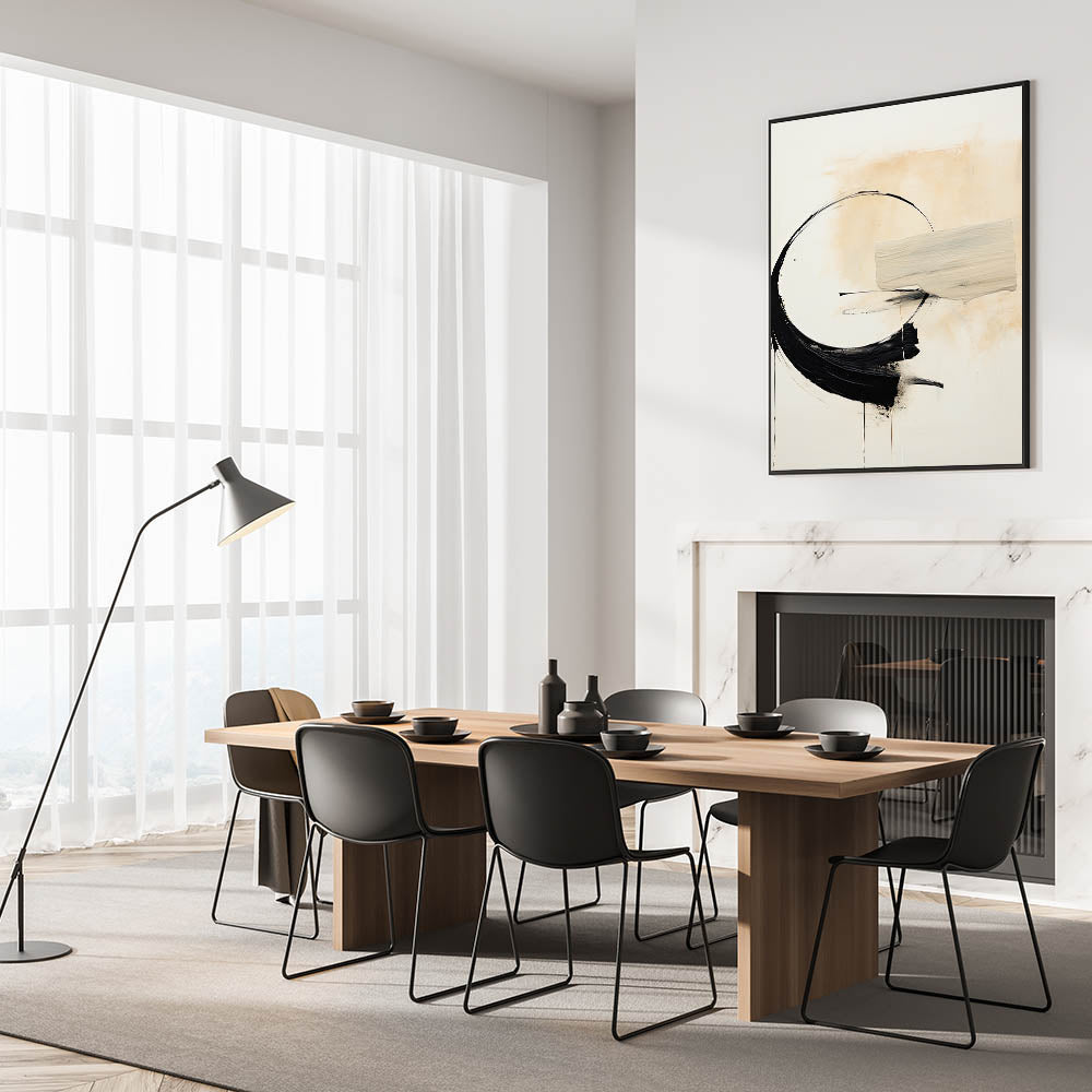 This modern dining room art is ideal for those seeking a minimalist yet impactful design. Whether you prefer rolled canvas prints for a dining area or a premium framed print, this abstract composition brings depth and movement to your space.