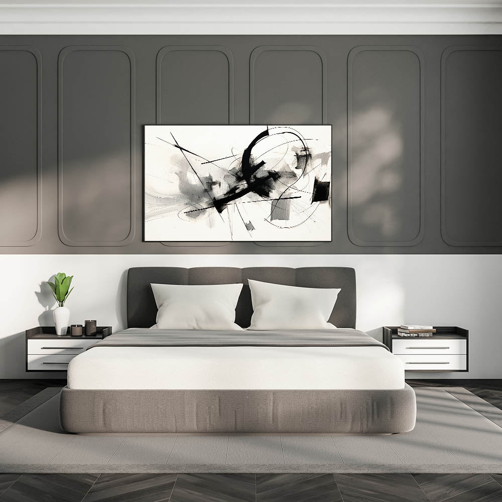 Elevate your bedroom with this high-quality framed canvas print, featuring a black and white abstract expressionist composition. The bold, sweeping strokes and dynamic geometric forms create a sense of movement and intensity, making it a perfect addition to modern bedroom art collections.