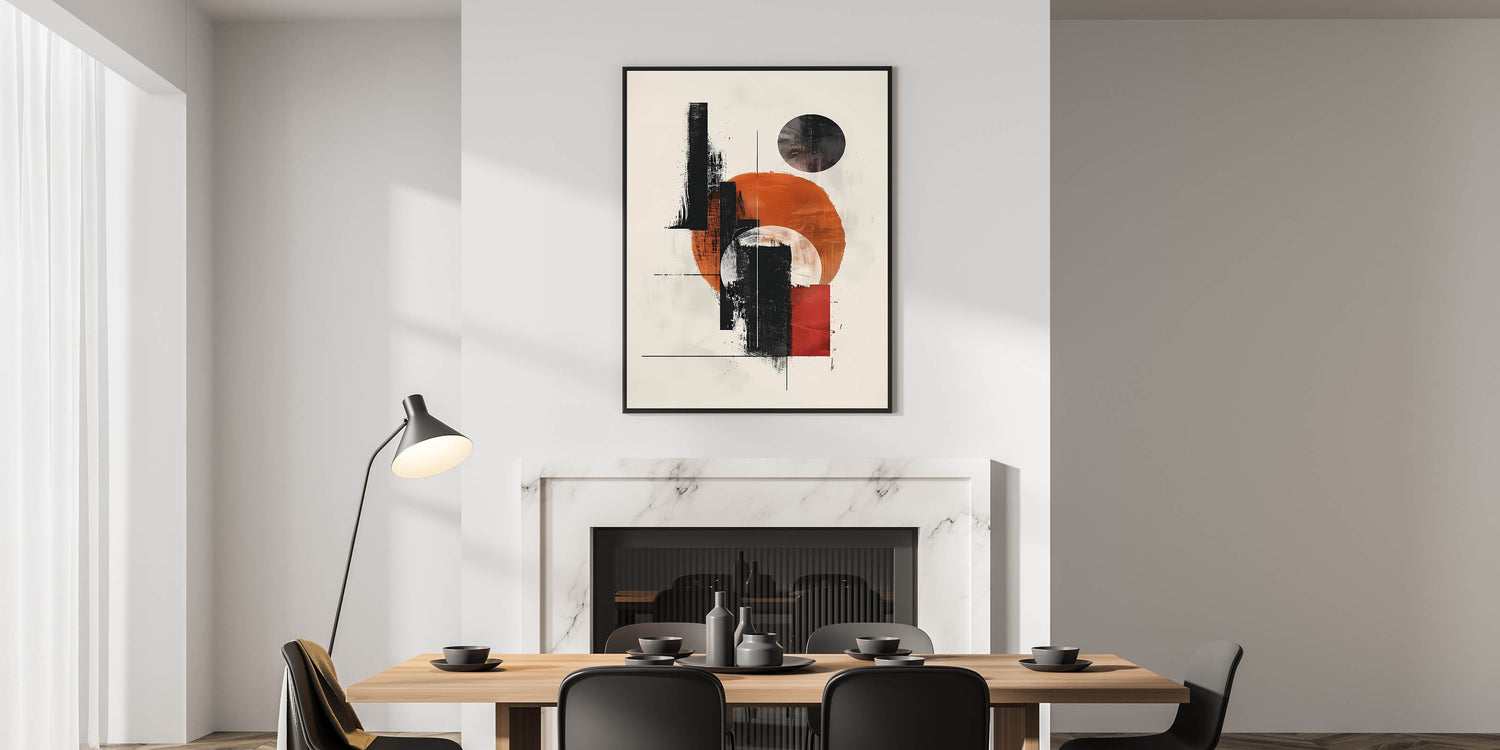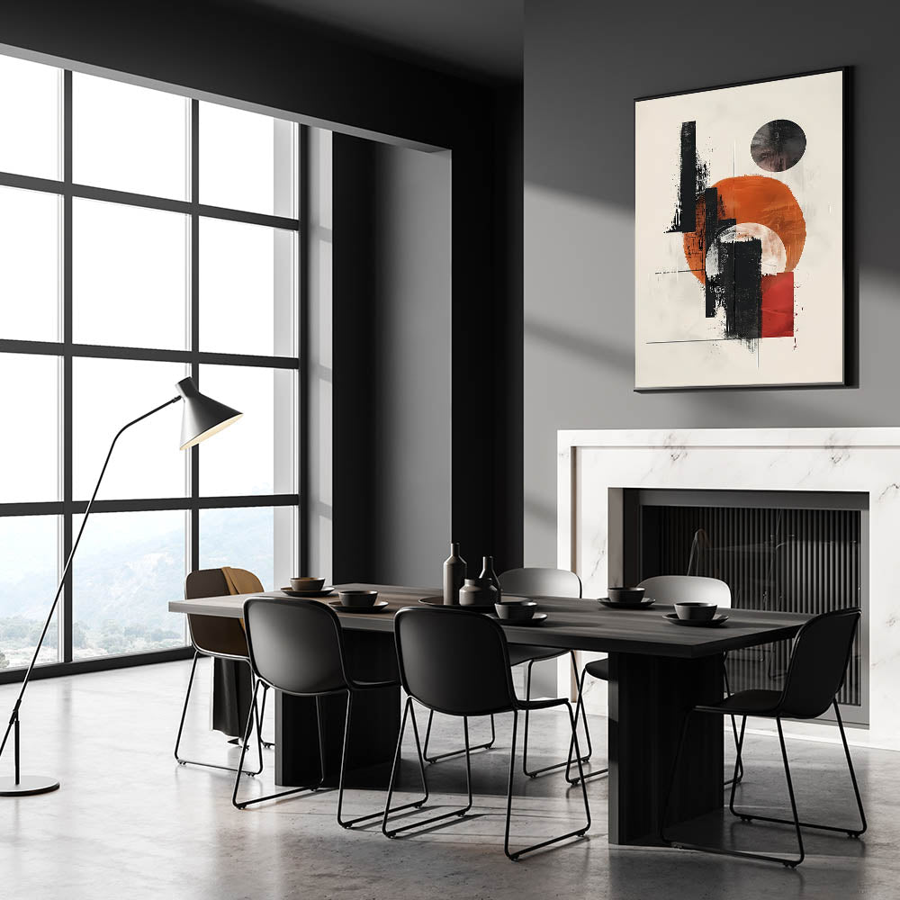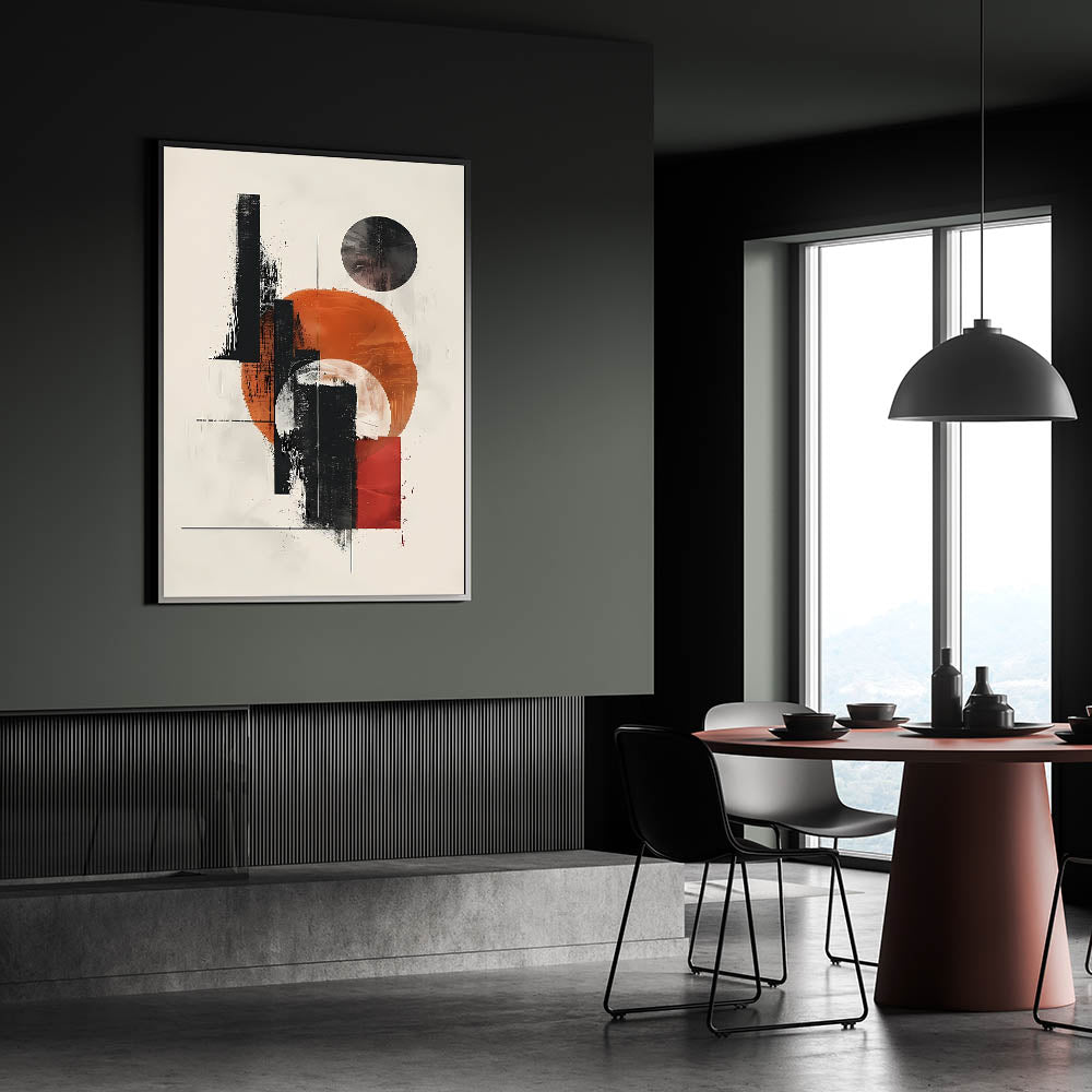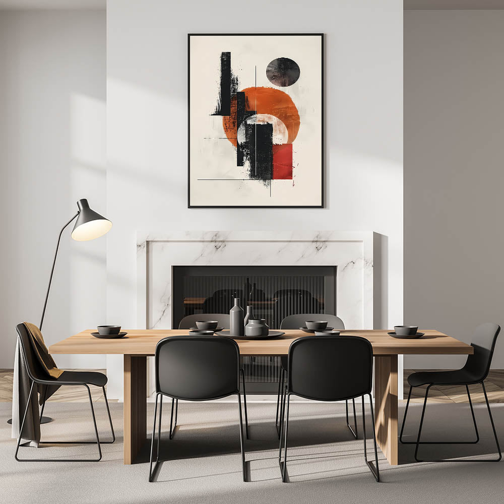 Add a bold and stylish touch to your dining space with this framed dining room print, featuring a striking combination of black, beige, orange, and red geometric shapes. The abstract design blends structured lines with artistic brushstrokes, making it a stunning canvas art for dining areas that complements modern interiors.