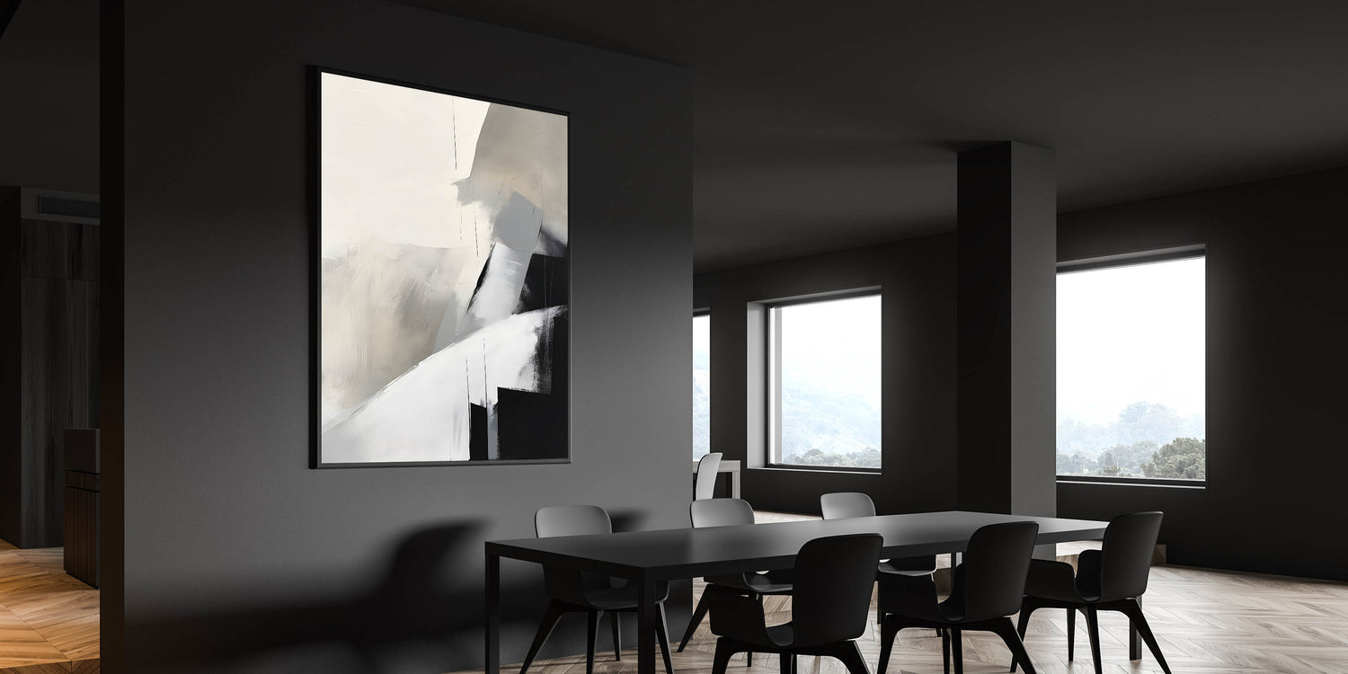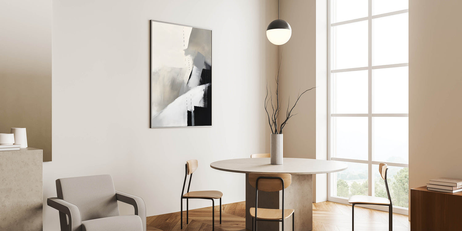 Elevate your dining space with this framed dining room print, featuring a stunning abstract composition in neutral tones of black, gray, and beige. The soft, blended textures and bold geometric elements create a modern dining area art piece, perfect for contemporary interiors. This artwork is available in high-quality canvas art for dining rooms, framed prints, and acrylic glass art for dining room walls, ensuring a versatile and stylish fit for your décor.
