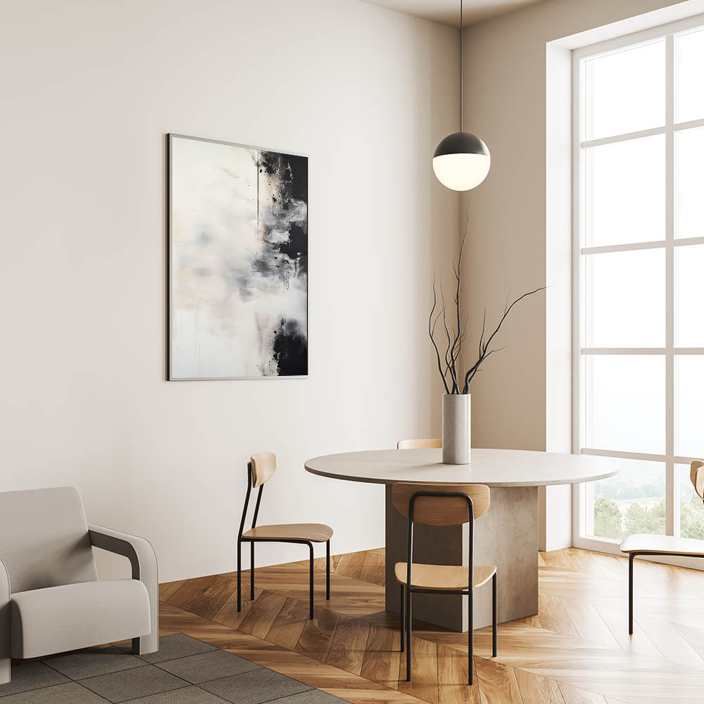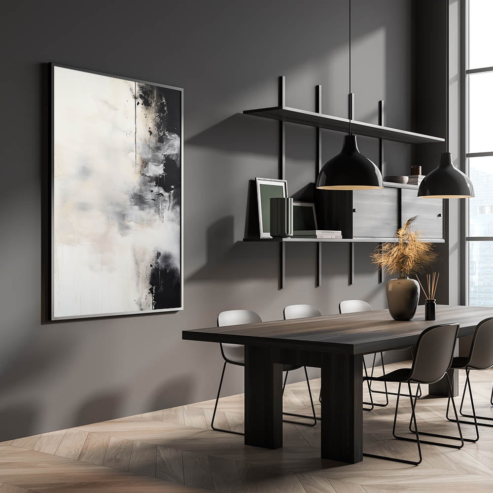 Introduce a bold and contemporary dining art piece to your space with this striking black and white abstract painting. This elegant dining room wall art captures fluid motion and modern minimalism, making it an eye-catching centerpiece for any modern dining area. Whether you prefer a framed print with mat or a sleek acrylic glass finish, this artwork complements a wide range of interior styles.
