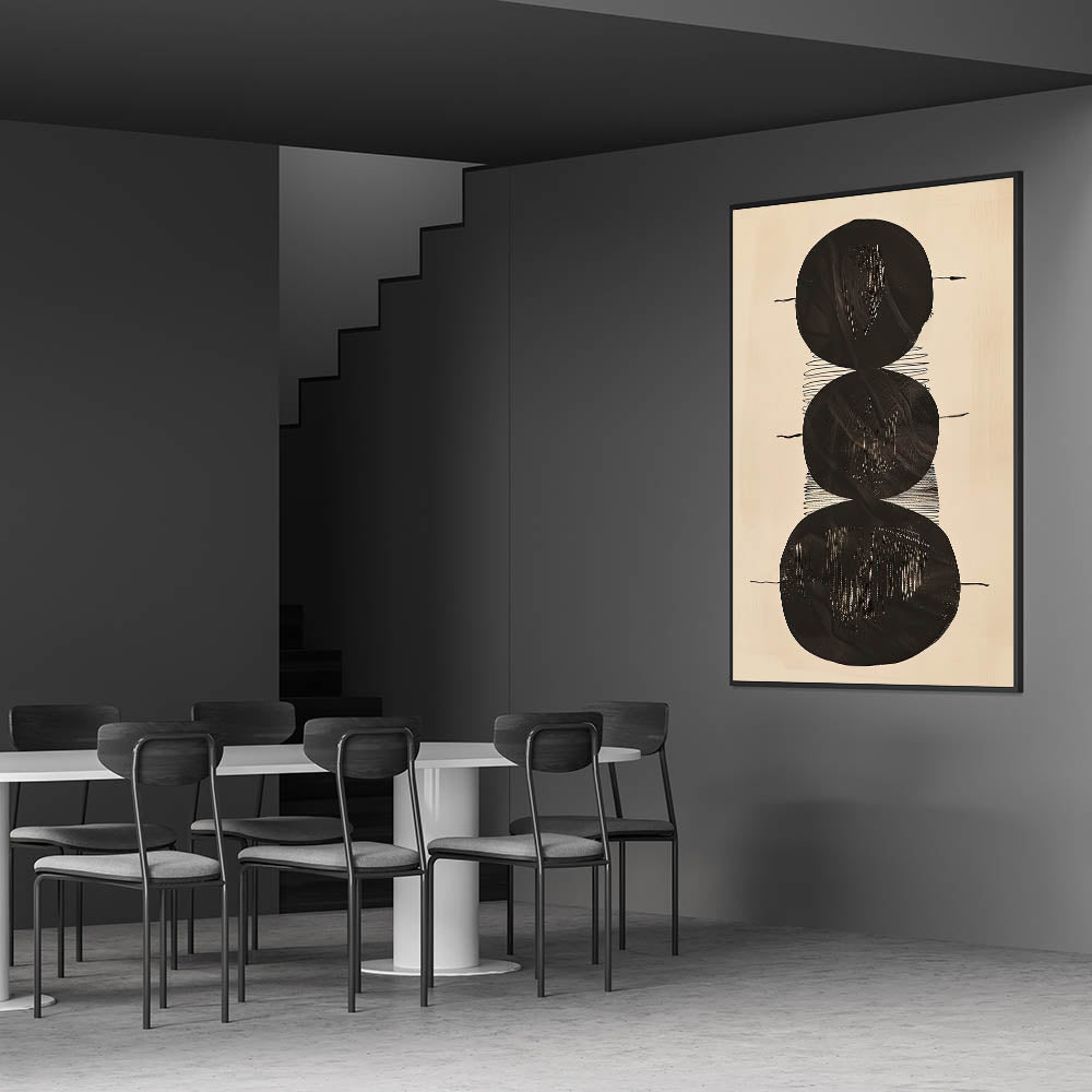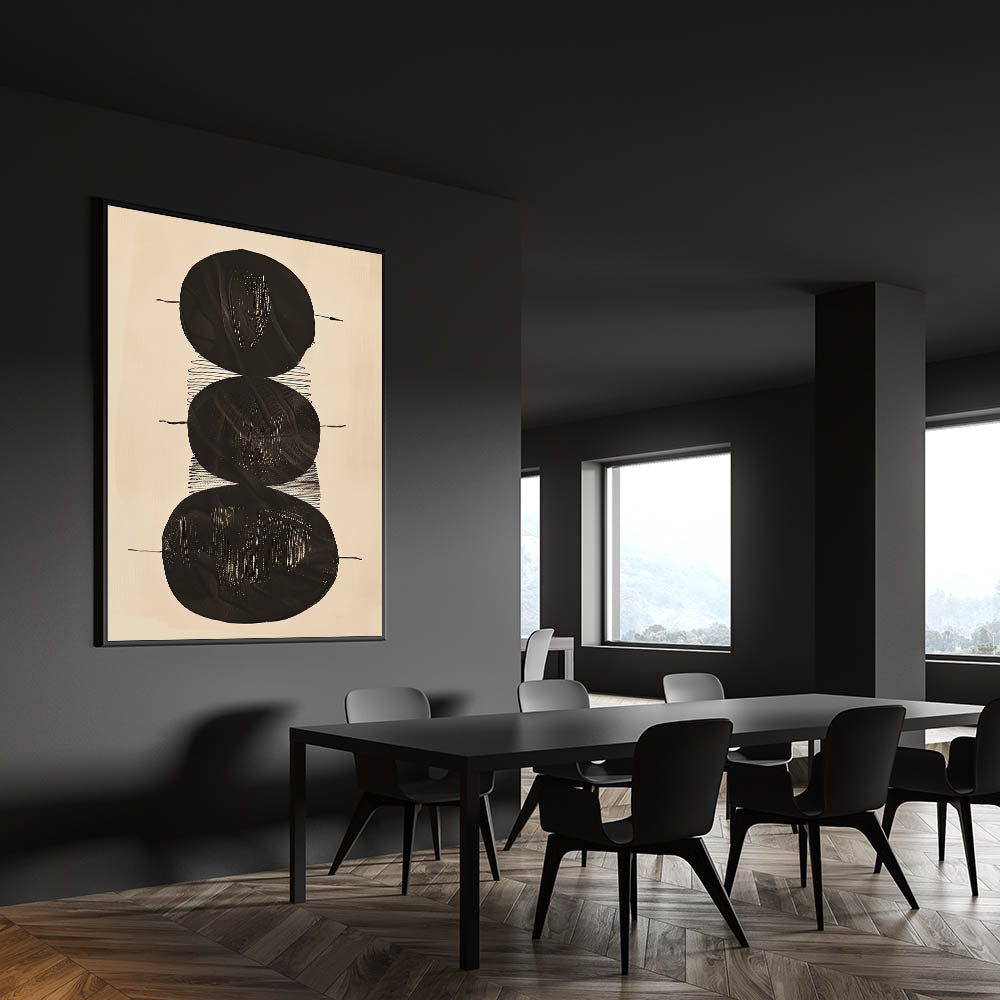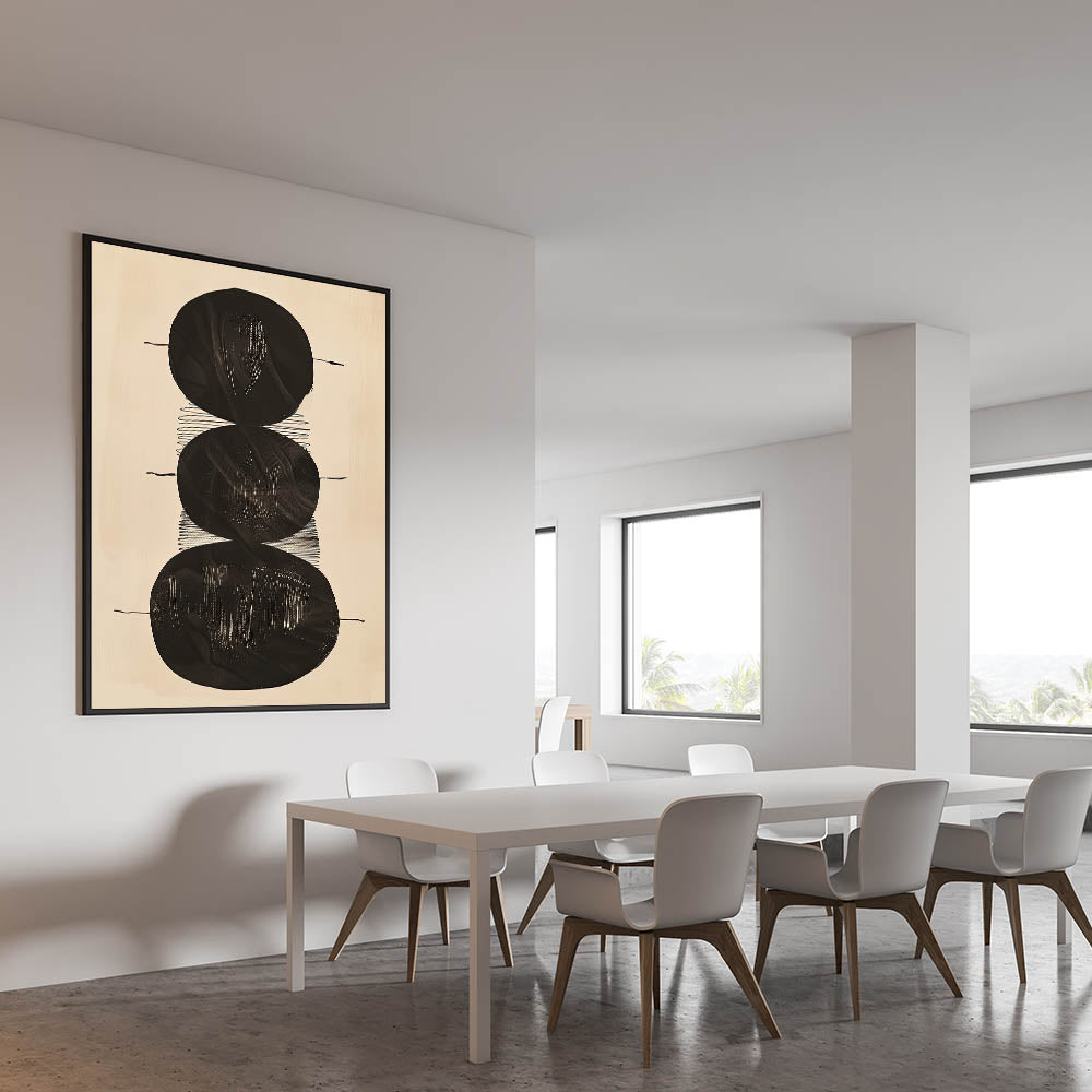 Enhance your dining space with this framed dining room print, a bold yet minimalist abstract design featuring deep black circular forms contrasted against a soft beige background. This modern dining room art piece blends contemporary elegance with a refined aesthetic, making it an ideal choice for sleek, stylish interiors.