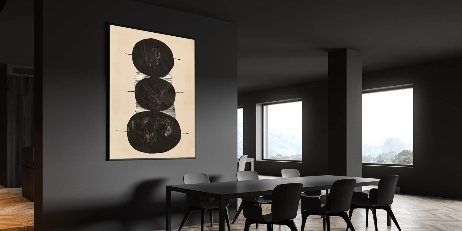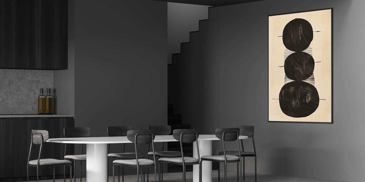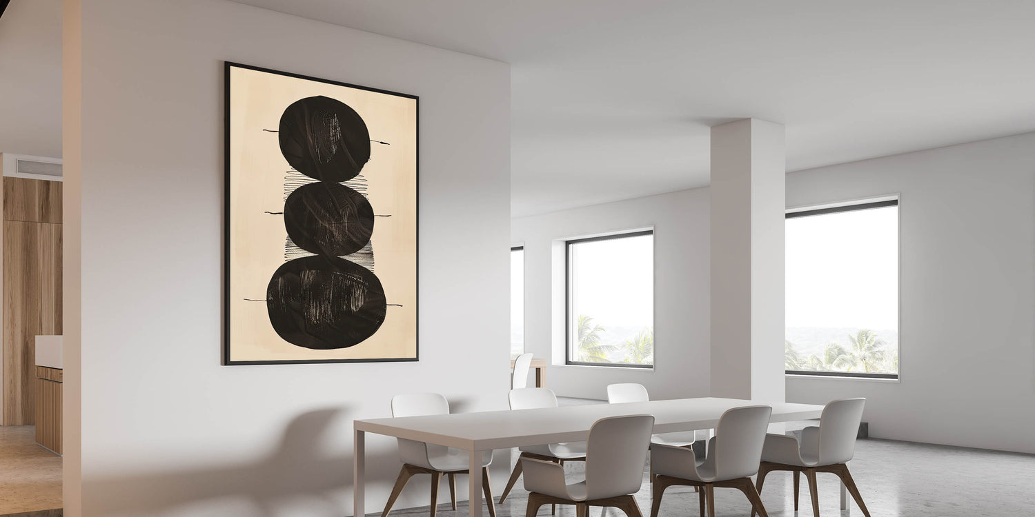 Enhance your dining space with this framed dining room print, a bold yet minimalist abstract design featuring deep black circular forms contrasted against a soft beige background. This modern dining room art piece blends contemporary elegance with a refined aesthetic, making it an ideal choice for sleek, stylish interiors.