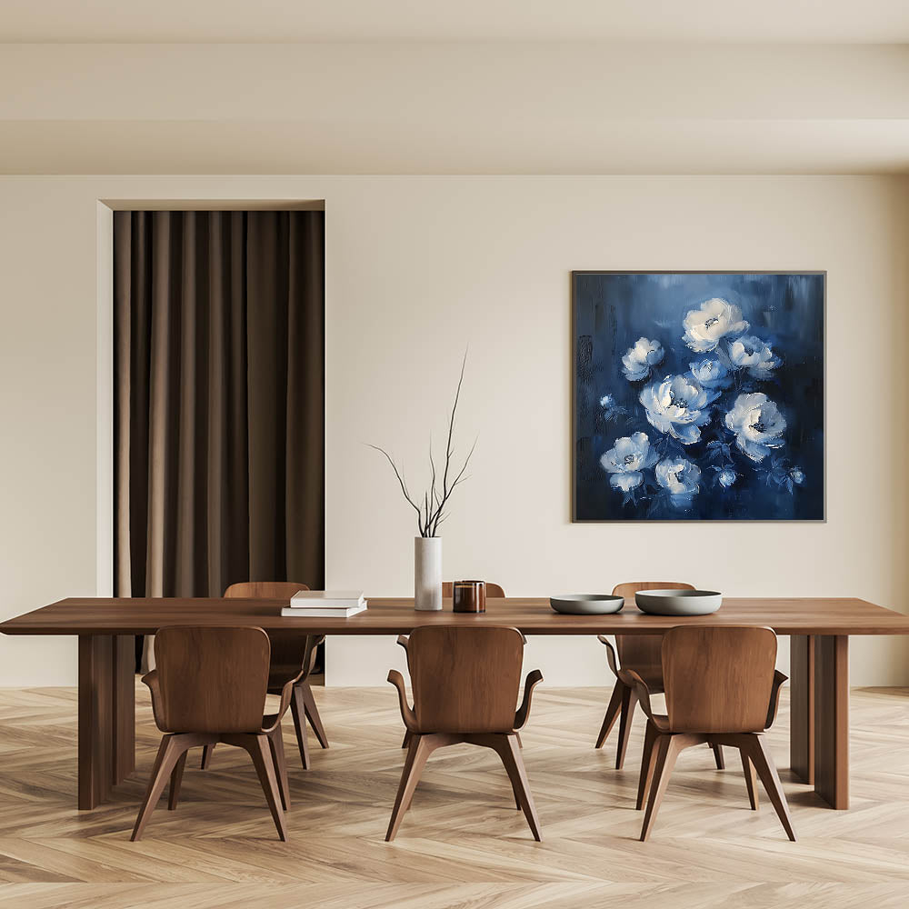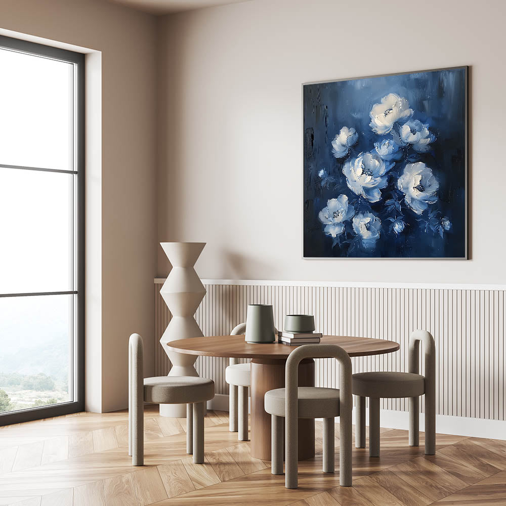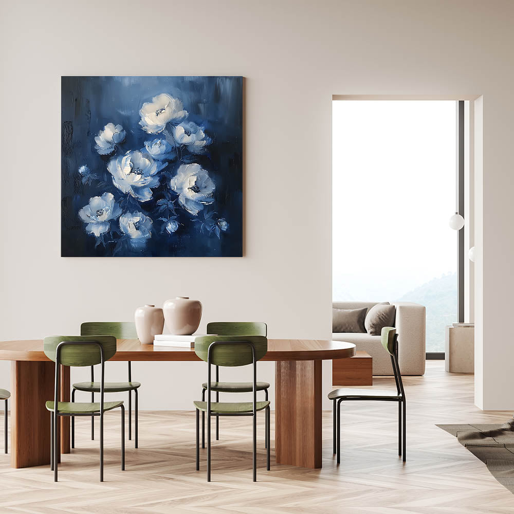 Add sophistication to your dining space with this elegant dining room wall art, featuring delicate white flowers against a rich navy blue background. The beautifully detailed floral design brings a sense of refinement and tranquility, making it a perfect addition to both modern and traditional interiors. Whether displayed as a framed dining room print or a striking canvas, this piece enhances the ambiance of your space with timeless elegance.