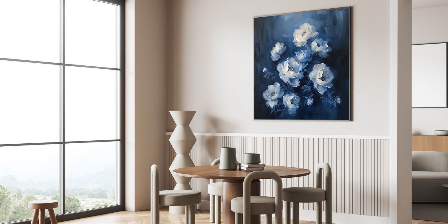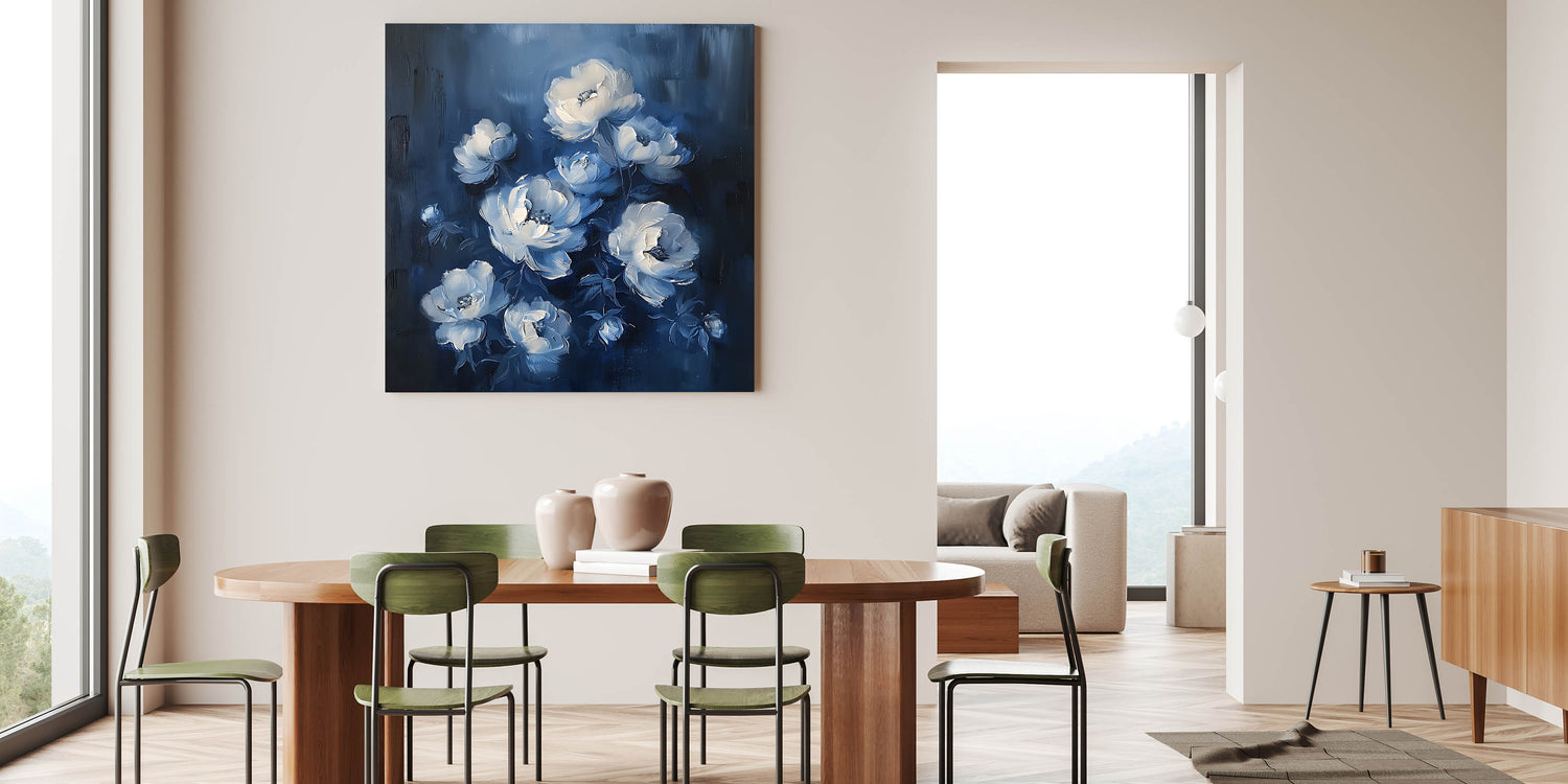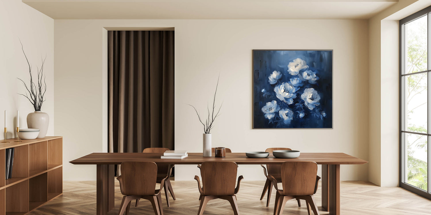 Add sophistication to your dining space with this elegant dining room wall art, featuring delicate white flowers against a rich navy blue background. The beautifully detailed floral design brings a sense of refinement and tranquility, making it a perfect addition to both modern and traditional interiors. Whether displayed as a framed dining room print or a striking canvas, this piece enhances the ambiance of your space with timeless elegance.