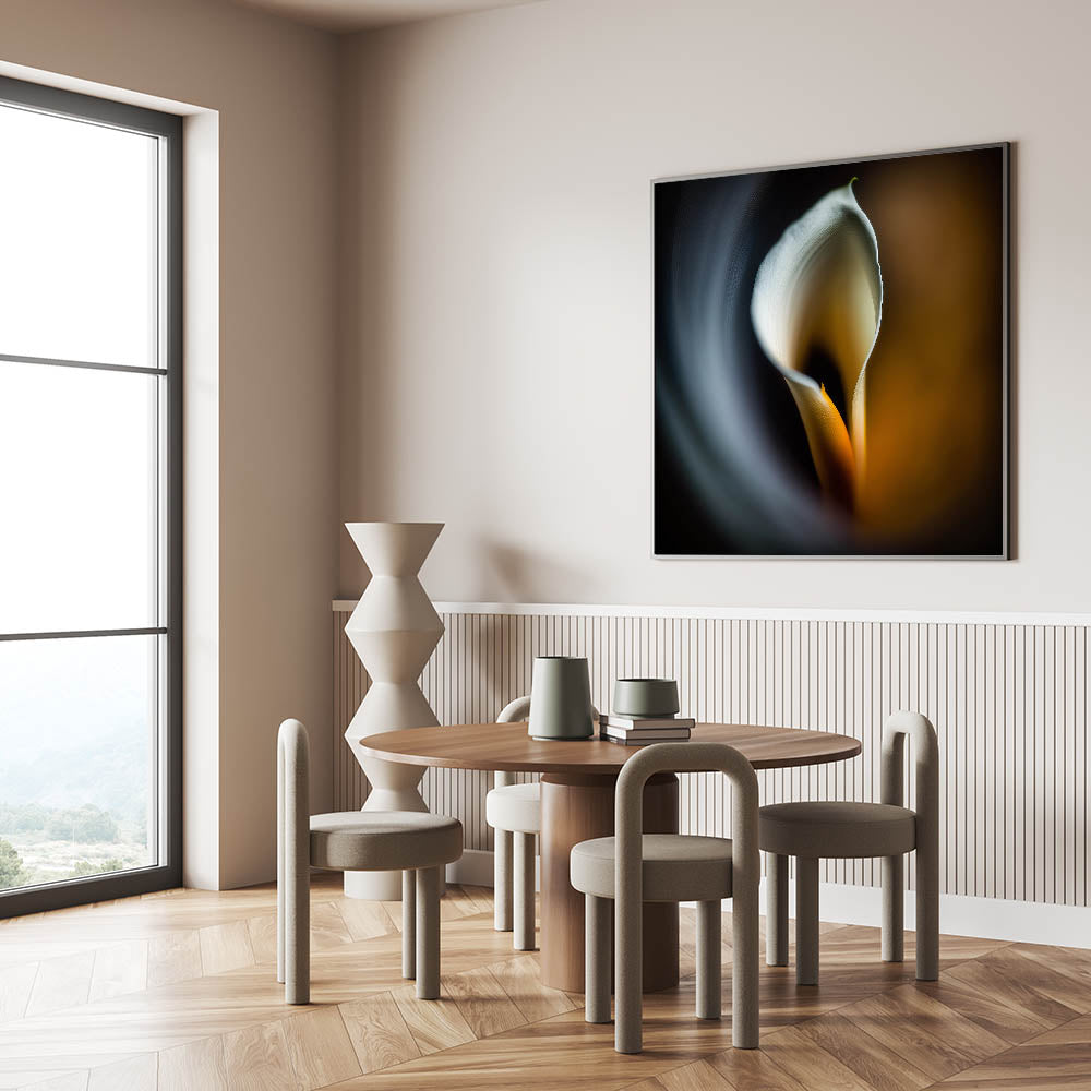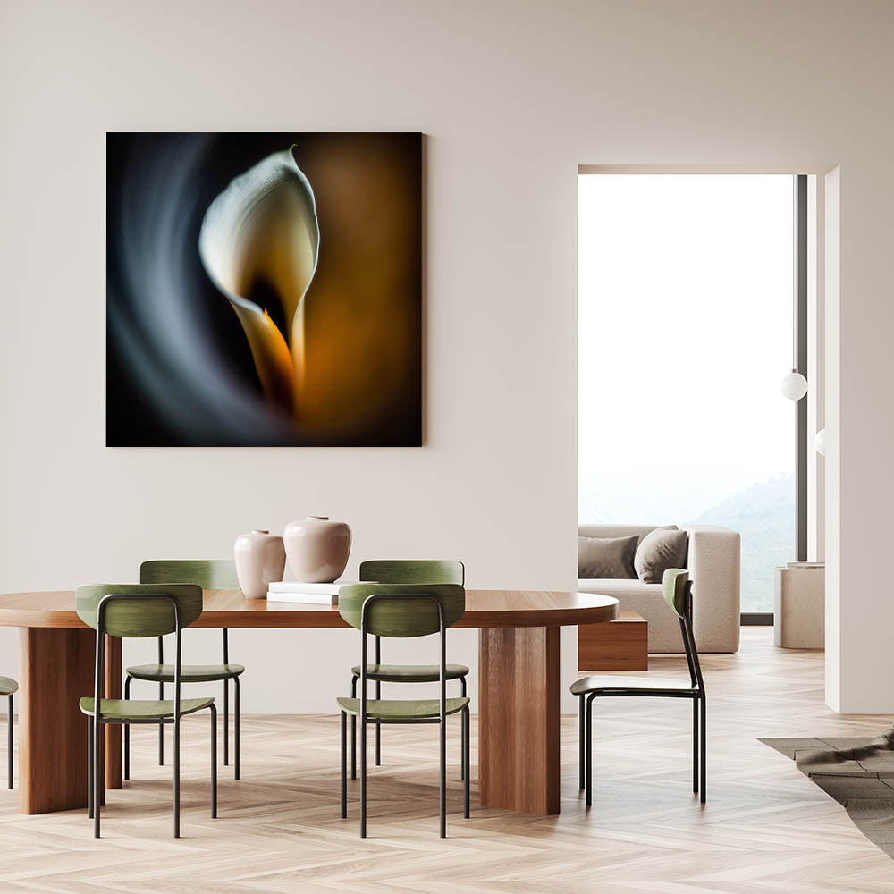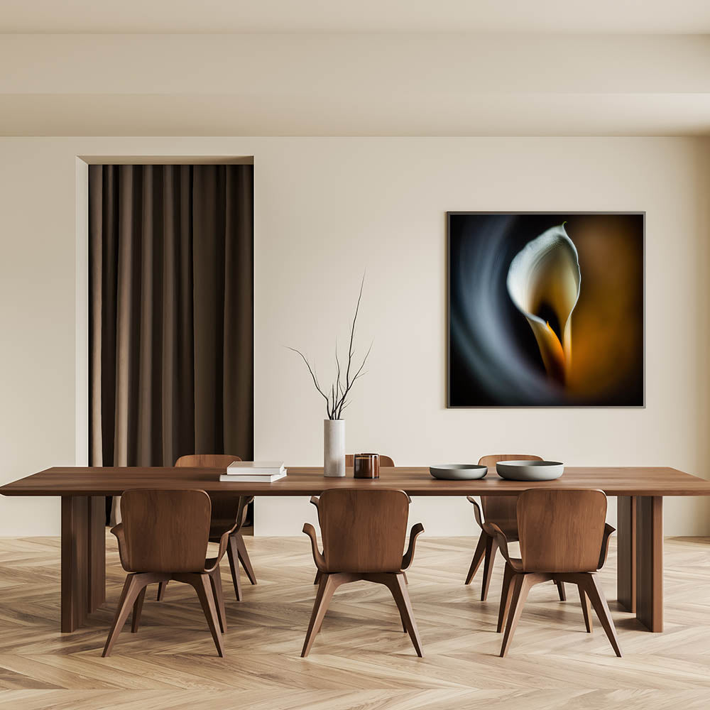 Bring an air of sophistication to your dining space with this framed dining room print, showcasing a stunning close-up of a calla lily. The delicate curves of the petals and the soft interplay of light and shadow create a mesmerizing composition that exudes elegance and warmth. This floral artwork is perfect for those looking to add a touch of nature-inspired beauty to their dining area.