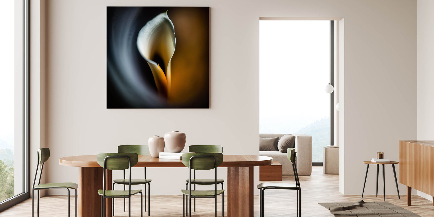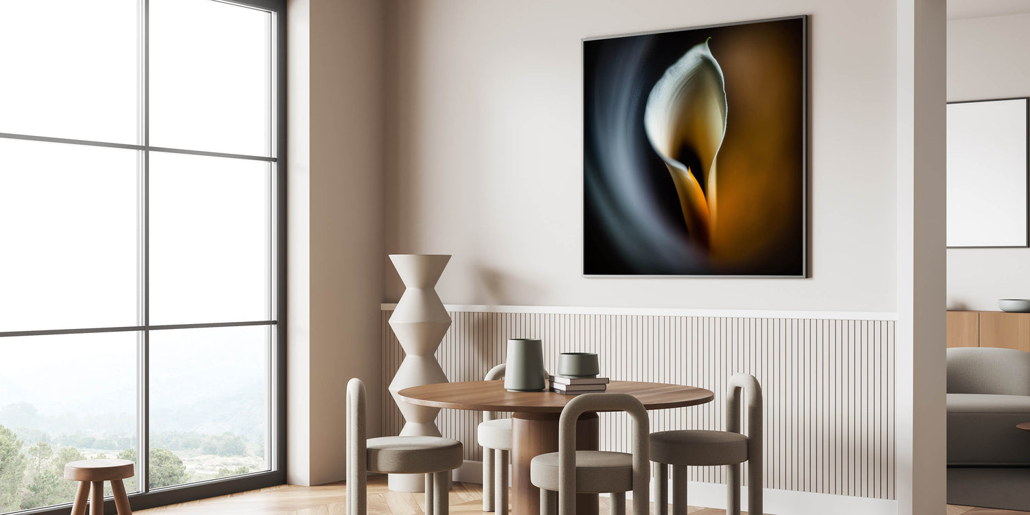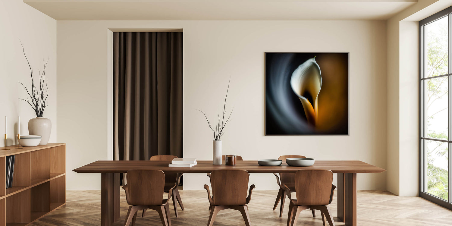 Bring an air of sophistication to your dining space with this framed dining room print, showcasing a stunning close-up of a calla lily. The delicate curves of the petals and the soft interplay of light and shadow create a mesmerizing composition that exudes elegance and warmth. This floral artwork is perfect for those looking to add a touch of nature-inspired beauty to their dining area.