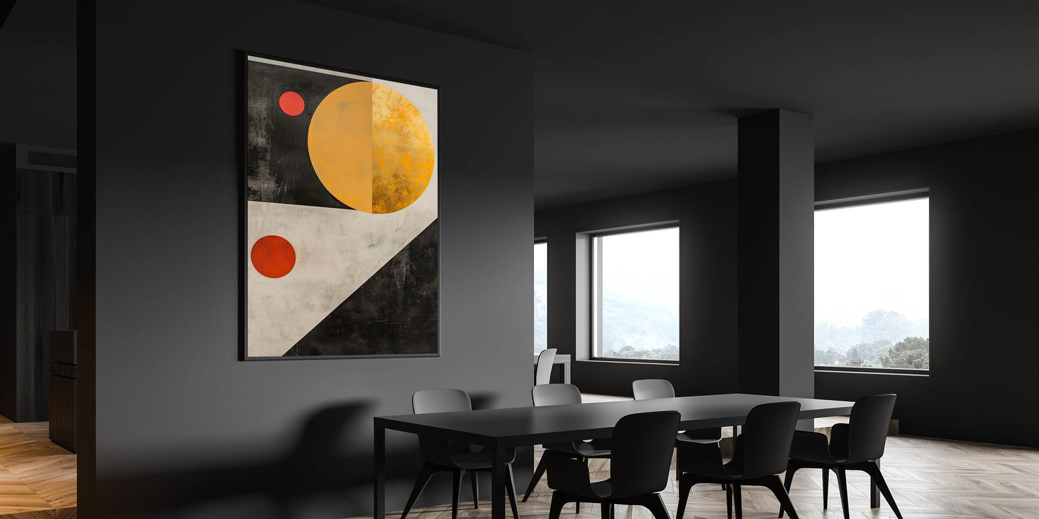 Enhance your dining area with this bold and modern dining room wall art. This geometric piece features a striking combination of black, gold, and red, adding a sophisticated yet contemporary touch to any dining space. The balance of abstract shapes and metallic hues creates an eye-catching focal point that complements various interior styles.