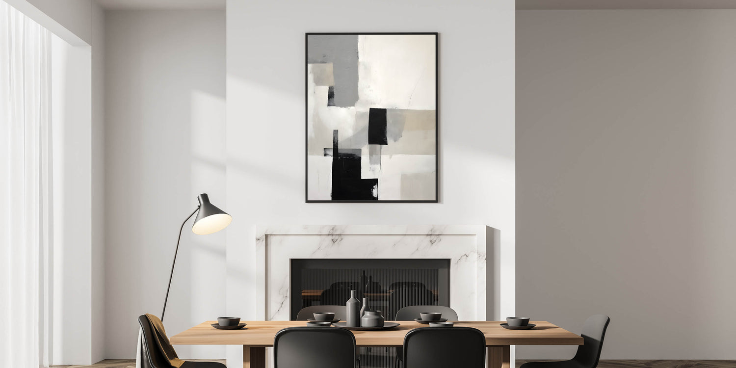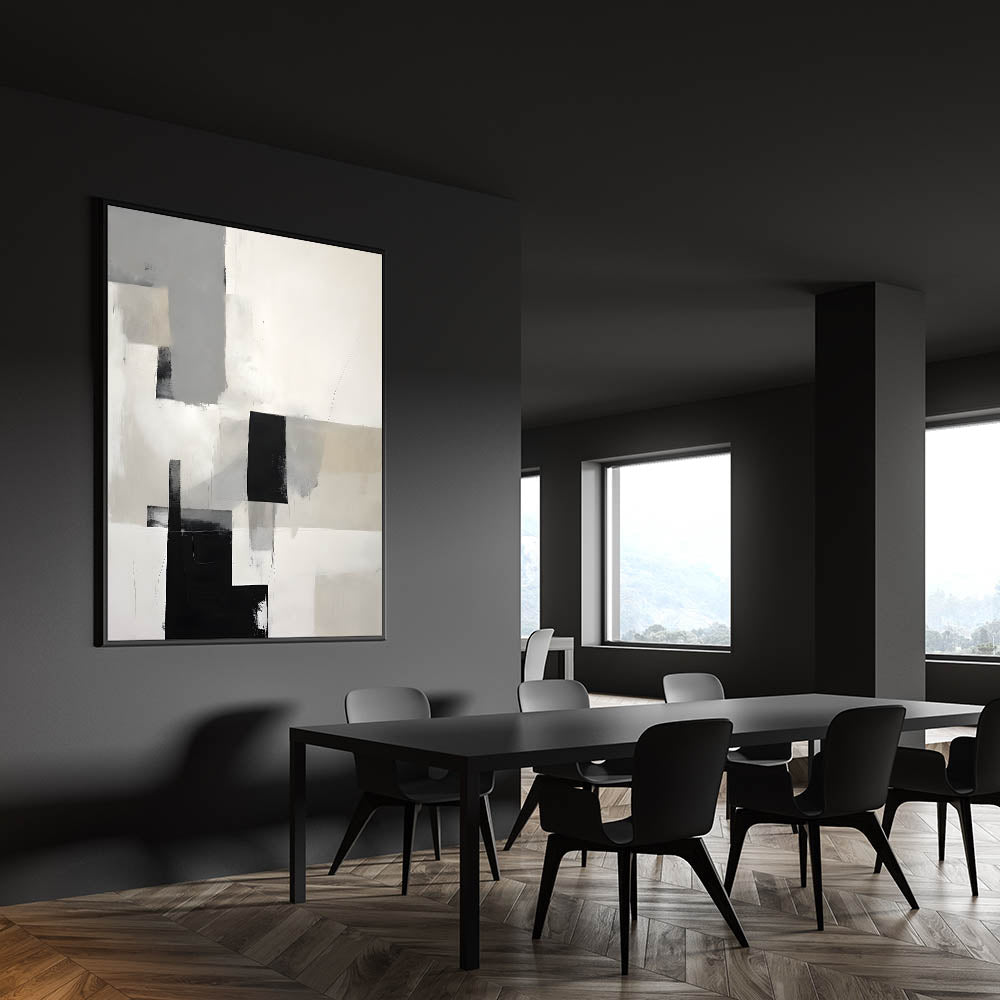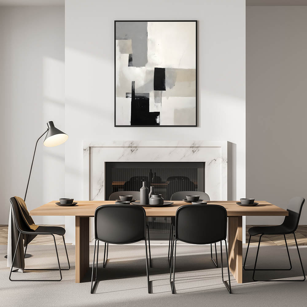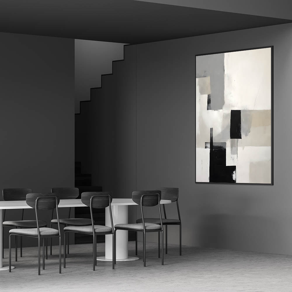 Transform your dining space with this framed dining room print, featuring a sophisticated abstract design in black, gray, and white. The modern geometric composition blends elegance with simplicity, making it the perfect statement piece for contemporary dining art pieces. Whether you're looking for high-quality canvas art for dining rooms or acrylic glass art for dining room walls, this artwork is available in multiple formats to suit your décor.