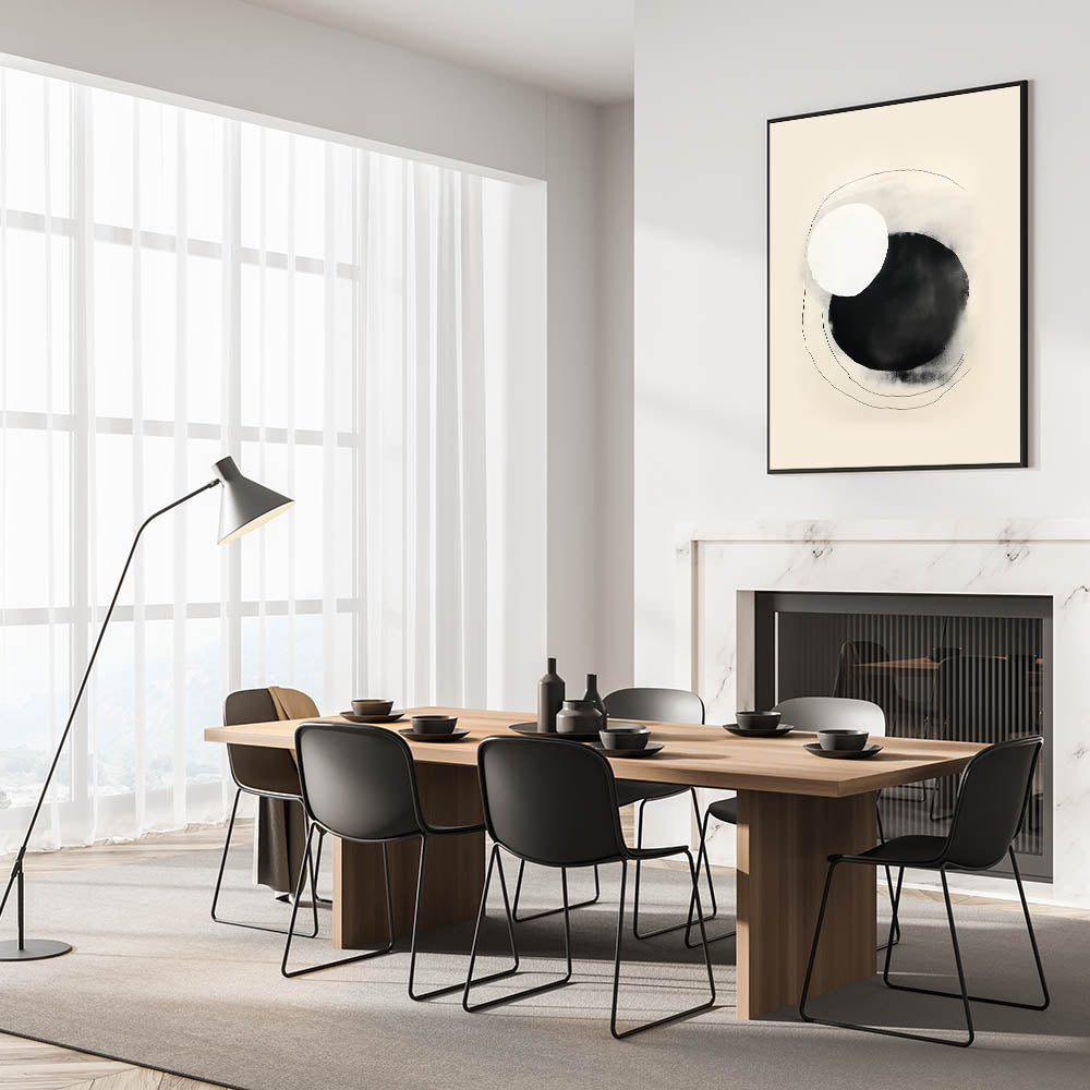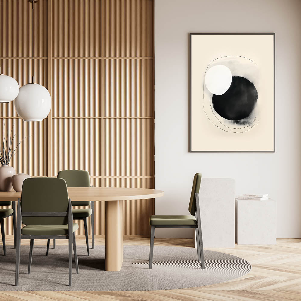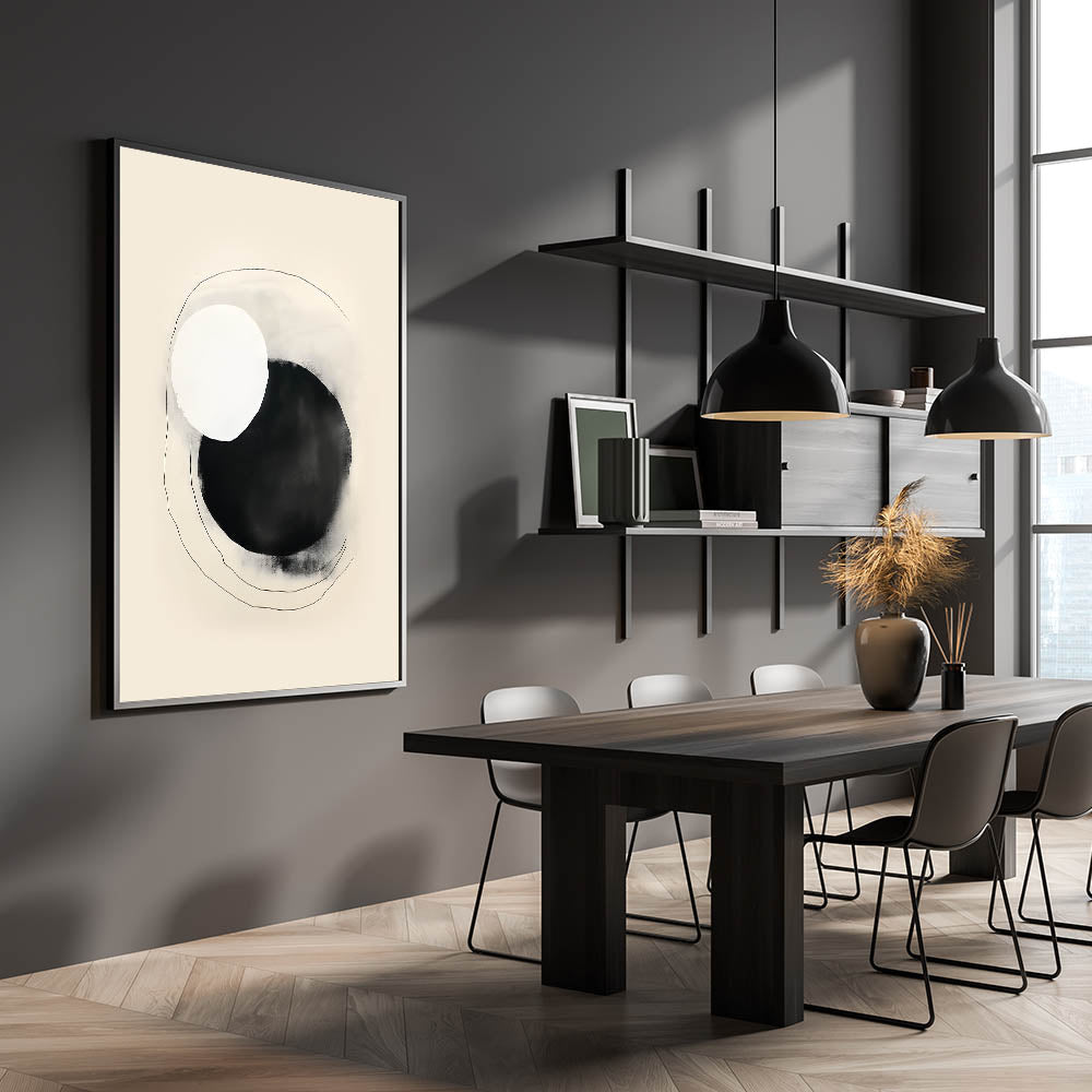 Elevate your dining space with framed dining room prints, featuring a minimalist black and beige abstract design. This elegant dining room wall art blends soft, fluid shapes with structured linework, creating a balance of simplicity and sophistication. The neutral tones and circular composition bring harmony to modern, Scandinavian, and contemporary interiors.