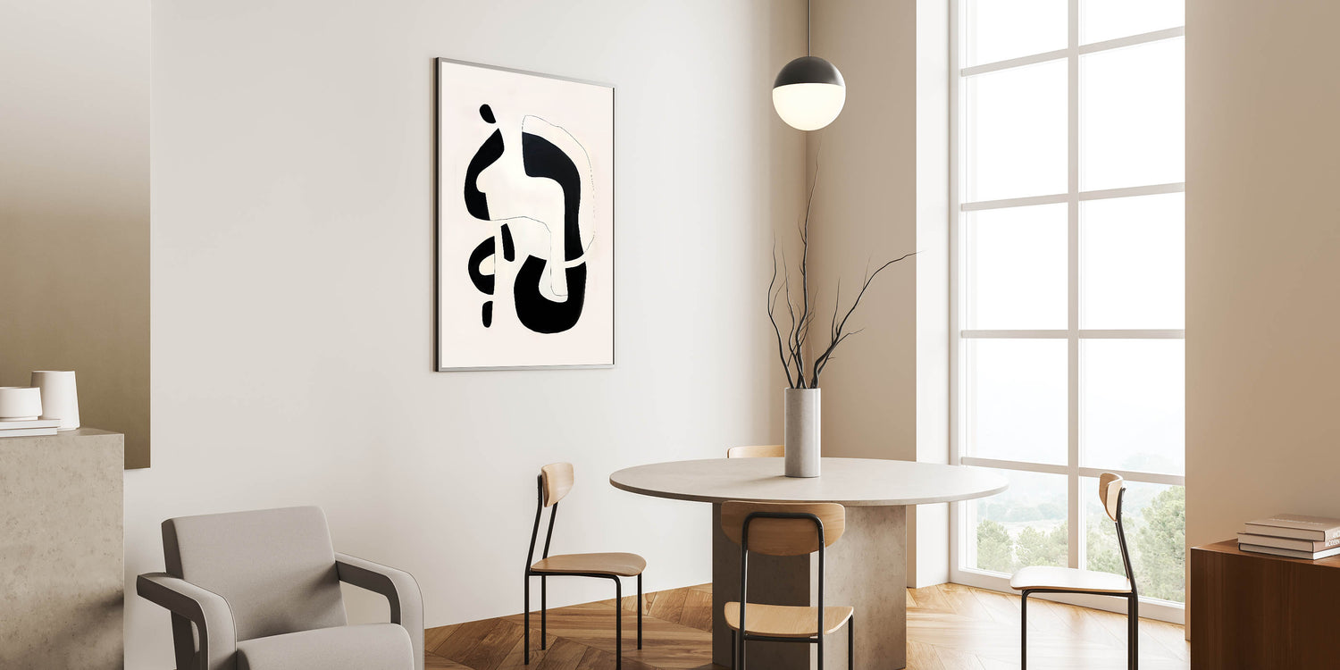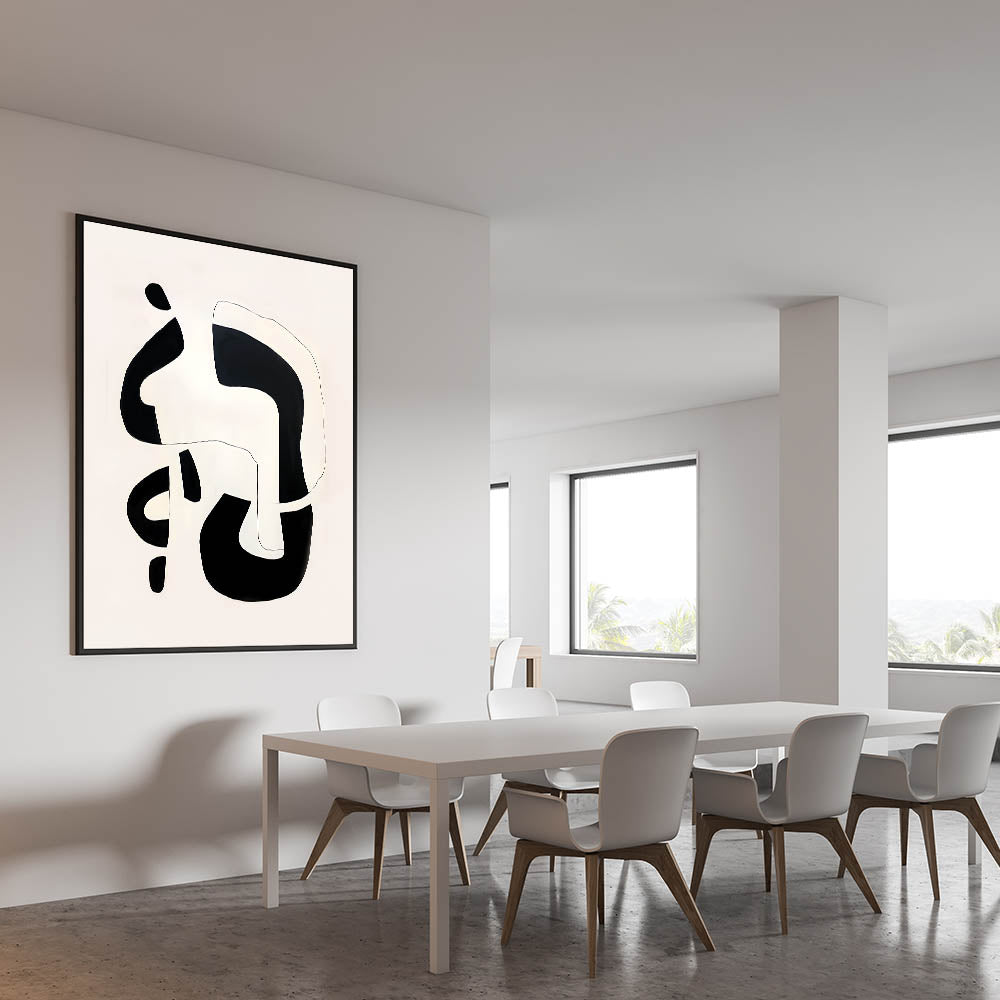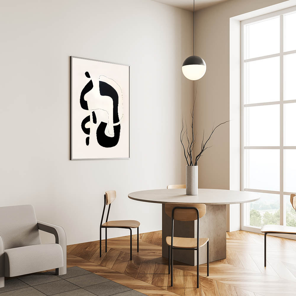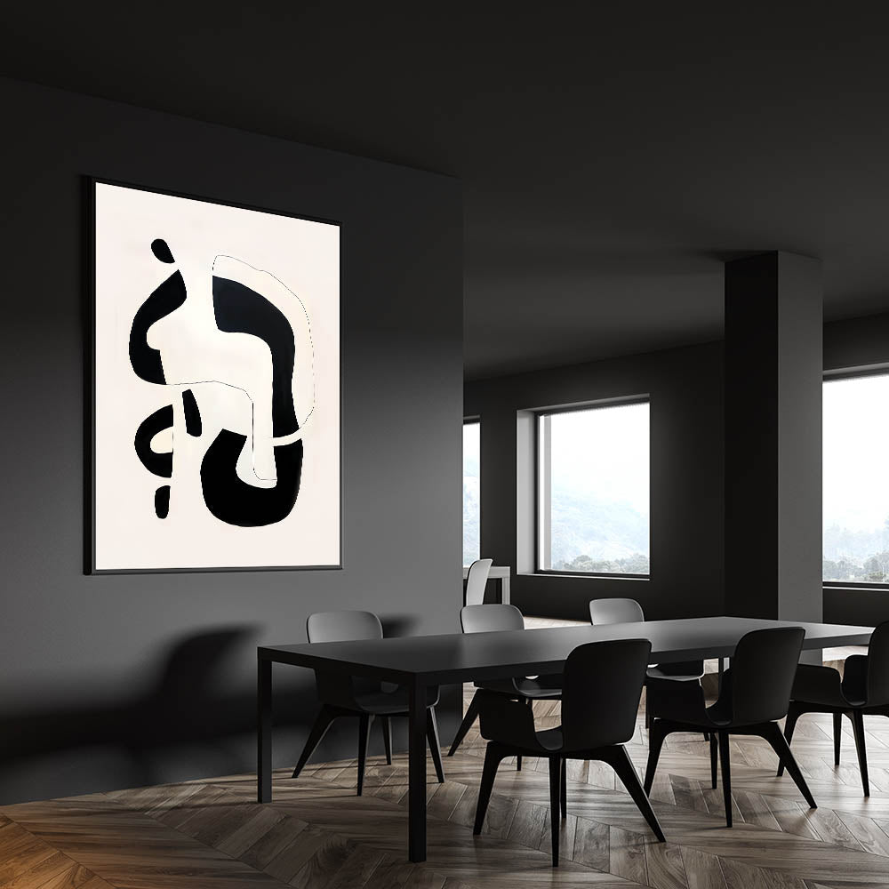 Transform your space with framed dining room prints featuring a modern black and white abstract composition. This elegant dining room wall art enhances your dining area with its minimalist aesthetic, creating a sophisticated and timeless look.