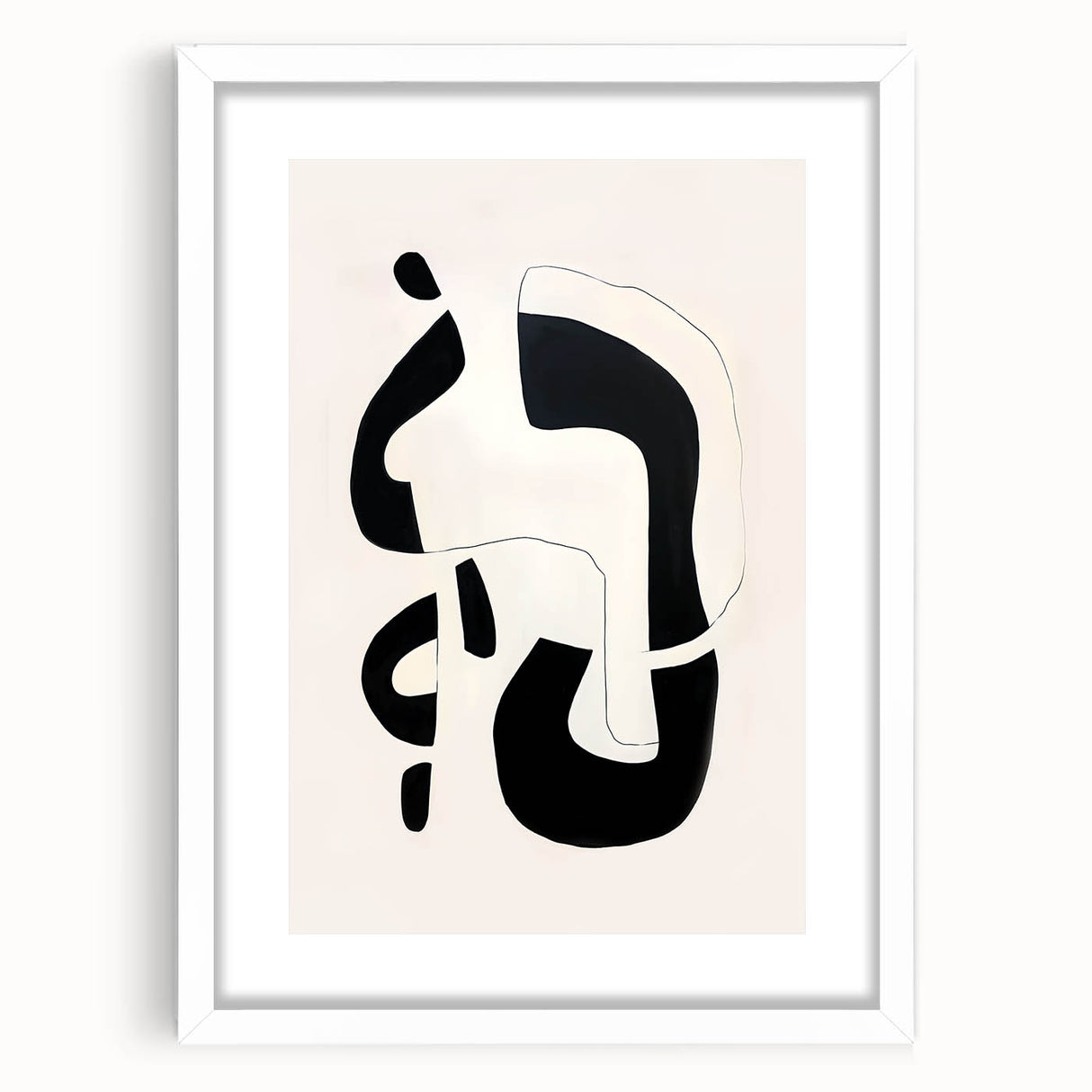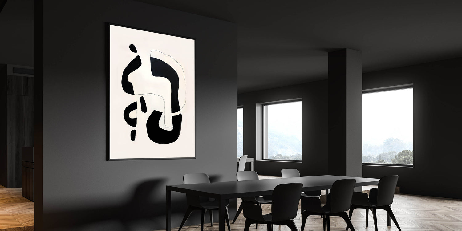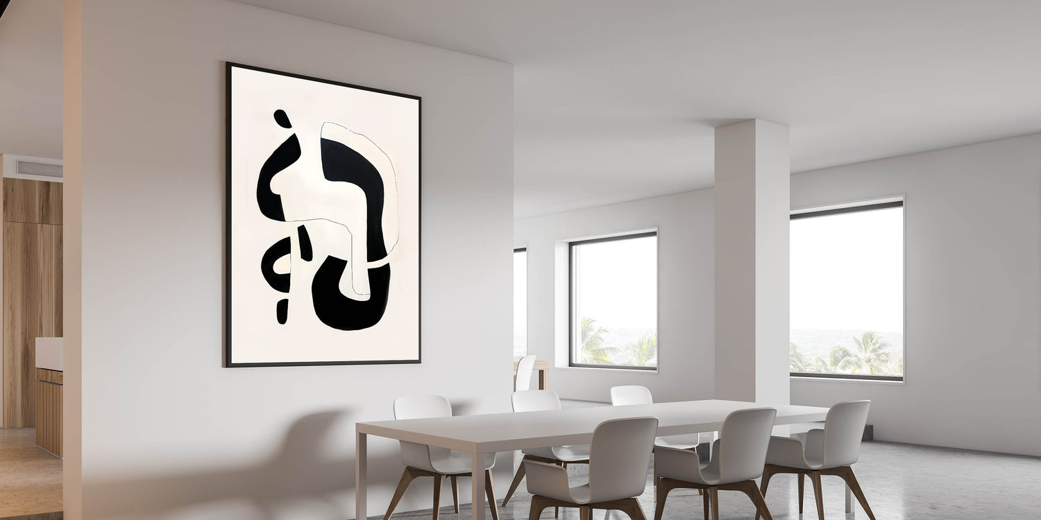Transform your space with framed dining room prints featuring a modern black and white abstract composition. This elegant dining room wall art enhances your dining area with its minimalist aesthetic, creating a sophisticated and timeless look.