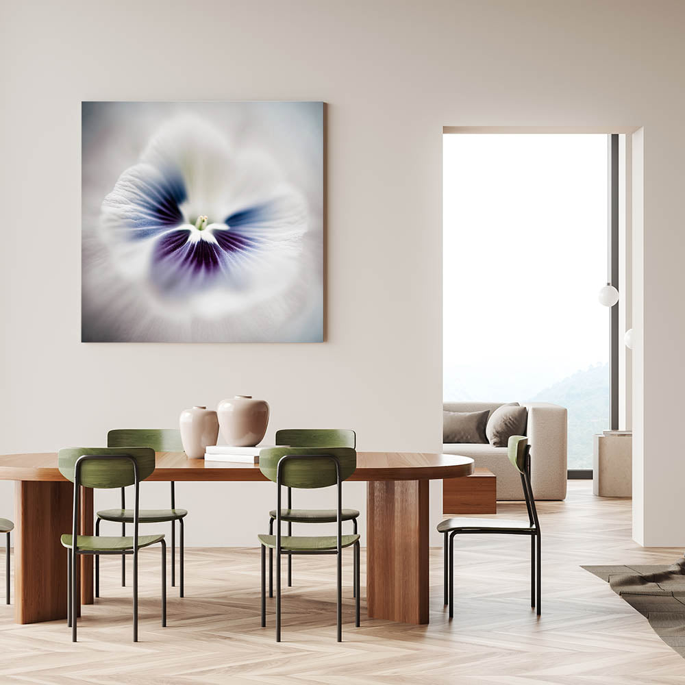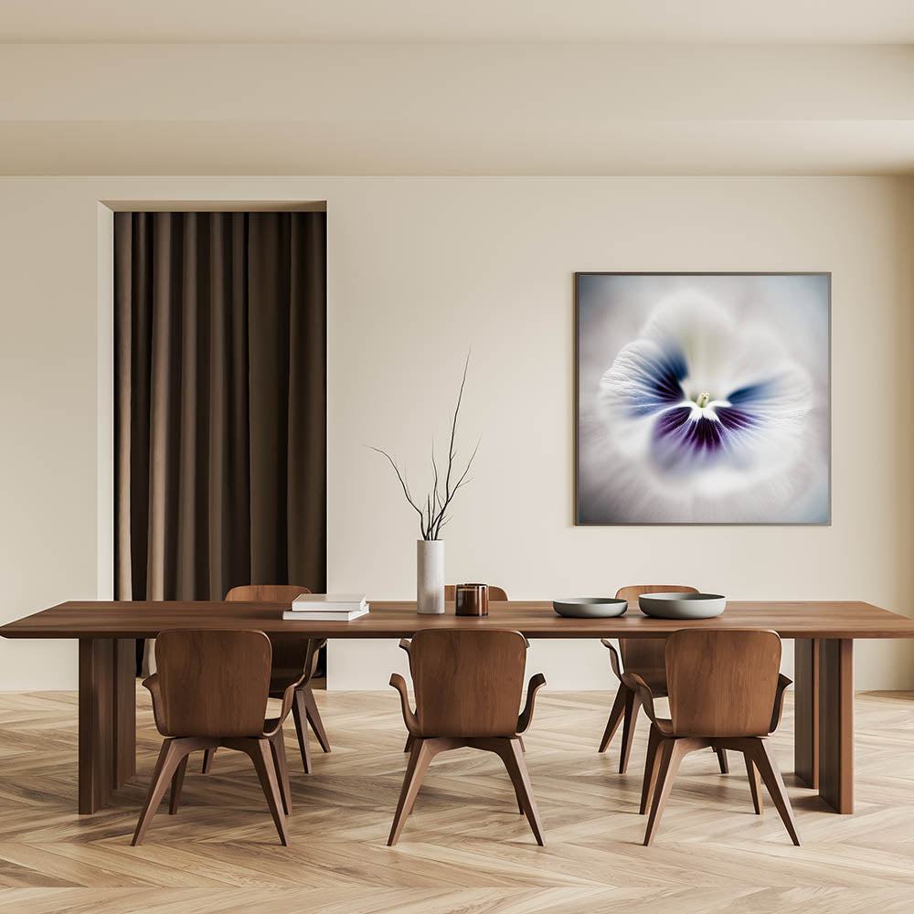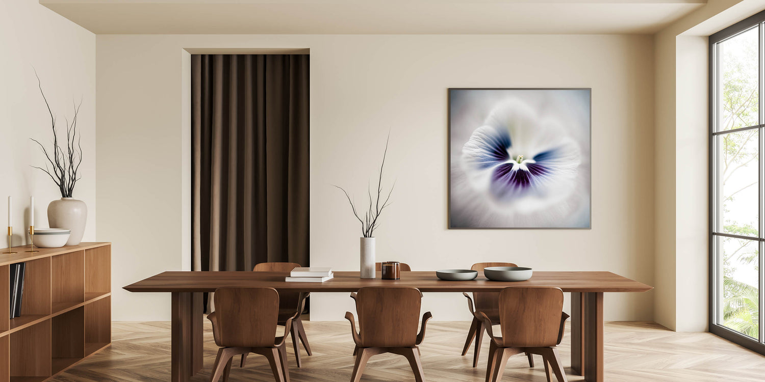 Introduce a sense of refined elegance to your dining space with this framed dining room print, featuring a stunning close-up of a white and violet flower. The delicate petals and rich contrast of deep purple hues create a sophisticated and artistic focal point, perfect for modern and classic dining interiors alike. The soft blur effect adds depth and an ethereal touch, making this floral artwork a graceful addition to any space.
