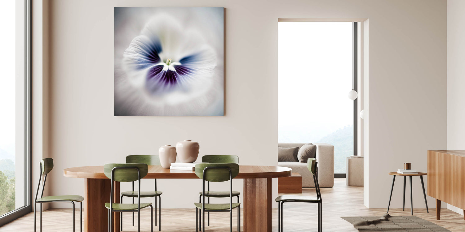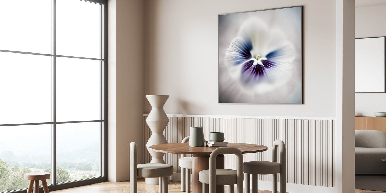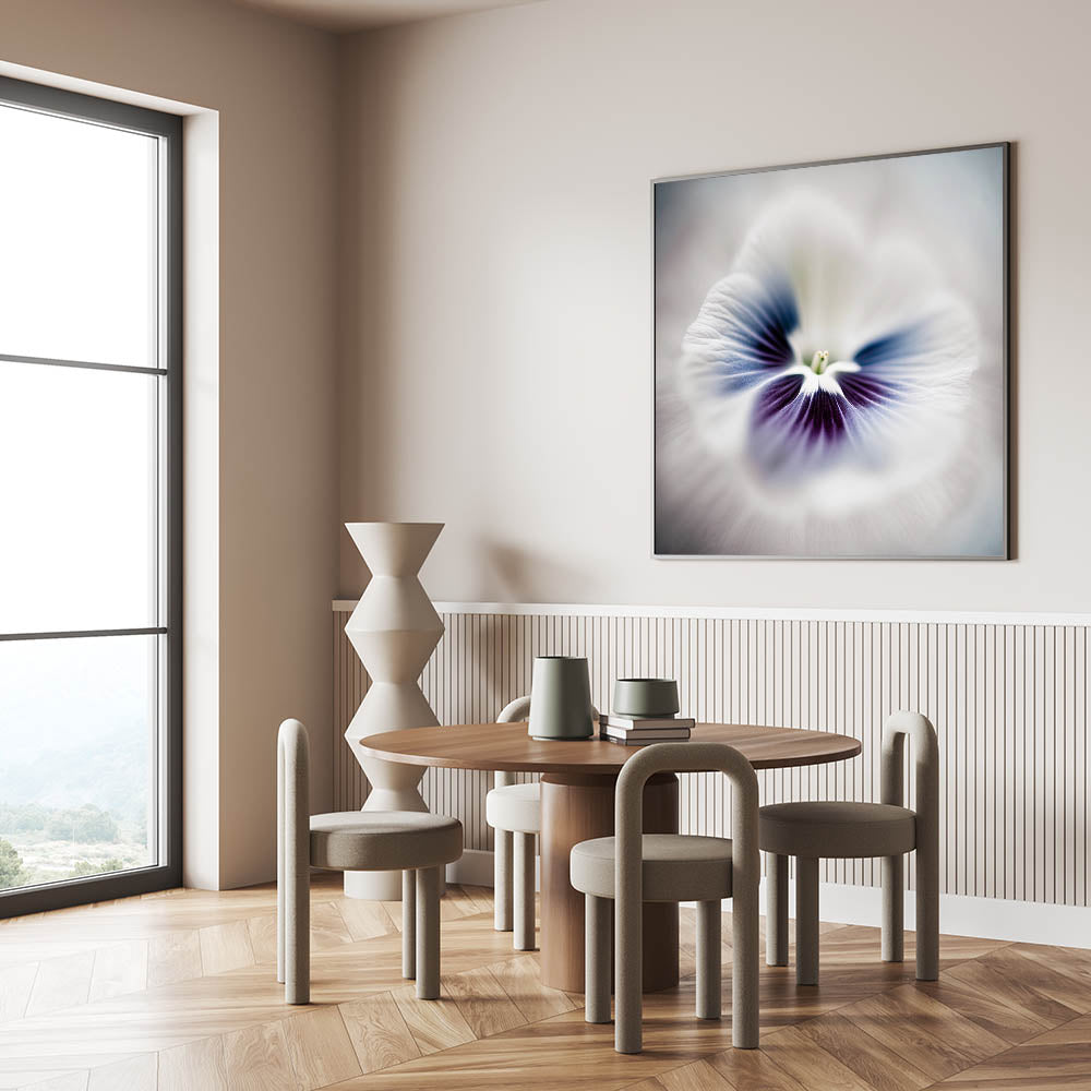 Introduce a sense of refined elegance to your dining space with this framed dining room print, featuring a stunning close-up of a white and violet flower. The delicate petals and rich contrast of deep purple hues create a sophisticated and artistic focal point, perfect for modern and classic dining interiors alike. The soft blur effect adds depth and an ethereal touch, making this floral artwork a graceful addition to any space.