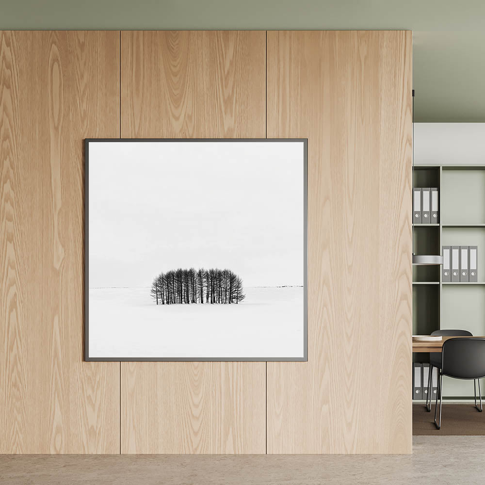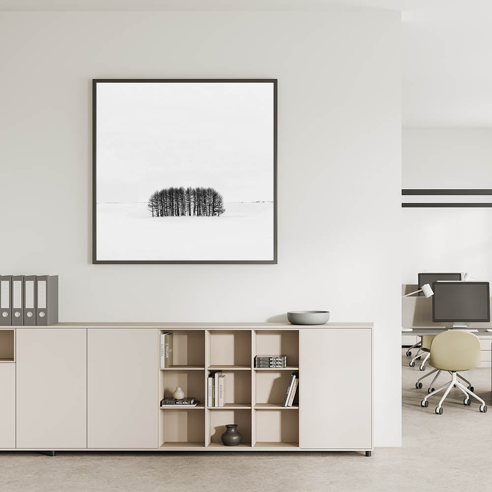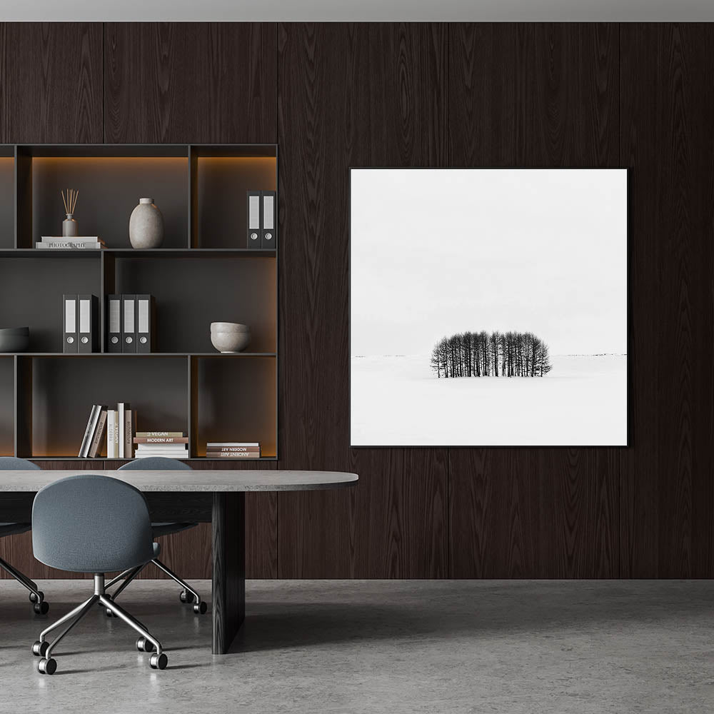 Enhance your workspace with this stunning framed office art, featuring a minimalist winter landscape in black and white. A small cluster of leafless trees stands against a vast, snowy backdrop, creating a sense of calm and balance. This corporate wall decor piece is ideal for professionals who appreciate clean, contemporary aesthetics in their office setting.