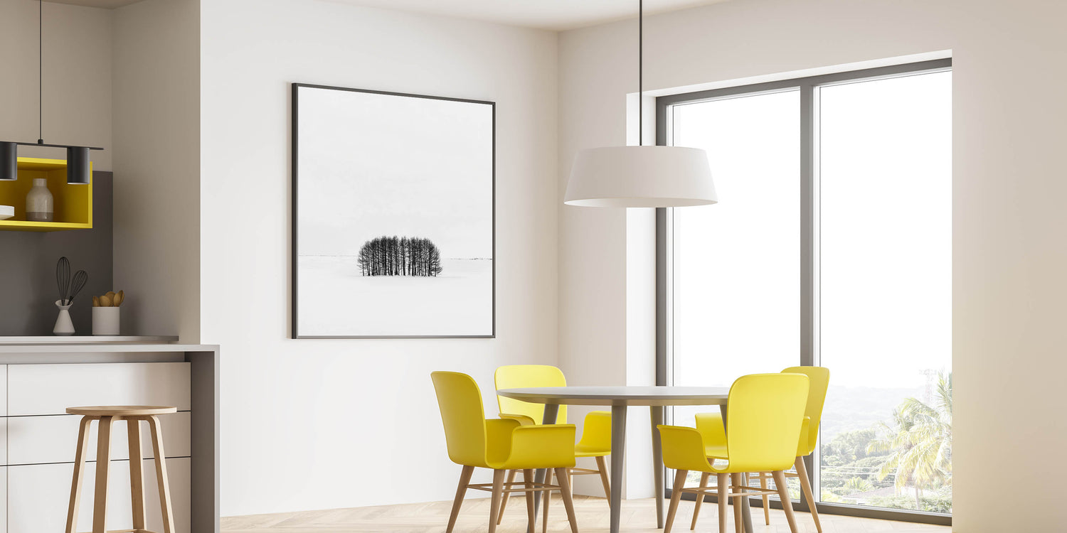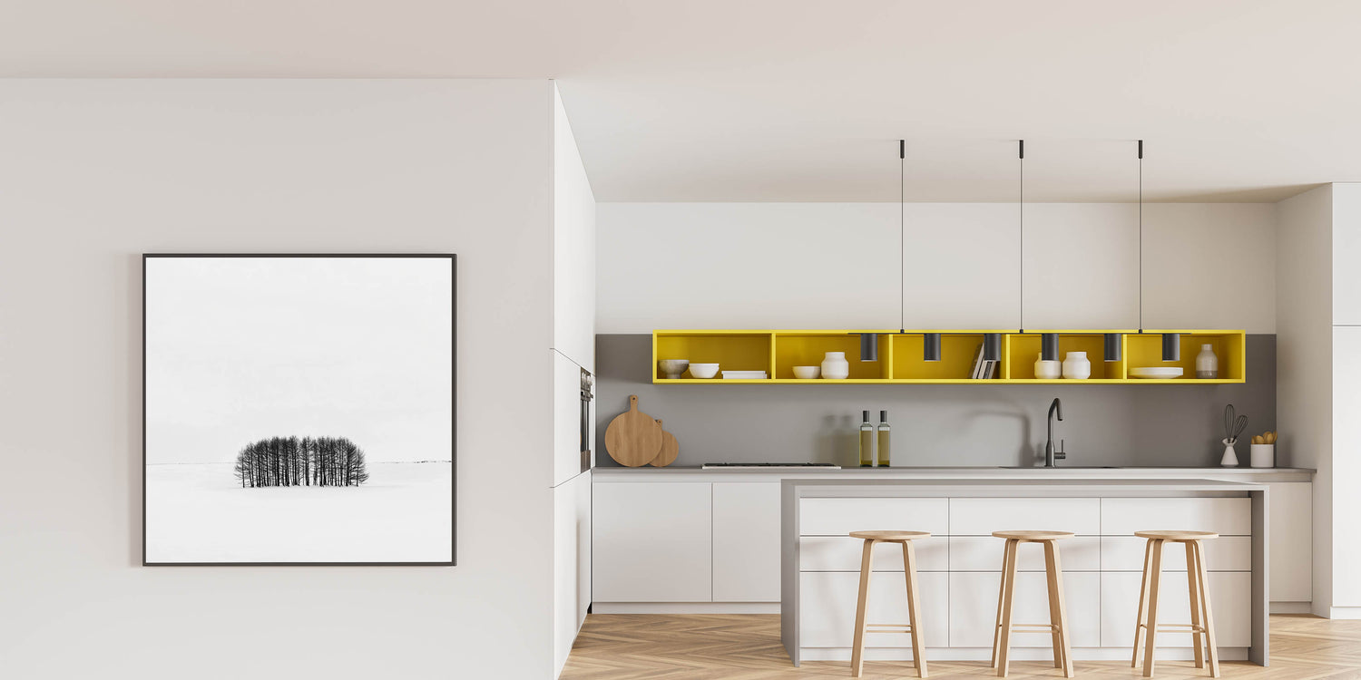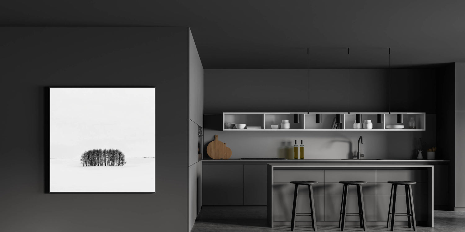Enhance your workspace with this stunning framed office art, featuring a minimalist winter landscape in black and white. A small cluster of leafless trees stands against a vast, snowy backdrop, creating a sense of calm and balance. This corporate wall decor piece is ideal for professionals who appreciate clean, contemporary aesthetics in their office setting.
