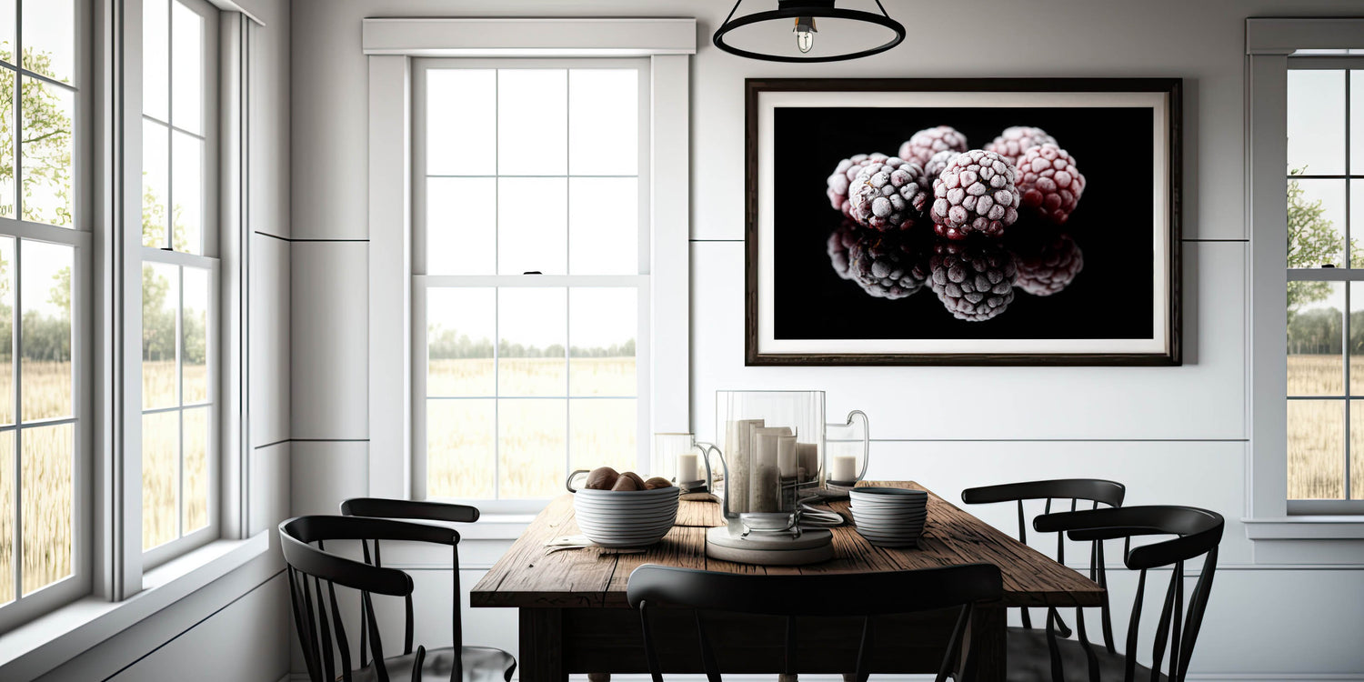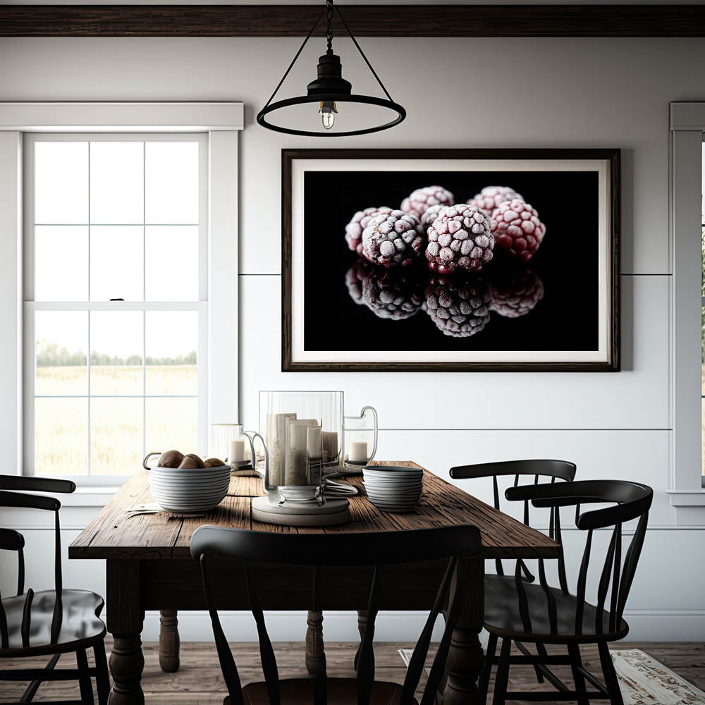 Add a touch of sophistication to your kitchen with this stunning frozen blackberry art, featuring a close-up of frost-covered blackberries with a dramatic reflection on a sleek black surface. The contrast between the icy texture and the deep plum hues creates a striking visual appeal, making it a perfect choice for modern kitchen decor.