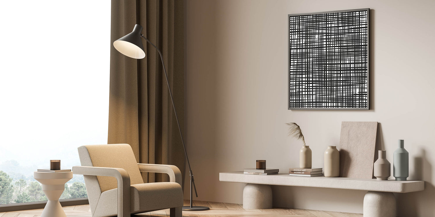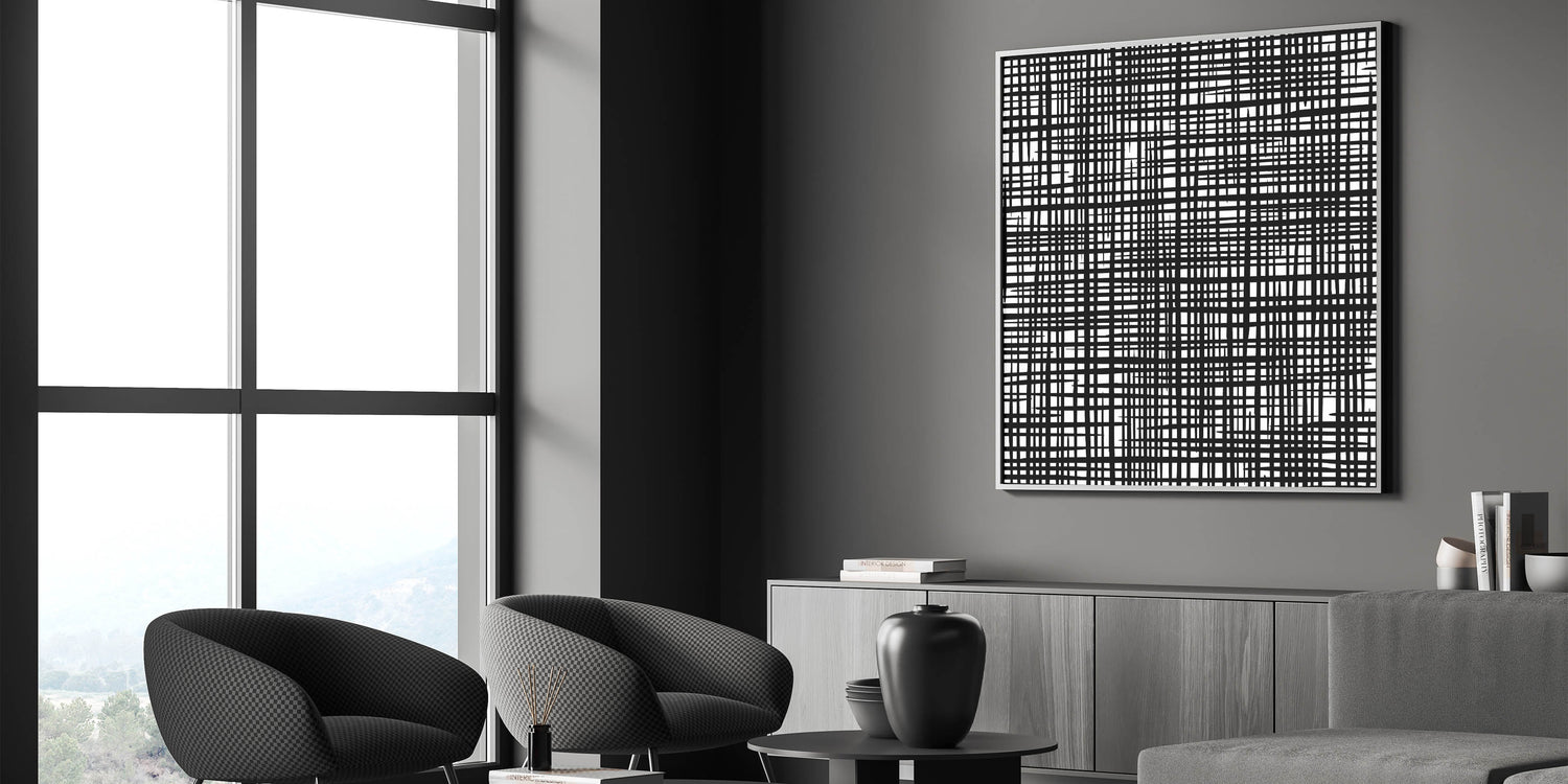 This contemporary framed abstract art is ideal for entryways, offices, or bold living spaces. The sharp black-and-white contrast creates dynamic energy, while the grid layout delivers balance and symmetry. Choose from framed, canvas, acrylic, or rolled formats to fit your aesthetic. Add modern structure to your decor with commanding style.