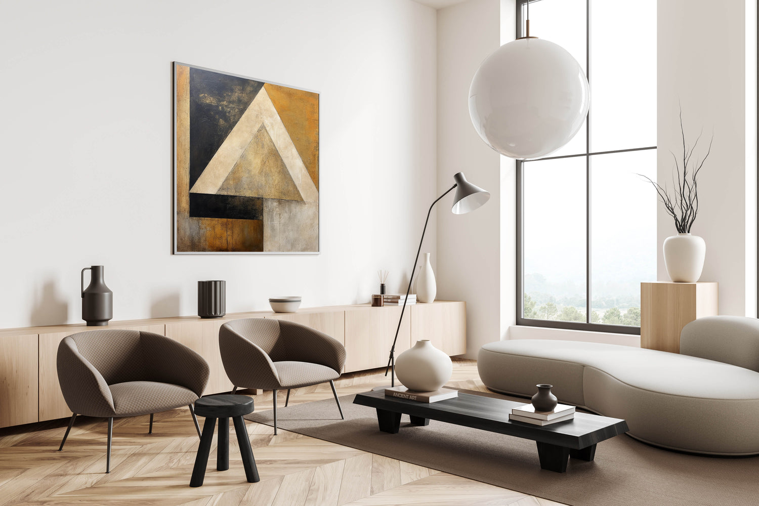 Enhance your space with the dynamic and bold design of our Geometric Abstract Line Art in Gold and Black. This piece features a prominent triangular shape with layered sections of gold, black, and beige, creating a visually captivating focal point. The artwork’s textured strokes and geometric forms make it a perfect choice for those who appreciate modern and minimalist aesthetics.