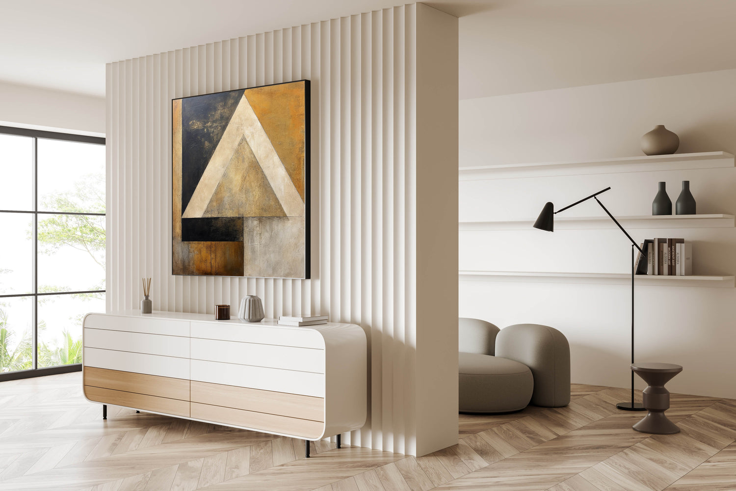 This modern abstract wall art is an excellent addition to living rooms, offices, and bedrooms, bringing a sophisticated touch with its clean lines and rich textures. Perfect for enhancing a modern, contemporary, or minimalist interior.