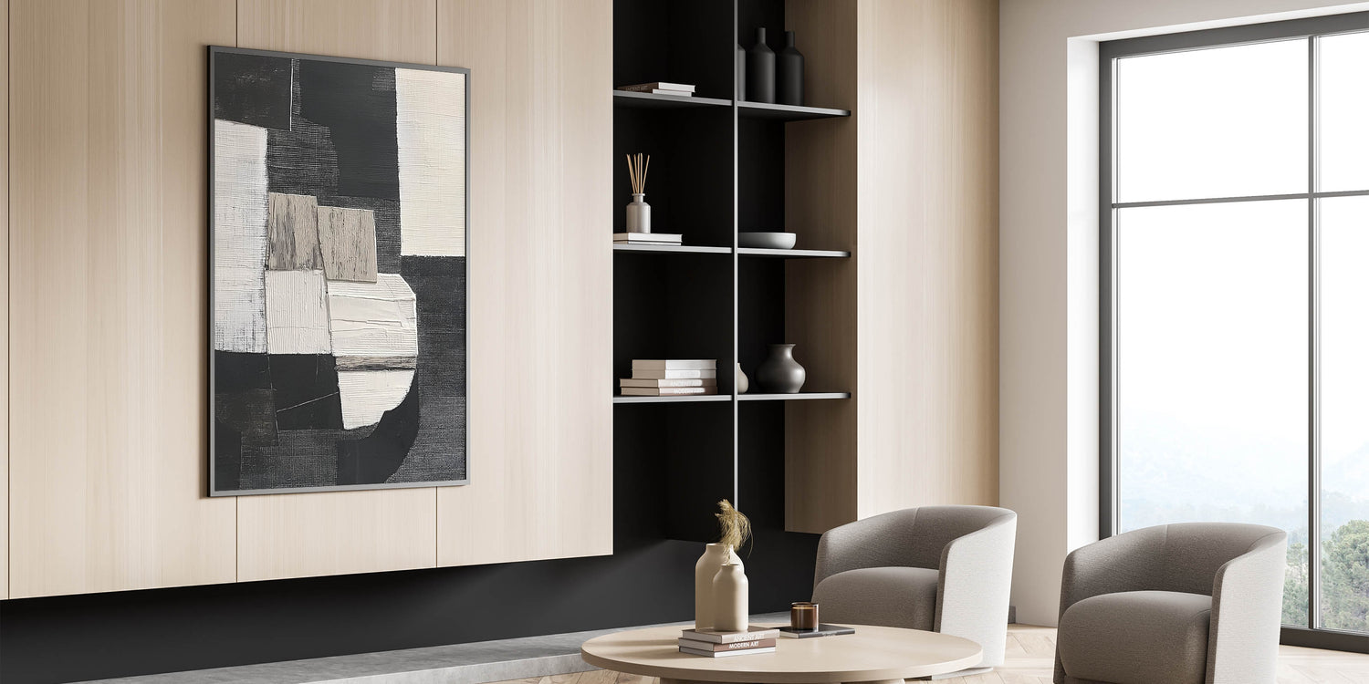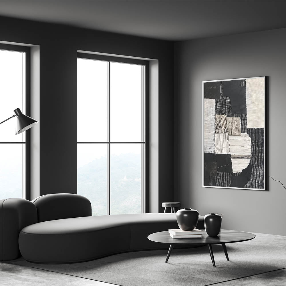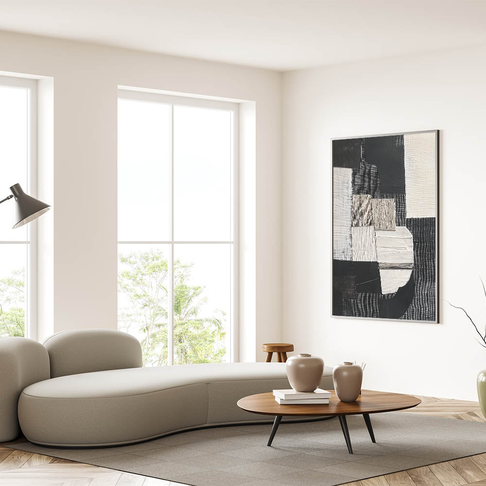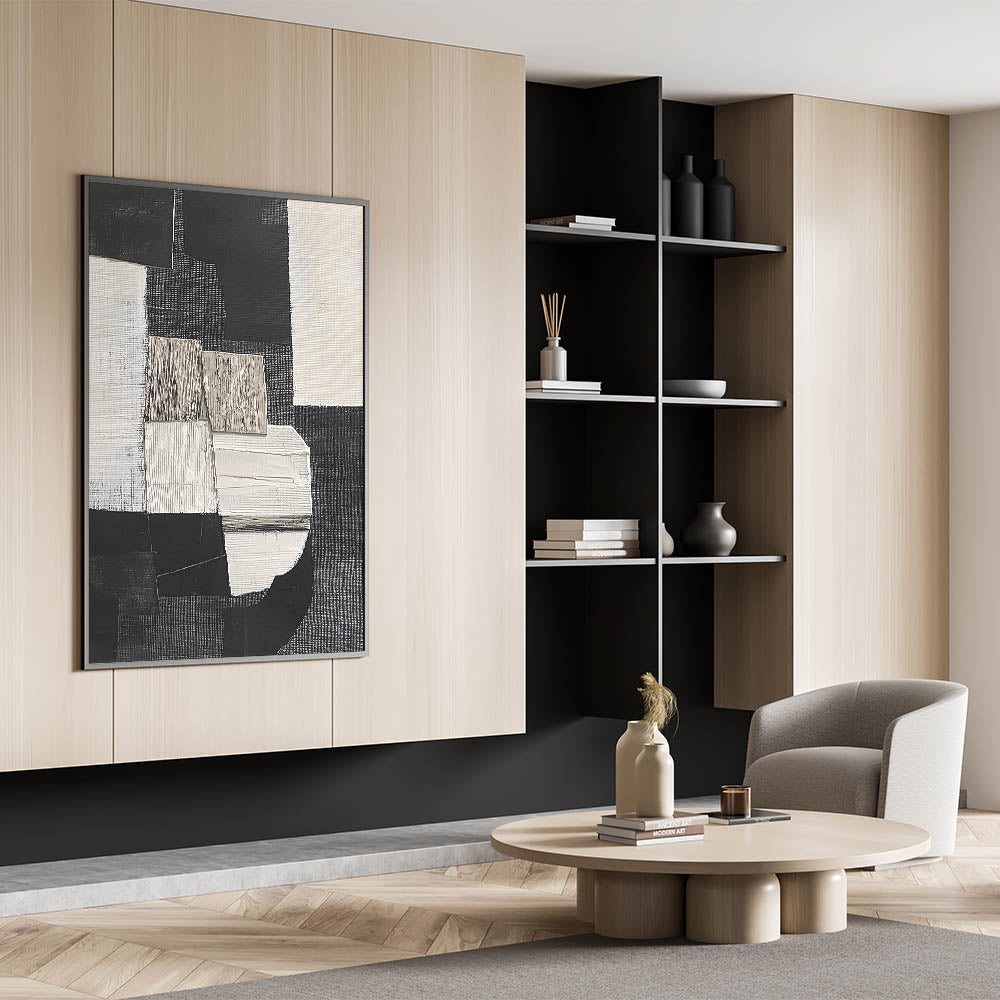 Elevate your home with this Abstract Geometric Painting, a stunning addition to your collection of geometric abstract designs. The minimalist composition showcases bold contrasts in black, white, and earthy tones, making it ideal for both contemporary and industrial interiors.
