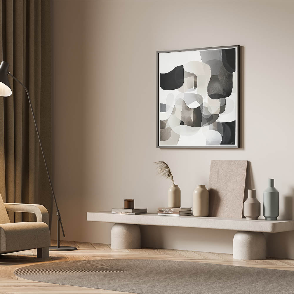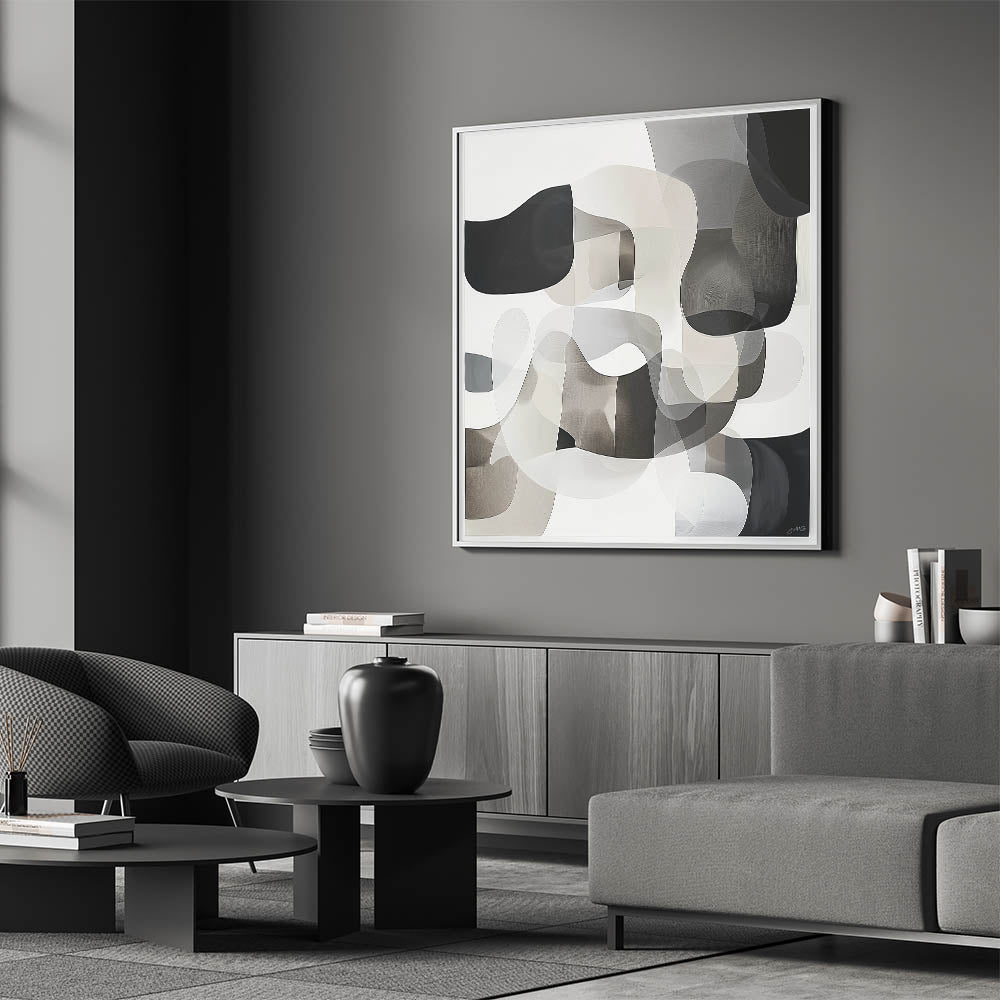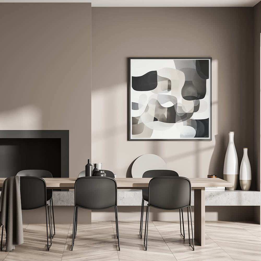 Bring modern sophistication to your space with this Geometric Abstract Wall Art. Featuring intricate geometric patterns in a dynamic palette of black, white, and gray, this artwork effortlessly blends bold contrasts with elegant curves. Perfect for modern home decor, it adds a contemporary and versatile touch to any room.