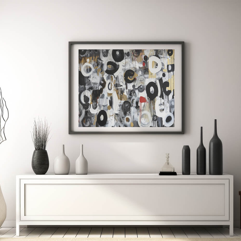 Transform your space with this Geometric Abstract Wall Art, a bold and expressive piece featuring circular forms and layered textures. The design incorporates an energetic mix of black, white, gray, and gold tones, punctuated with drips and splashes for a dynamic, modern aesthetic. Perfect for those who love geometric abstract designs, this artwork is ideal for making a striking statement in modern home decor.