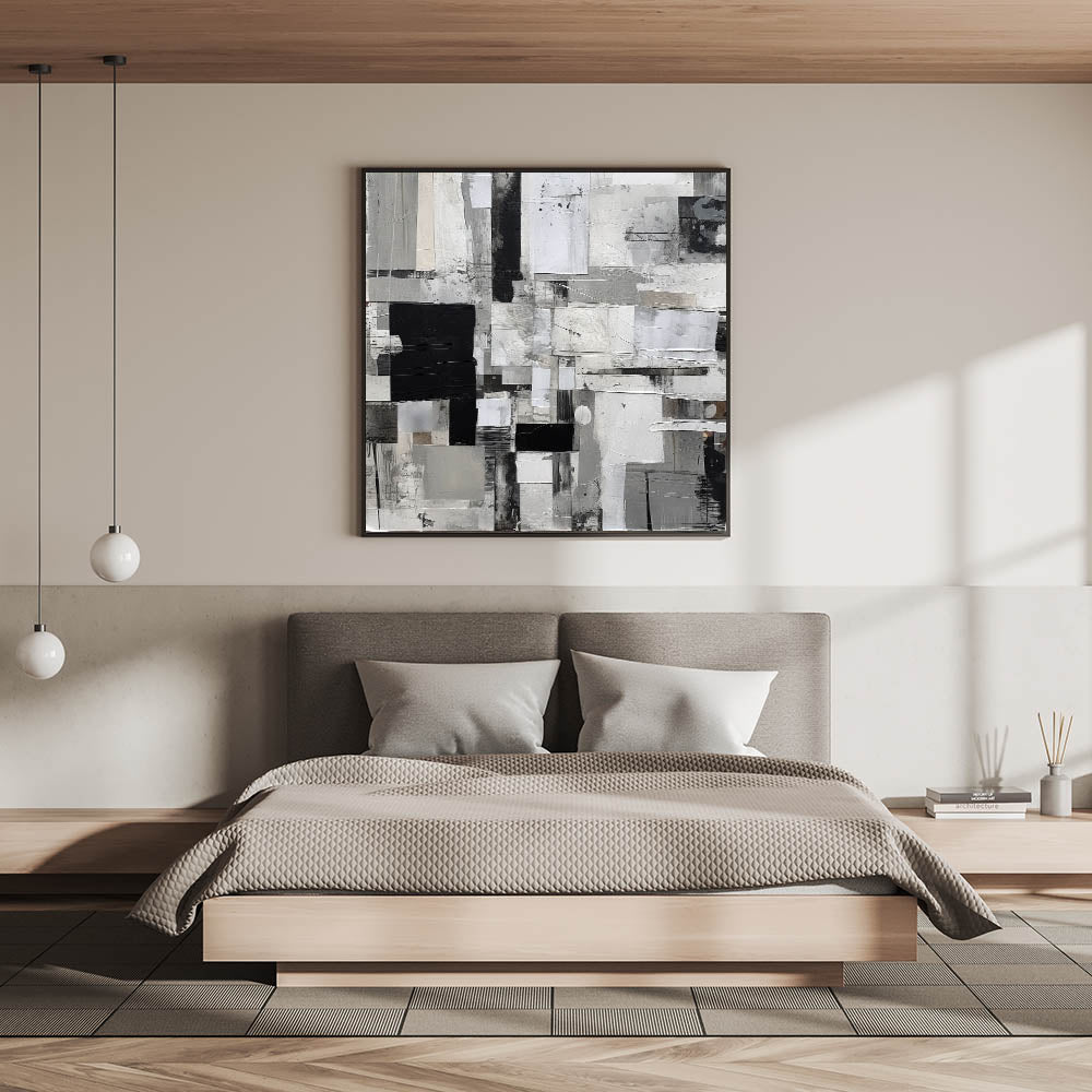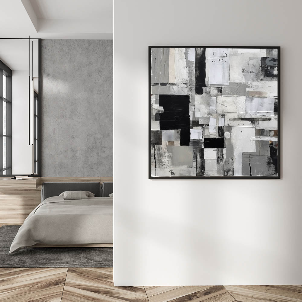 Enhance your bedroom with this modern geometric abstract wall art, featuring a sophisticated black, white, and gray palette. The collage-like composition of textured shapes creates depth and contrast, making it a perfect choice for minimalist and contemporary bedroom decor. This artwork blends abstract expressionism with structured design, making it an ideal centerpiece for modern interiors.