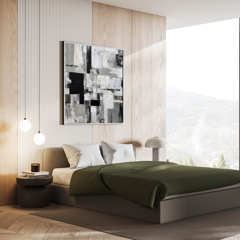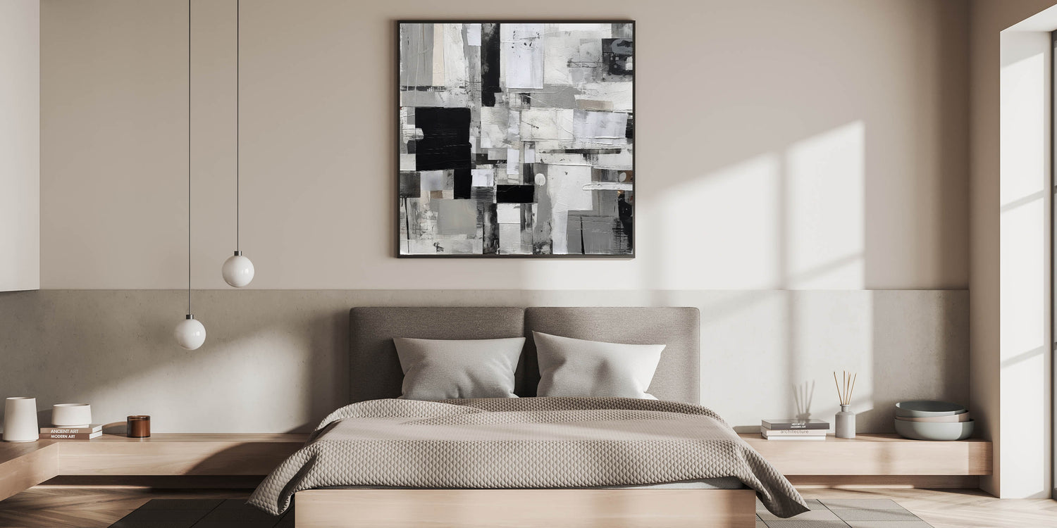 Perfect for those seeking framed bedroom art, canvas prints for bedroom spaces, or acrylic bedroom wall art, this large bedroom wall decor brings a structured yet artistic feel. Its monochrome palette and geometric patterns make it an ideal choice for modern bedroom wall decor.