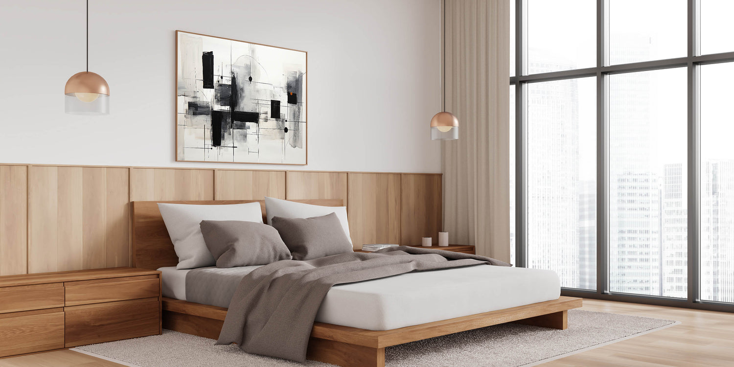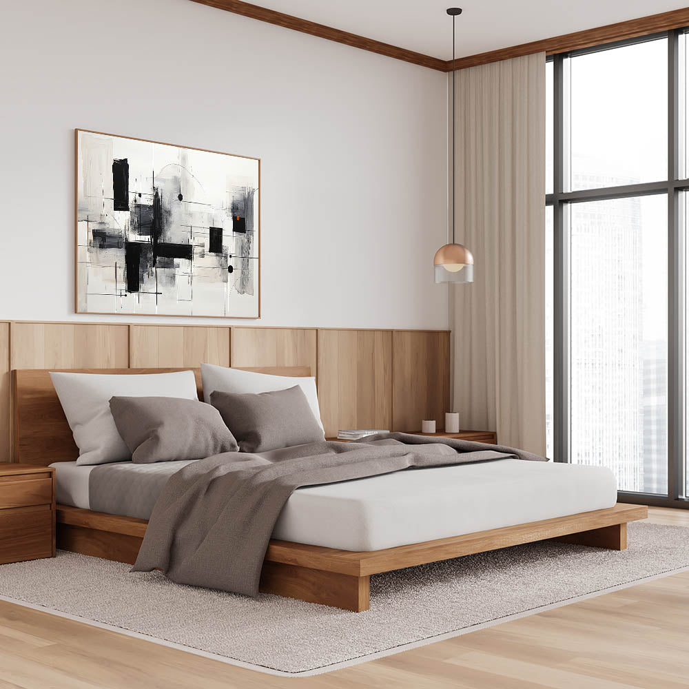 This modern bedroom art is ideal for those who appreciate clean lines and abstract compositions. Whether you prefer acrylic bedroom wall art or rolled canvas bedroom art, this design provides a contemporary aesthetic to suit various interior styles.