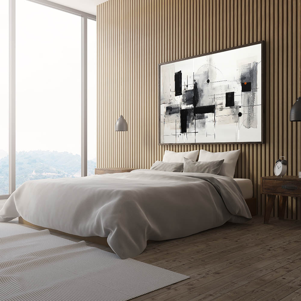 Elevate your bedroom decor with this geometric black and white abstract wall art, featuring a dynamic composition of lines, blocks, and subtle orange accents. This modern artwork is designed to bring balance, movement, and sophistication to your space, making it a perfect choice for customizable bedroom wall art.