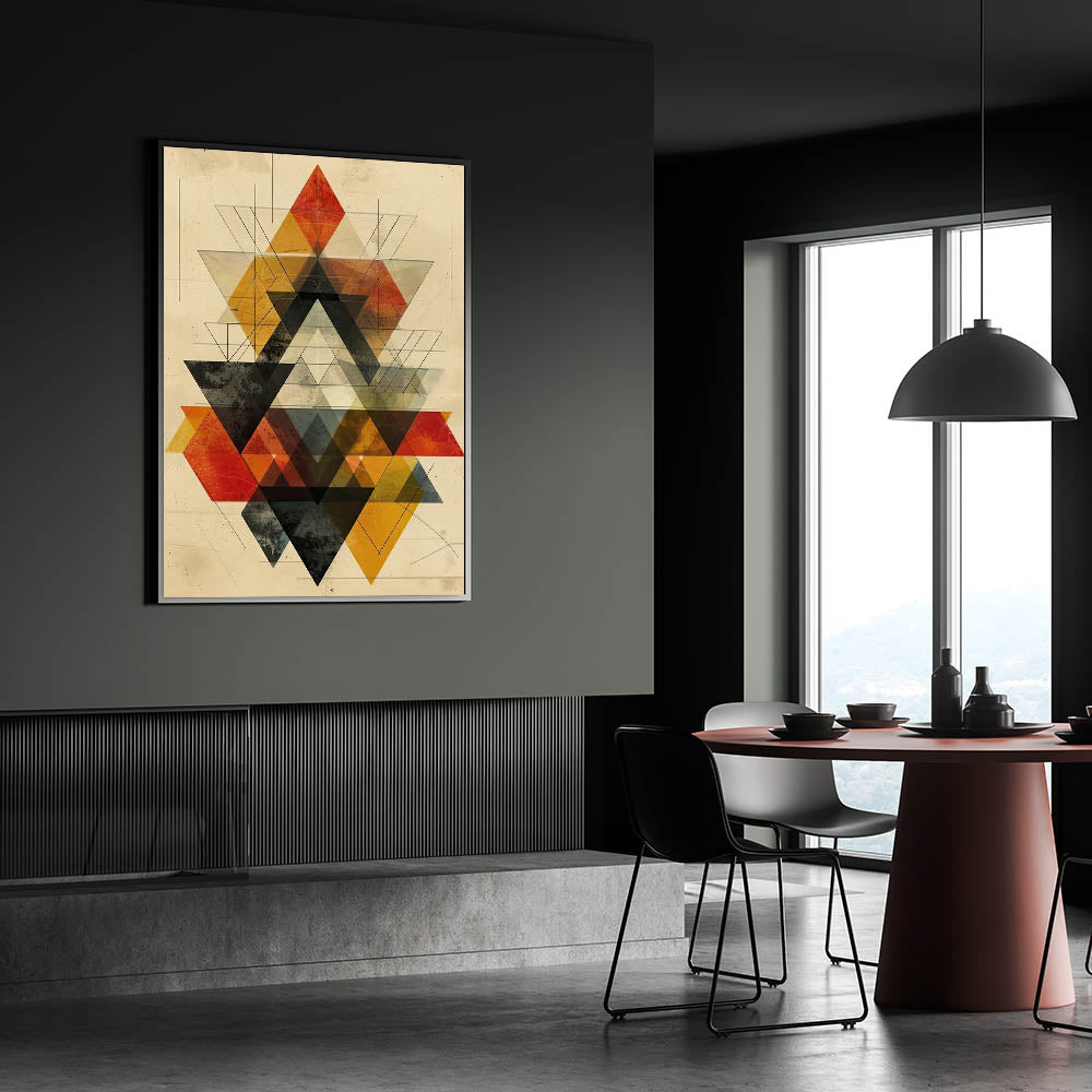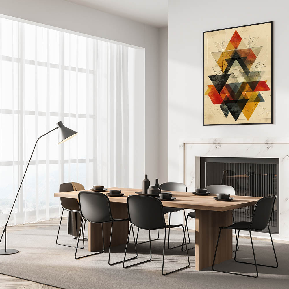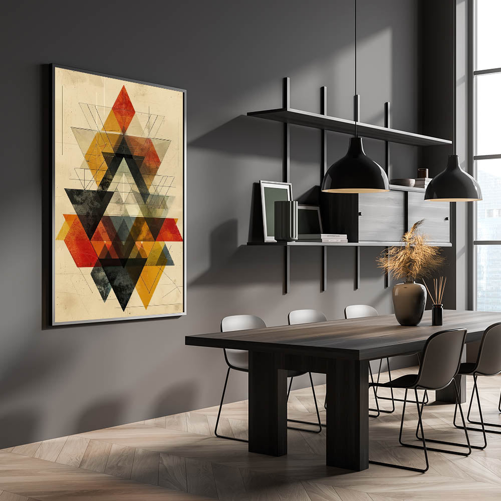 Enhance your dining space with this elegant dining room wall art, featuring a striking geometric design in warm hues of black, gold, orange, and red. Perfect for contemporary interiors, this modern dining room art blends abstract elements with precise lines, creating a visually engaging piece that complements a stylish dining setting.