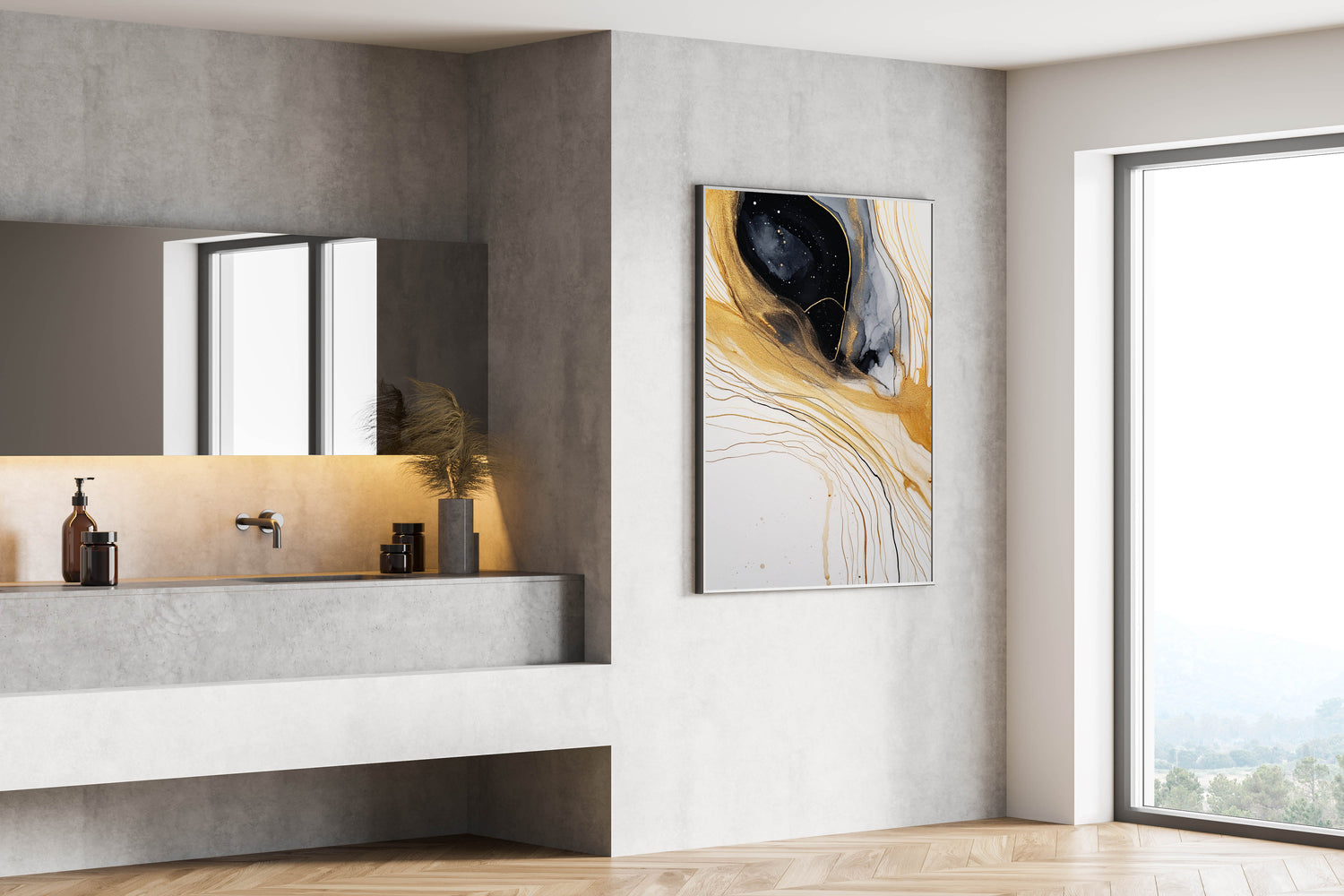 Elevate your décor with this Gold and Black Abstract Art piece, showcasing fluid, shimmering strokes that flow elegantly across the canvas. The dynamic combination of gold and black ink against a crisp white background creates a stunning visual contrast, giving the artwork a sense of luxury and depth. The intricate lines and swirling patterns evoke a cosmic, dreamlike atmosphere, making it an exquisite statement piece.