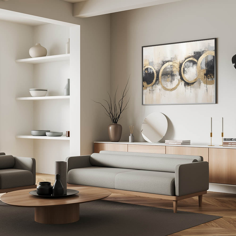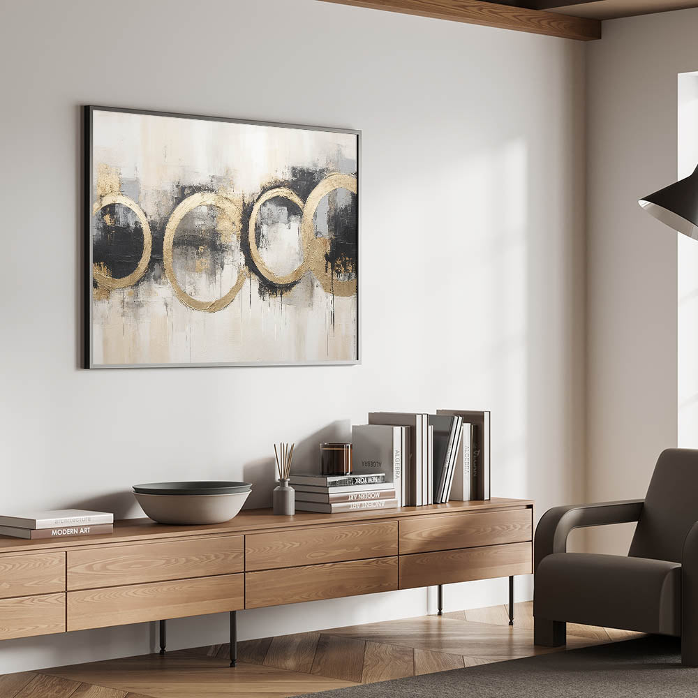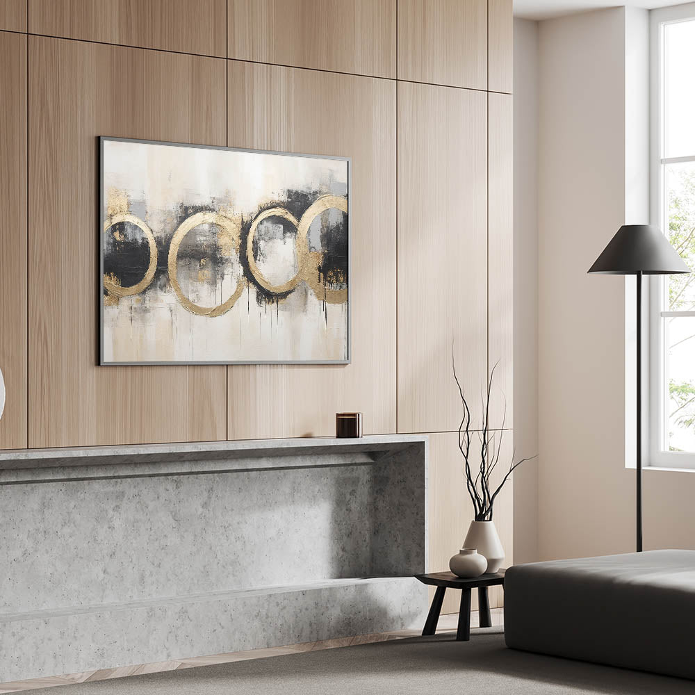 Gold Circles Abstract Art - Modern Monochrome Canvas with Metallic Accents