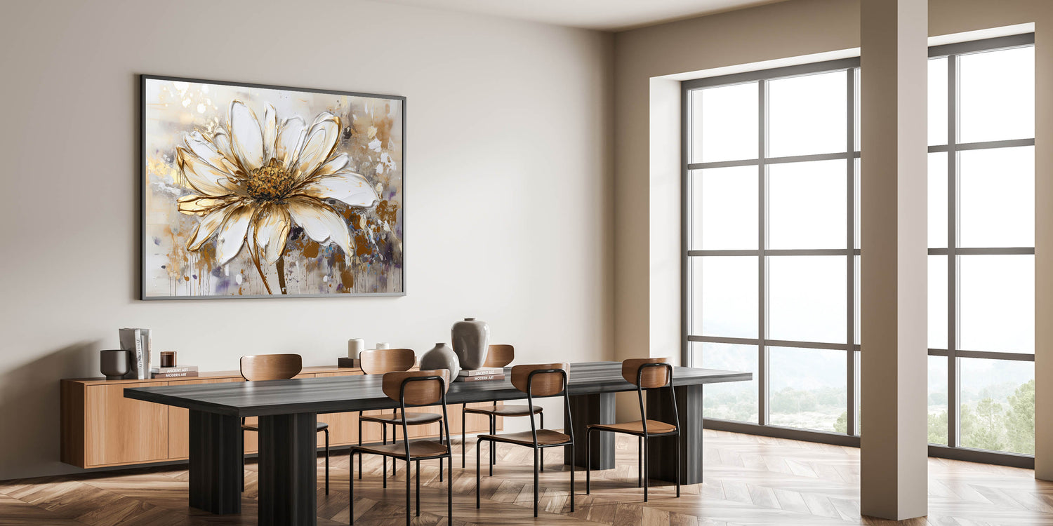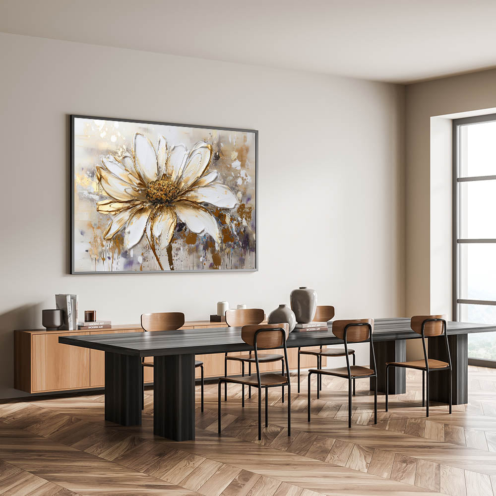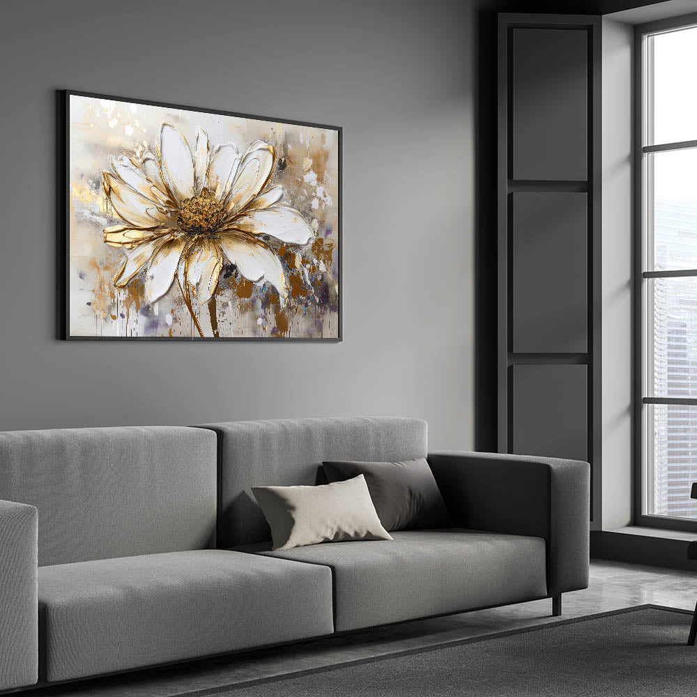 Enhance your décor with this breathtaking abstract daisy wall art, featuring a radiant white and gold flower with rich metallic textures. The delicate brushstrokes and dynamic splashes of color create a contemporary yet timeless appeal, making it a perfect wall art for living room spaces. The warm golden tones contrast beautifully with the soft white petals, bringing elegance and sophistication to any setting.