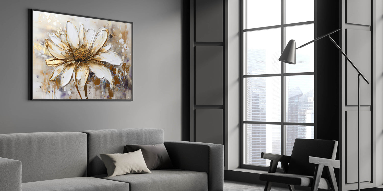 This contemporary art print is perfect for adding a luxurious and artistic touch to your home. Whether displayed as large canvas art or a framed art print, this golden daisy will bring a radiant, elegant charm to any space.